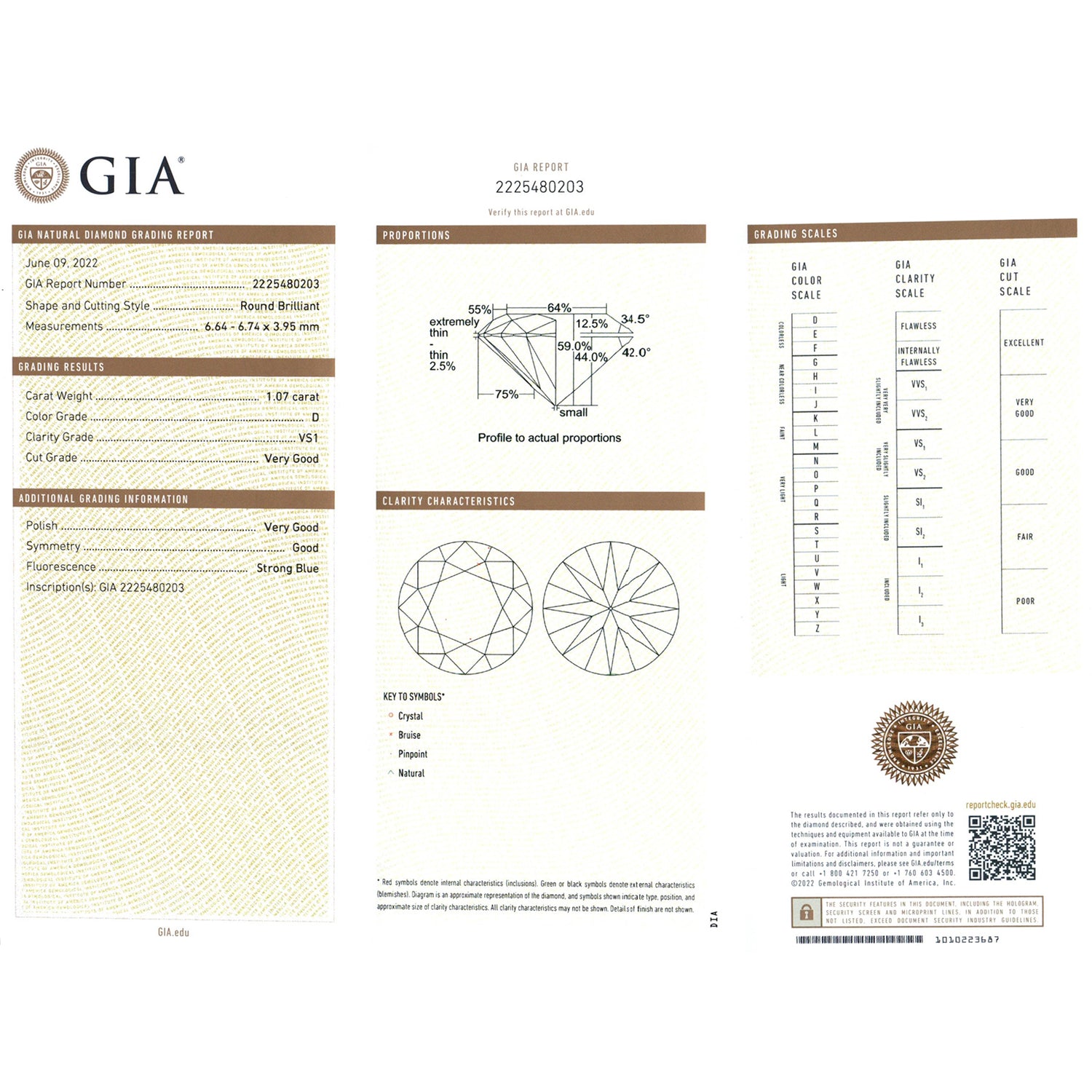 Stones: 1.07 carat D color, VS1 clarity diamond