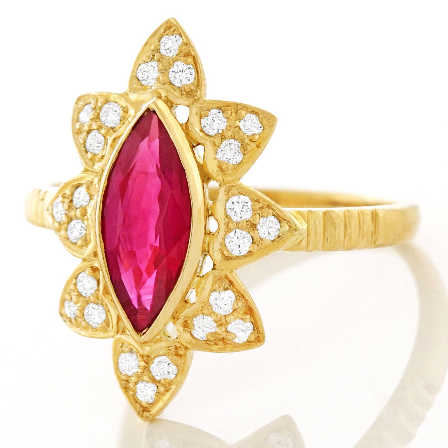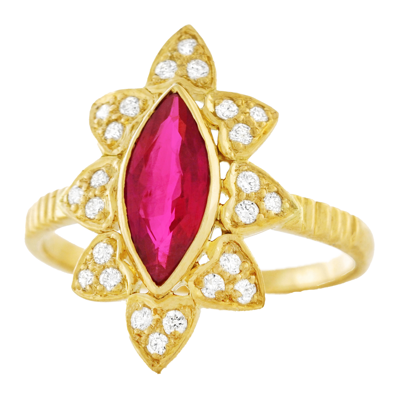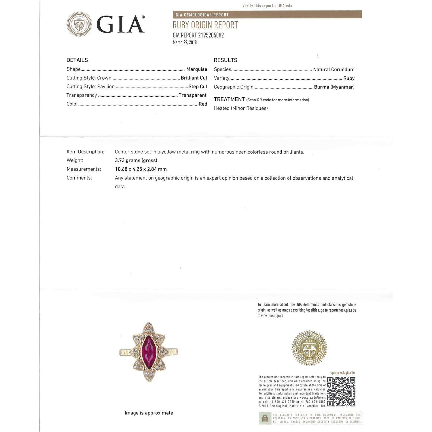 Circa 1980s, 14k, attributed India. Set with a fine 1.11-carat navette-shaped Burma ruby (GIA), surrounded by superb diamonds, this elegant Mogul ring easily dresses up or down. Indian design is the wellspring for Bohemian style, and nothing is more chic than an original. Well-made, this vibrant jewel is comfortable to wear and in very good condition.