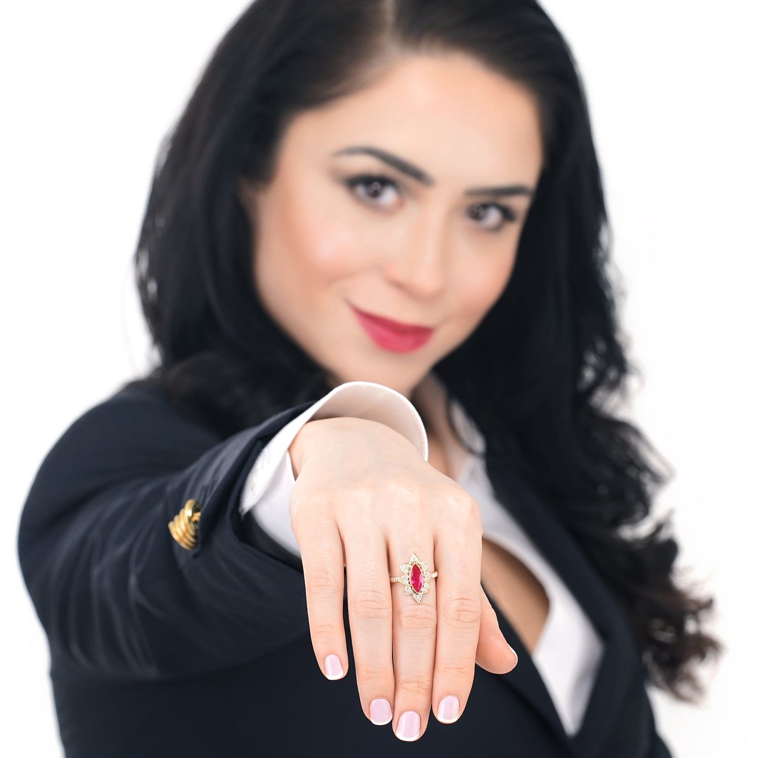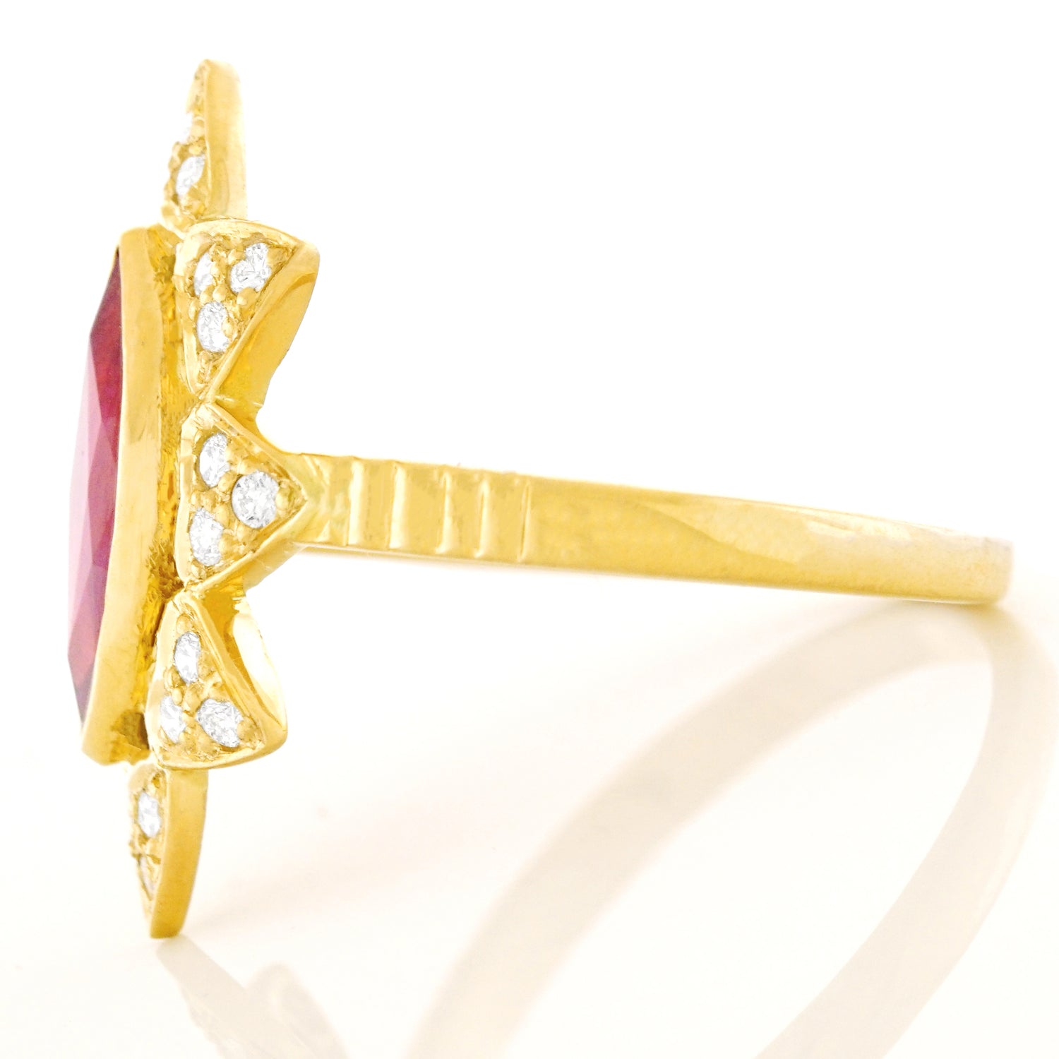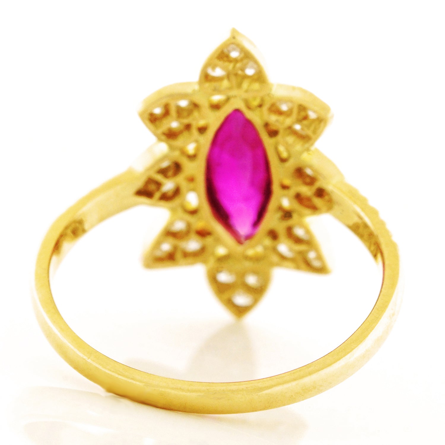 Circa 1980s, 14k, attributed India. Set with a fine 1.11-carat navette-shaped Burma ruby (GIA), surrounded by superb diamonds, this elegant Mogul ring easily dresses up or down. Indian design is the wellspring for Bohemian style, and nothing is more chic than an original. Well-made, this vibrant jewel is comfortable to wear and in very good condition.