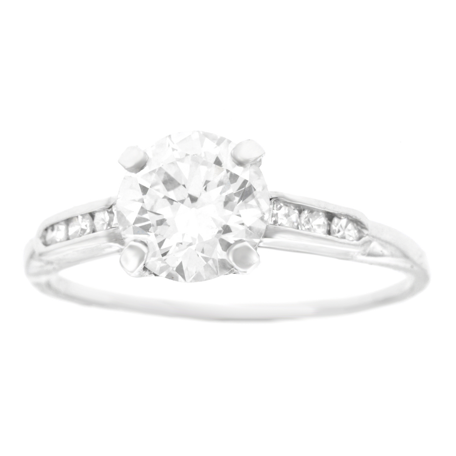 Circa 1930s, Platinum, American.    This Art Deco engagement ring features a 1.28 carat I color, SI1 clarity diamond set with .12 carats of accent stones. The platinum mounting is well-made and displays a wonderfully sleek twenties look. Excellent condition.