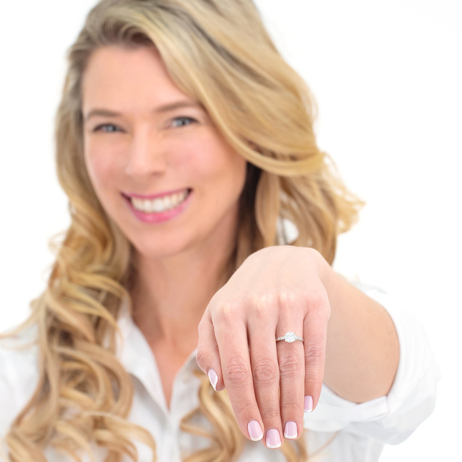 Stones: 1.28 carat diamond of I color, SI1 clarity, and .12 carats total weight of H color, VS1-2 clarity additional diamonds = 1.40 carats total weight