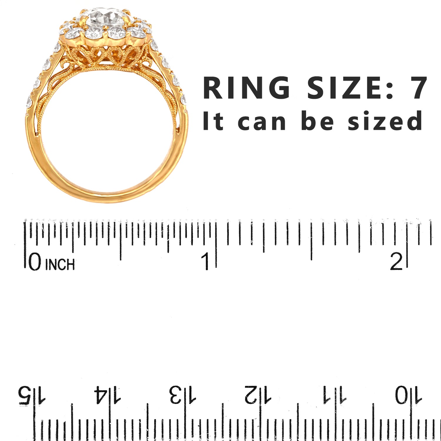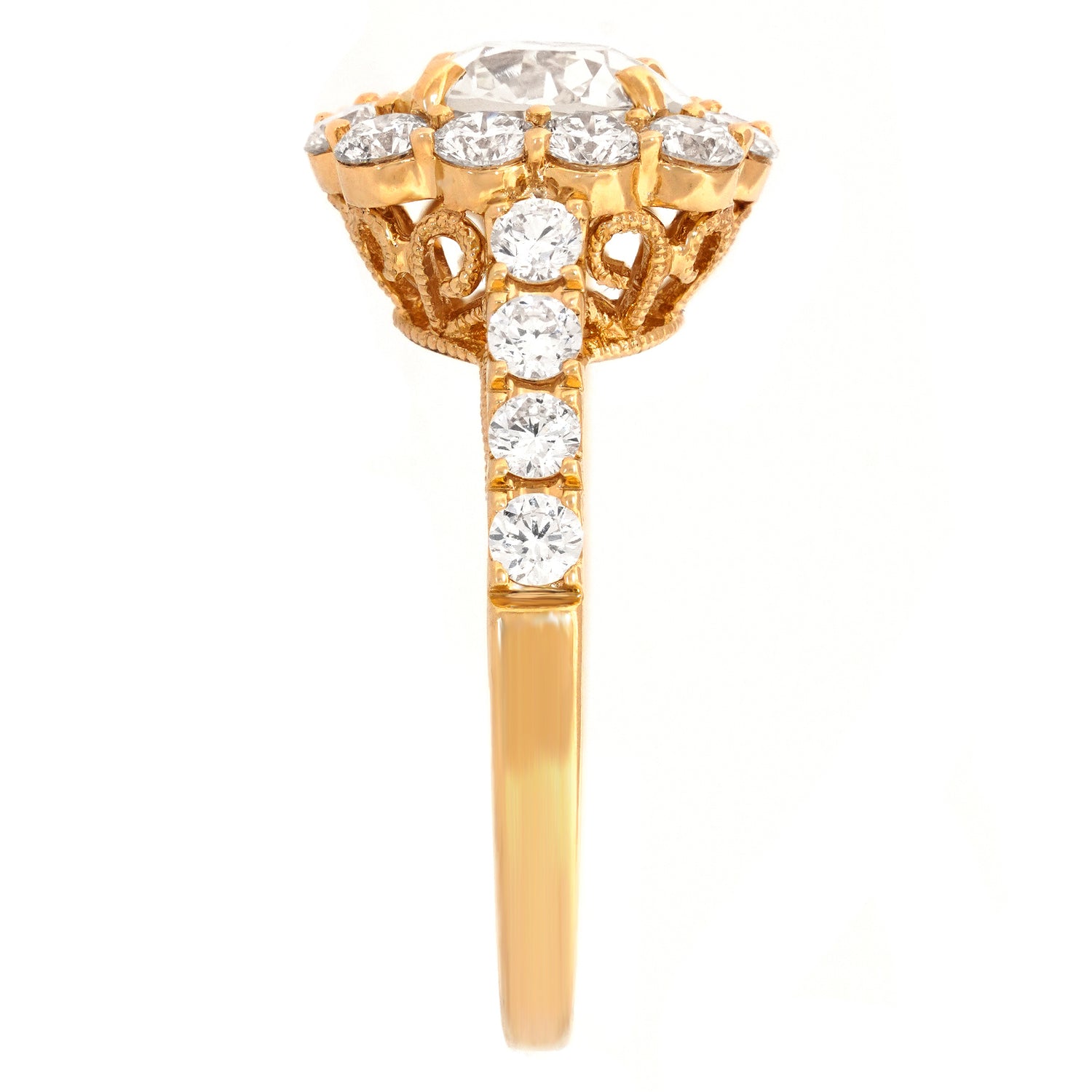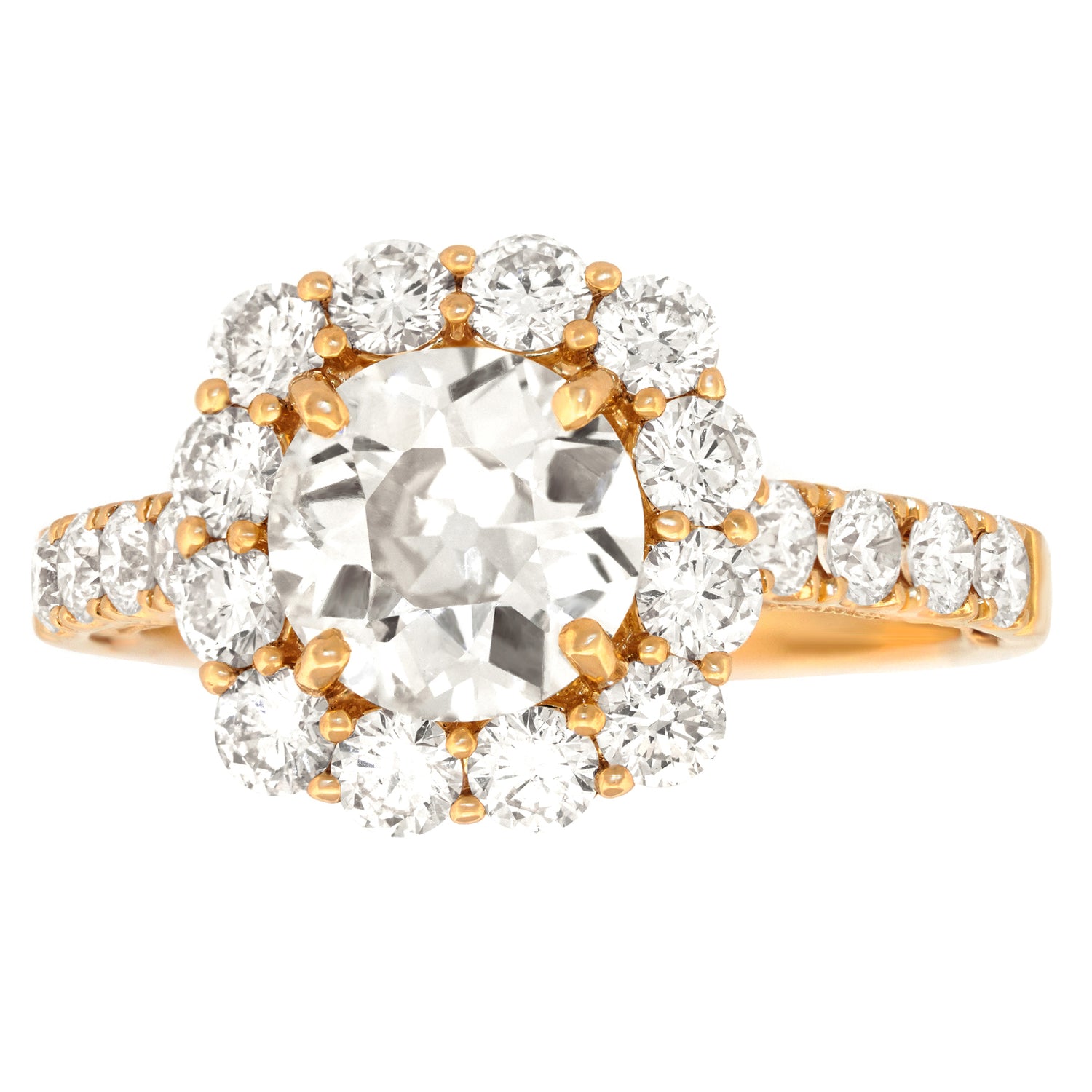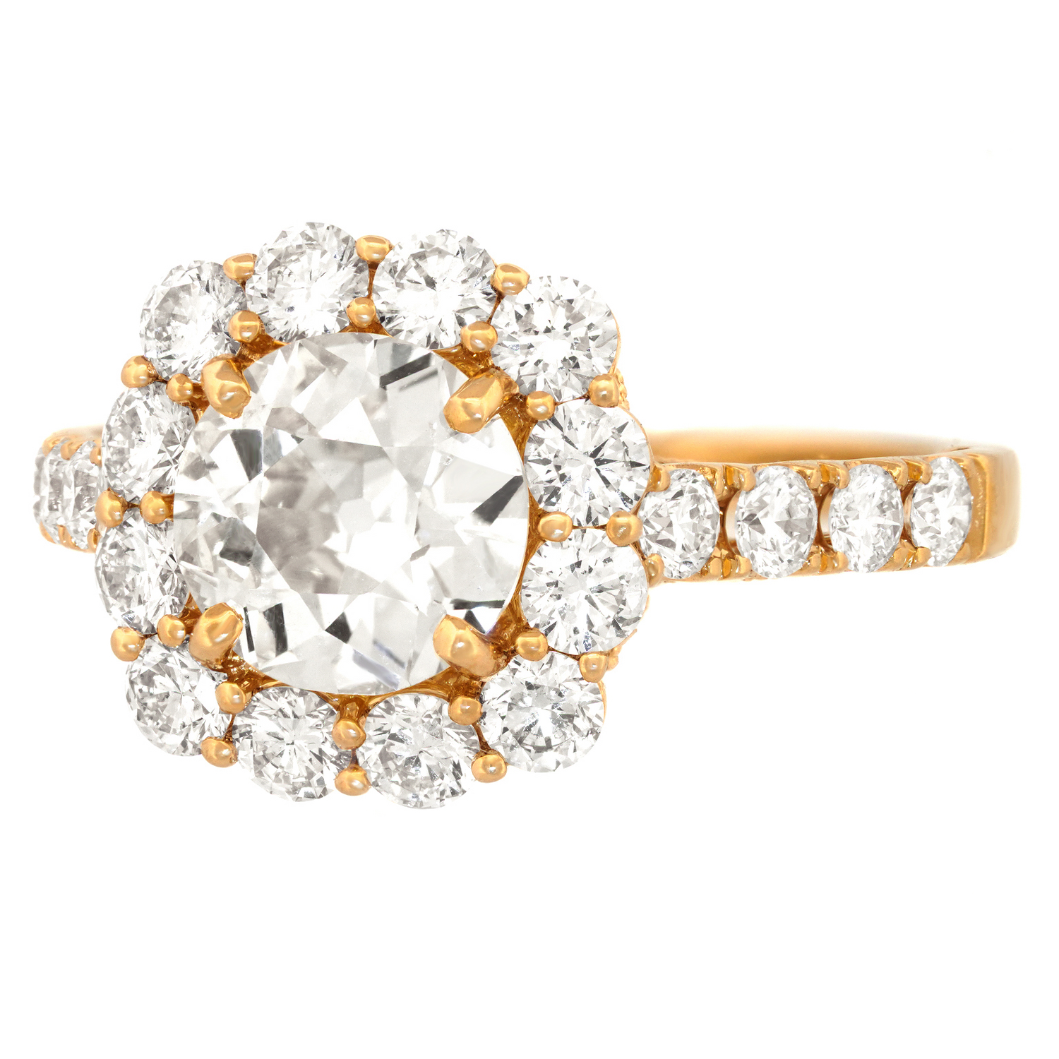 Circa 2000s/c1920s, 18k, American.  This robust diamond ring features a very sparkly 1.53-carat old European-cut center diamond (N color, VS1 clarity GIA report) elegantly surrounded by 1.30 carats of brilliant white accent diamonds (F color, VS clarity). Feminine, timeless, stylish, and very beautiful, this ring always makes us smile.  Excellent condition.
