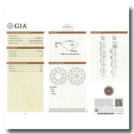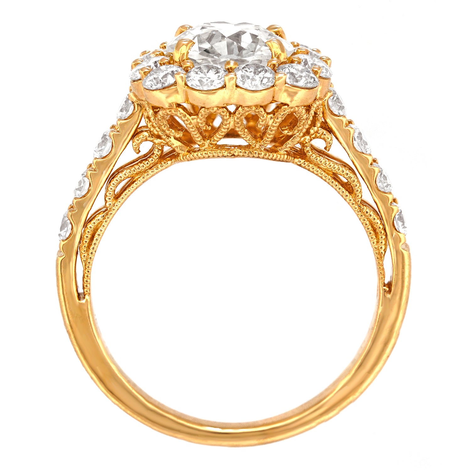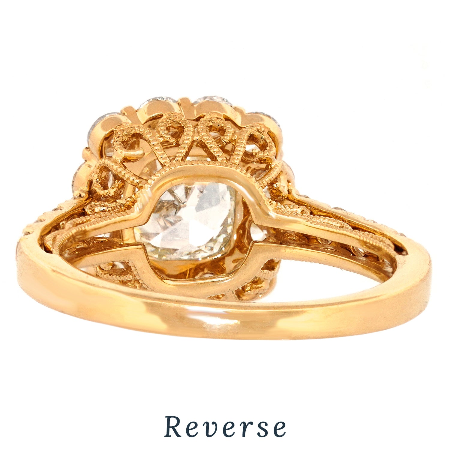 Stones: 1.53 carat N color, VS1 clarity Old European-cut diamond, and 1.30 carats of F color, VS clarity additional diamonds, 2.83 carats total weight.