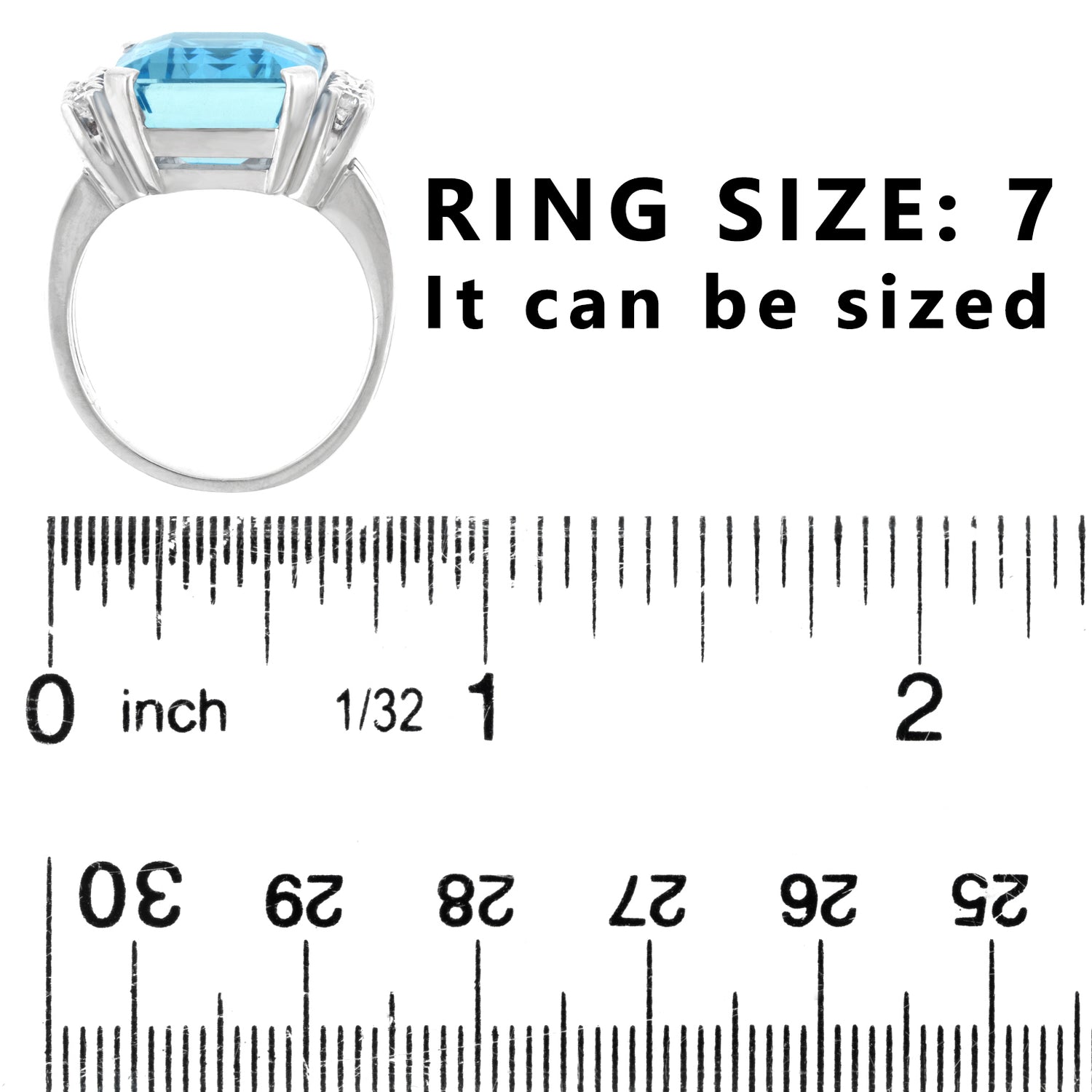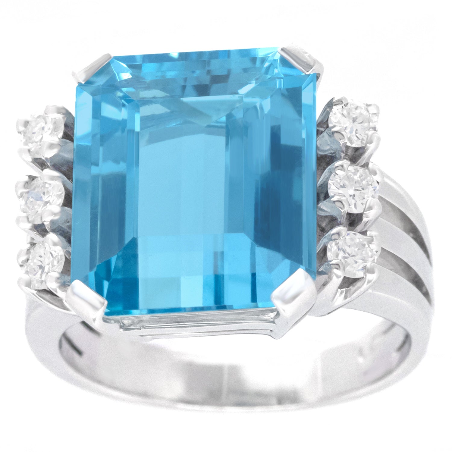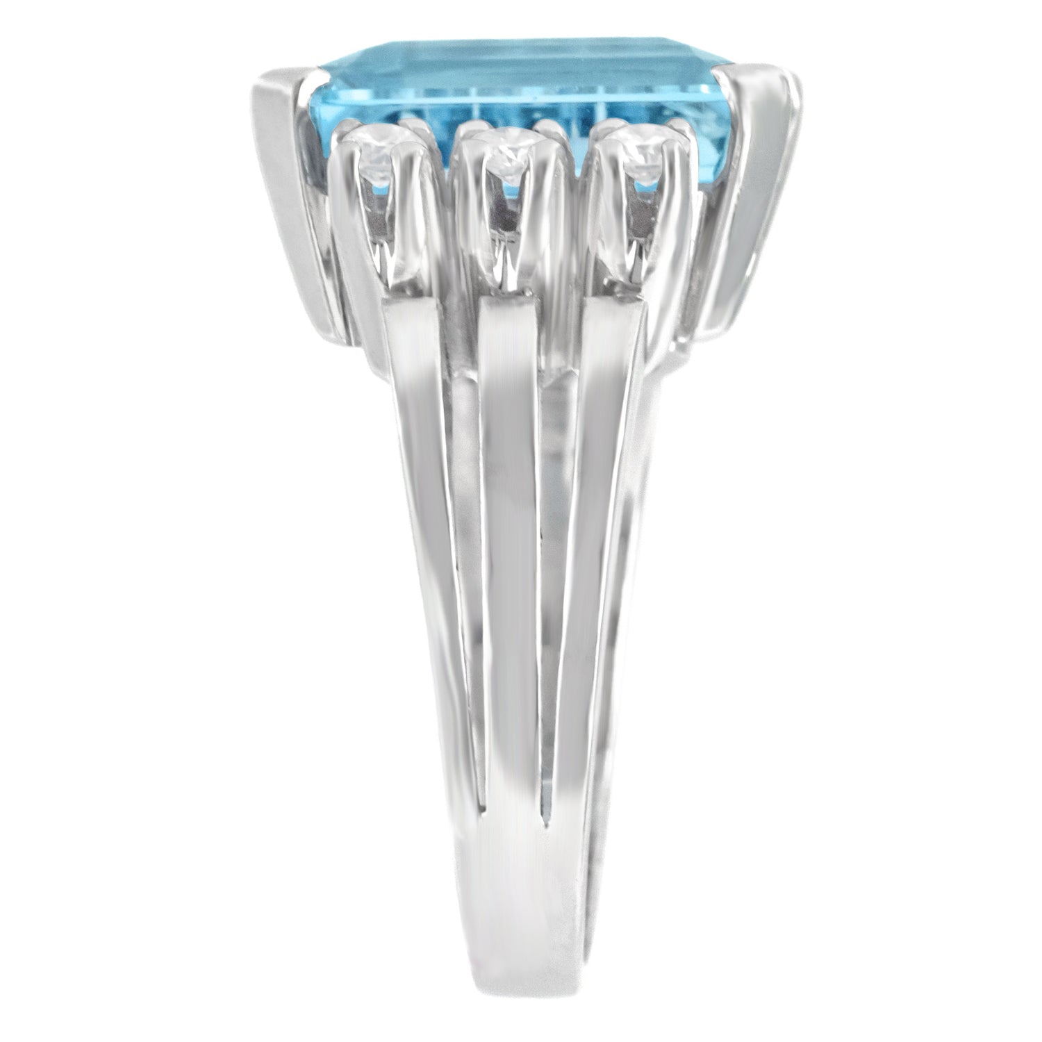 Circa 1960s, 18k, Switzerland. This gorgeous sixties ring is set with a fine deep blue 10.0-carat aquamarine framed by six brilliant white diamonds (H color, SI1 clarity). Its refined Swiss modern styling is sleek and sophisticated. Meticulously fabricated in 18k white gold, this fabulous ring is in excellent condition.