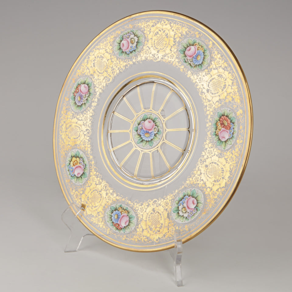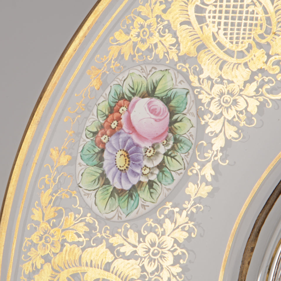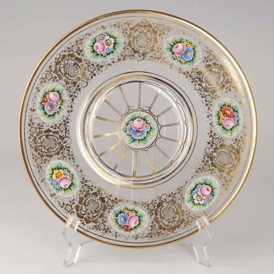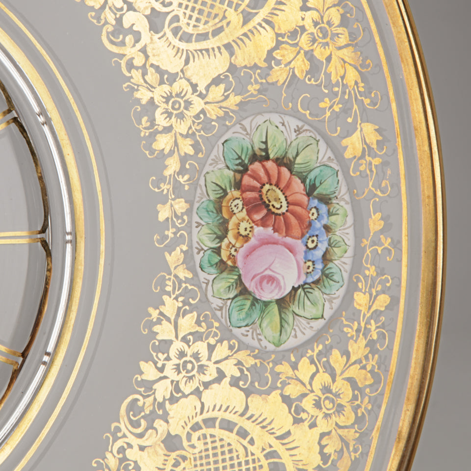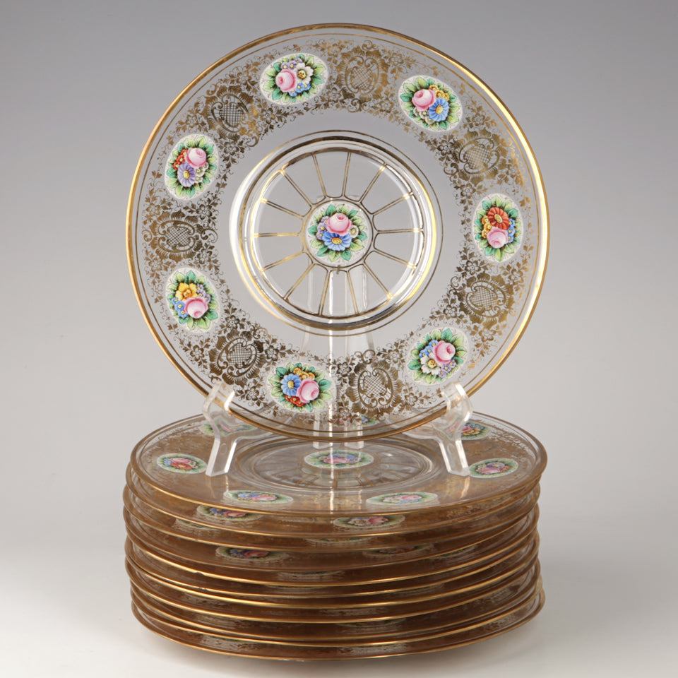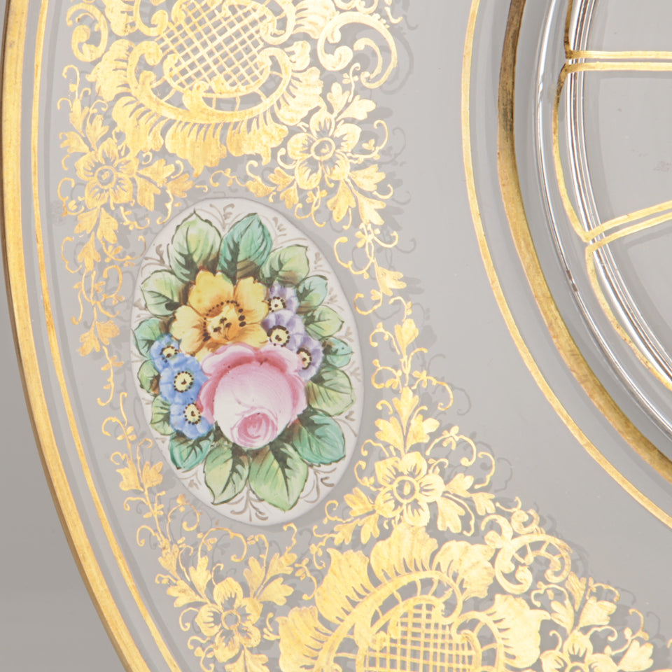 Circa 1890-1910, Moser, Austria. These antique Moser chargers are decorated with baroque motif gilding interspersed with enameled bouquets. A rare set of 12 plates from Austria's pre-eminent maker of Art glass and crystal. Excellent condition.