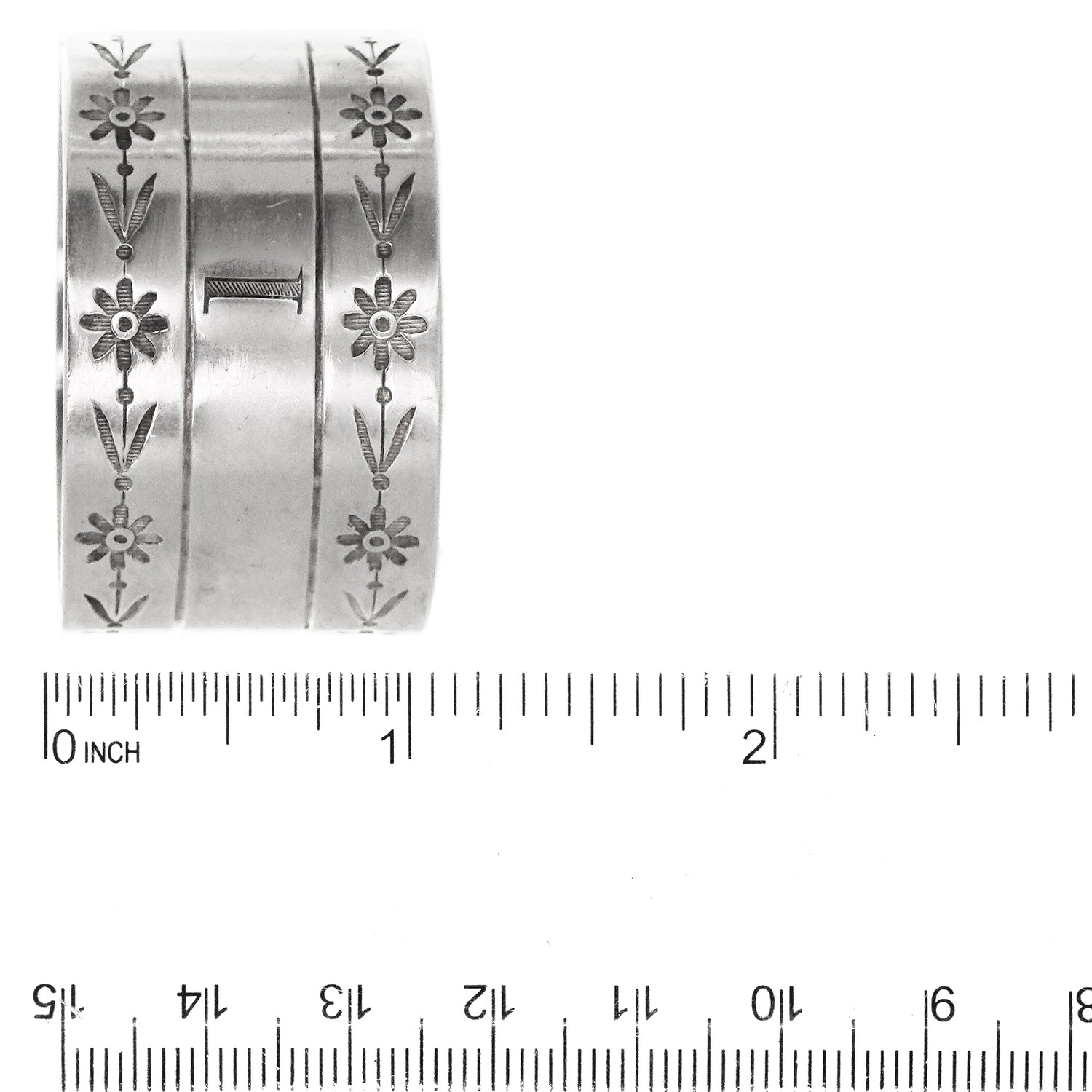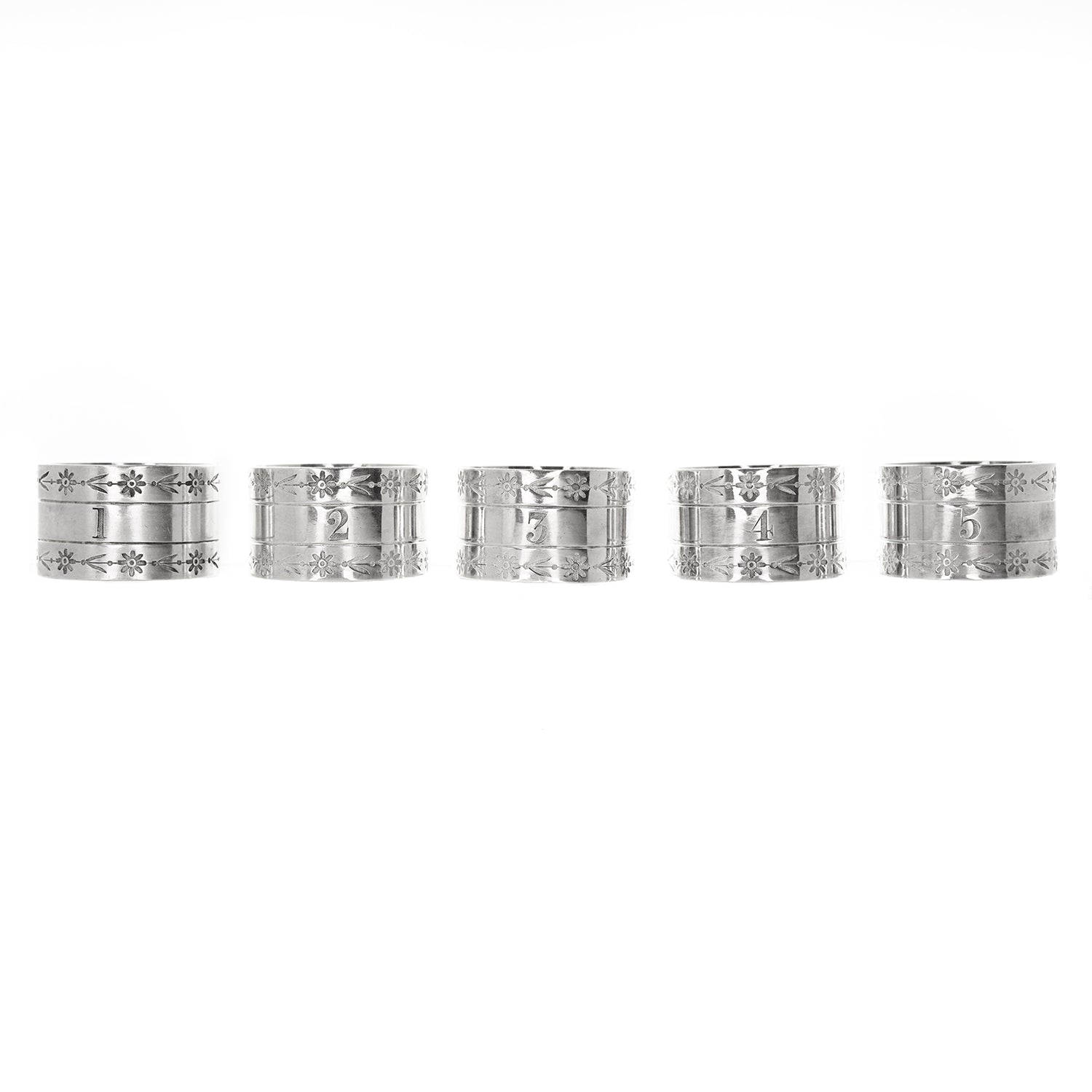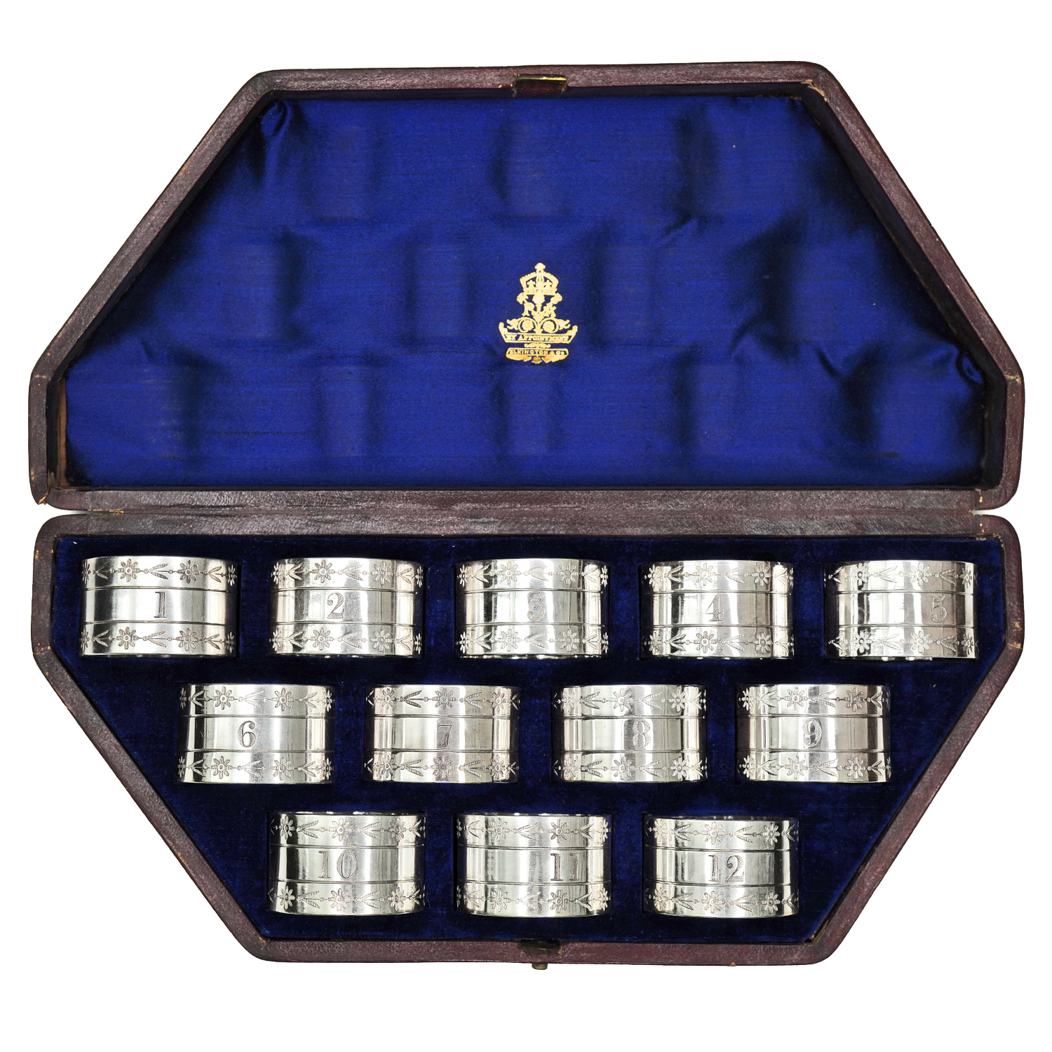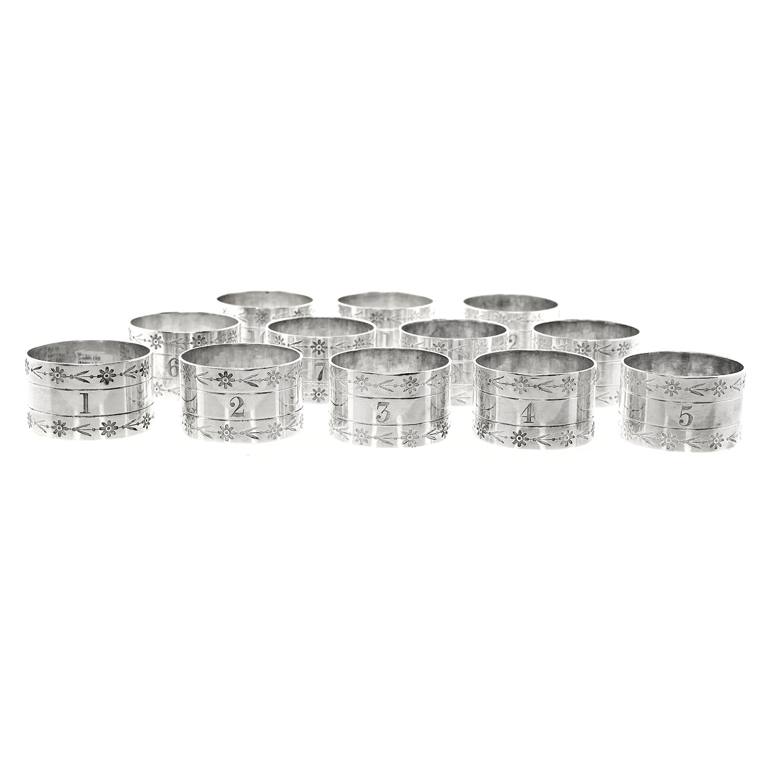 Circa 1849, Silver-plate, by Elkington & Co., Birmingham, England. Found in their original box, this gorgeous set of silver-plate napkin rings by the esteemed British Silver company, Elkington & Co, feature hand engraved bright cut flower decorations. They are also numbered 1 through 12. Excellent condition.