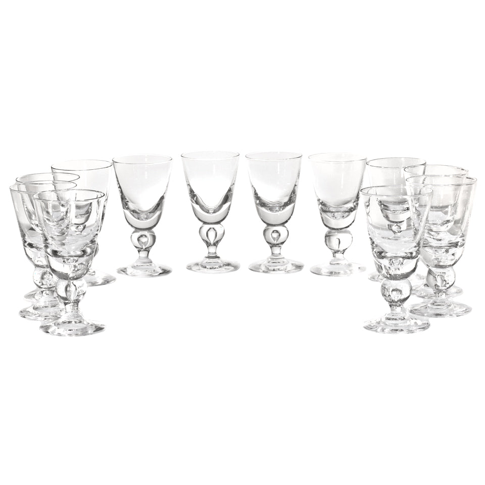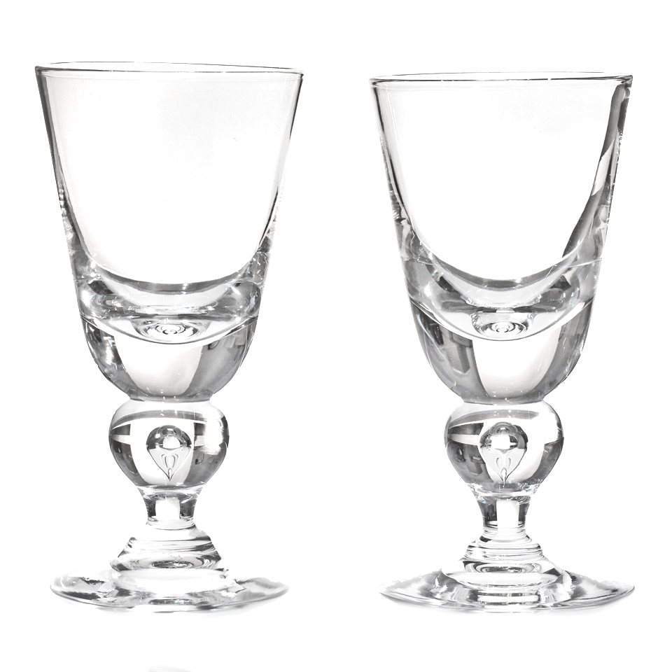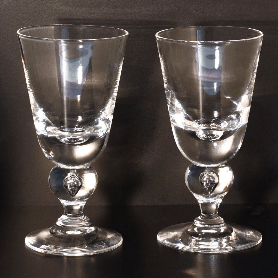 Circa 1940, by the Steuben Glass Works, Corning, NY. Known as the #7877 baluster stem, this is the most coveted of all modernist glasses. Intended as a water glass, today these goblets find more usage as wine goblets. This George Thompson design is perfectly balanced, deliciously heavy in the hand, and visually pleasing, while conspicuously modern. Excellent condition.