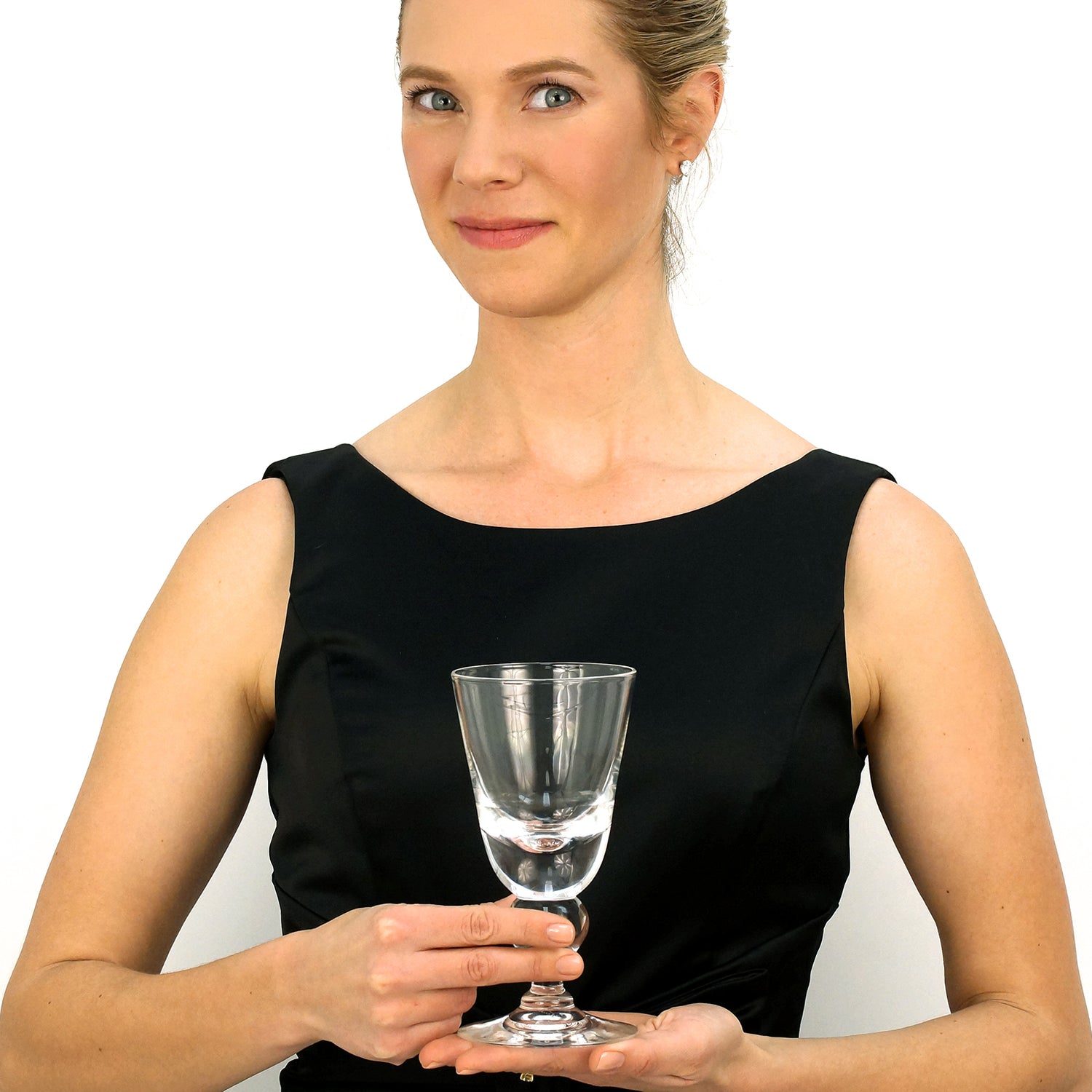 Circa 1940, by the Steuben Glass Works, Corning, NY. Known as the #7877 baluster stem, this is the most coveted of all modernist glasses. Intended as a water glass, today these goblets find more usage as wine goblets. This George Thompson design is perfectly balanced, deliciously heavy in the hand, and visually pleasing, while conspicuously modern. Excellent condition.