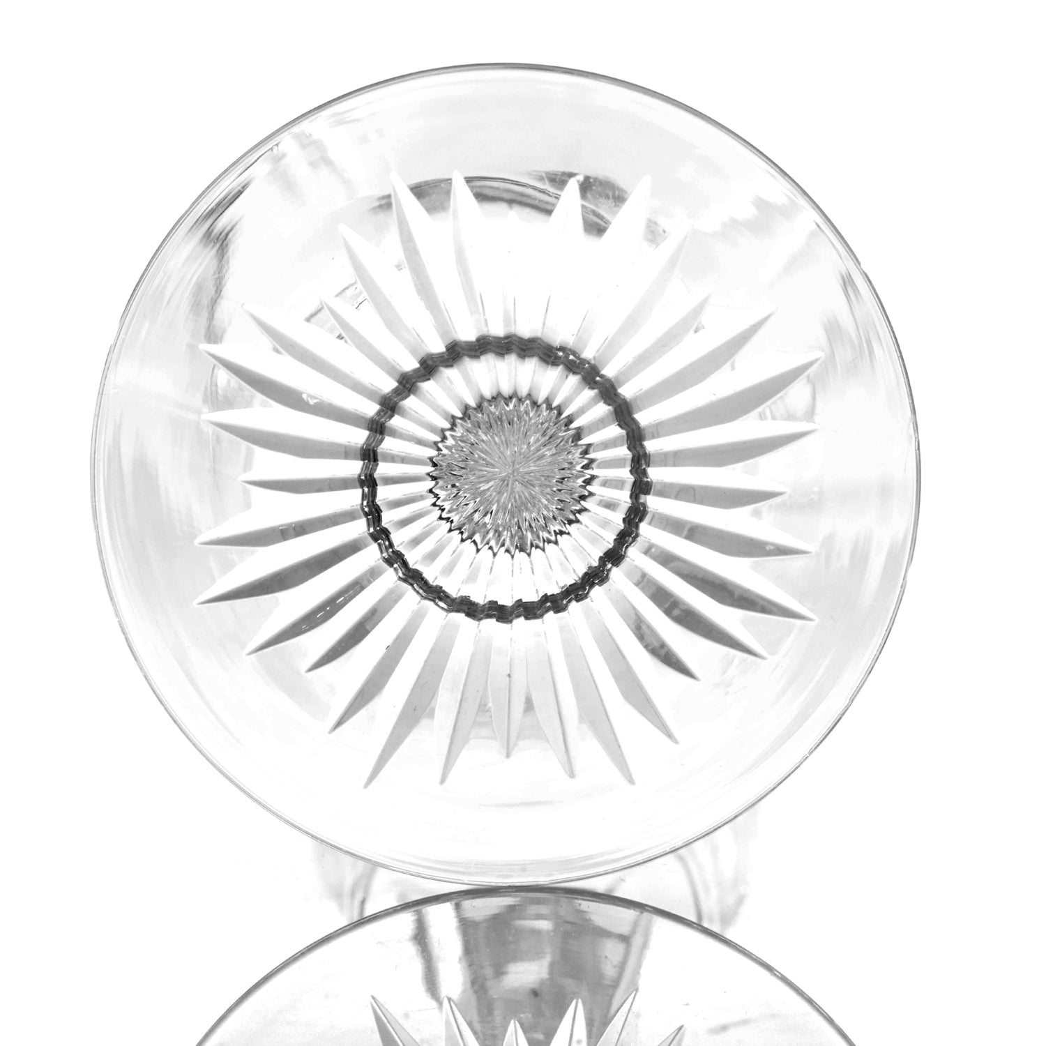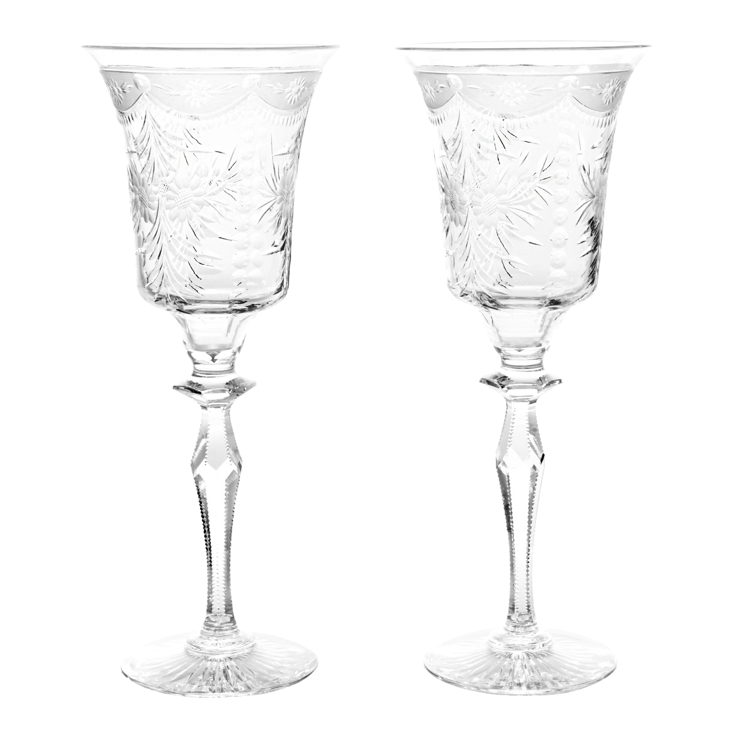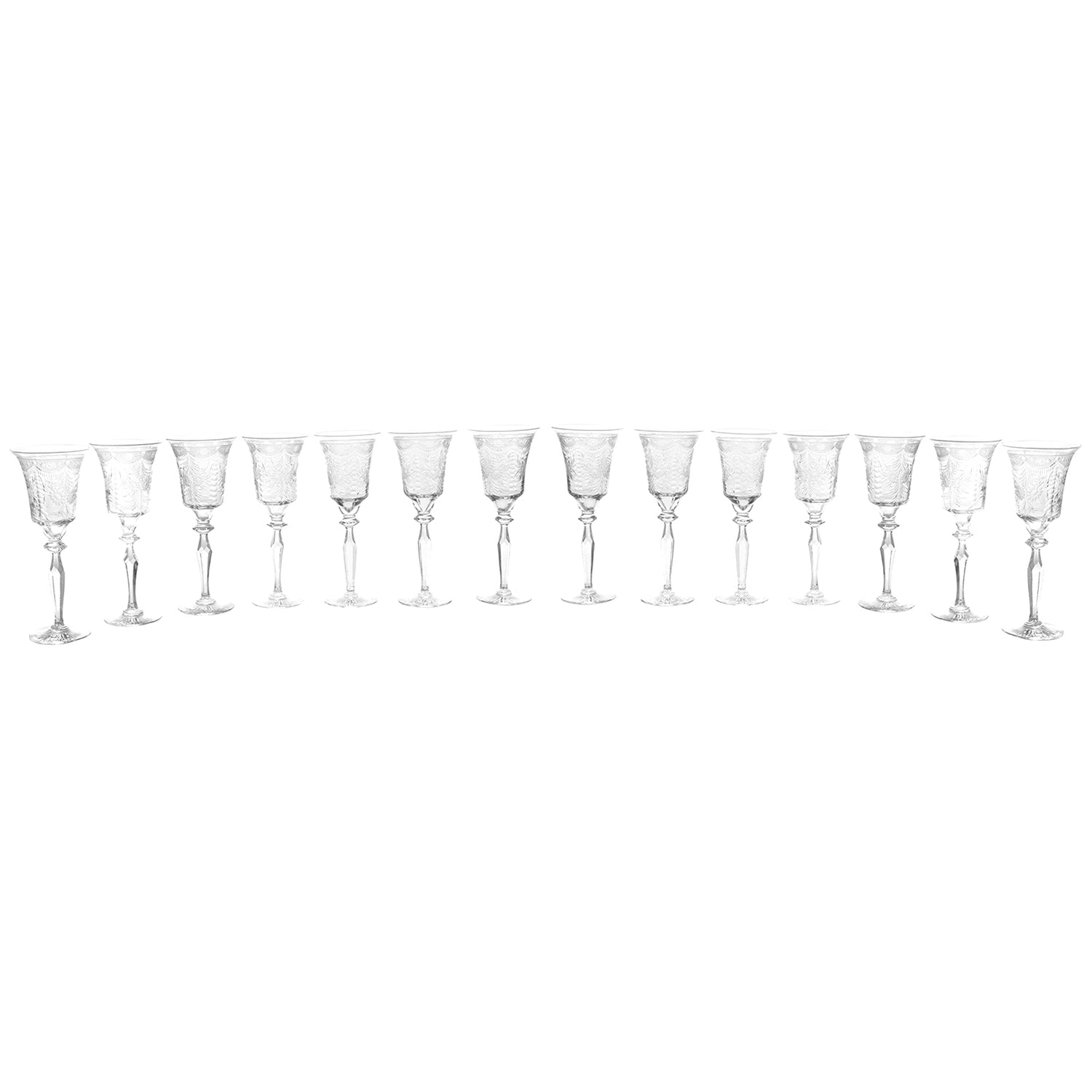 Circa 1930s, by Pairpoint, American. These sublime extra-tall crystal water goblets set a spectacular table! Their dramatic silhouette, long elegant stem, and intricately-cut design feature details that are delightfully charming and sharply executed. This set of 12, plus 2 extras for a total of 14, demonstrates the quality Pairpoint was known for. Well-balanced and comfortable to hold, they are great for water, perfect for wine, and a pleasure to drink from. Excellent condition.