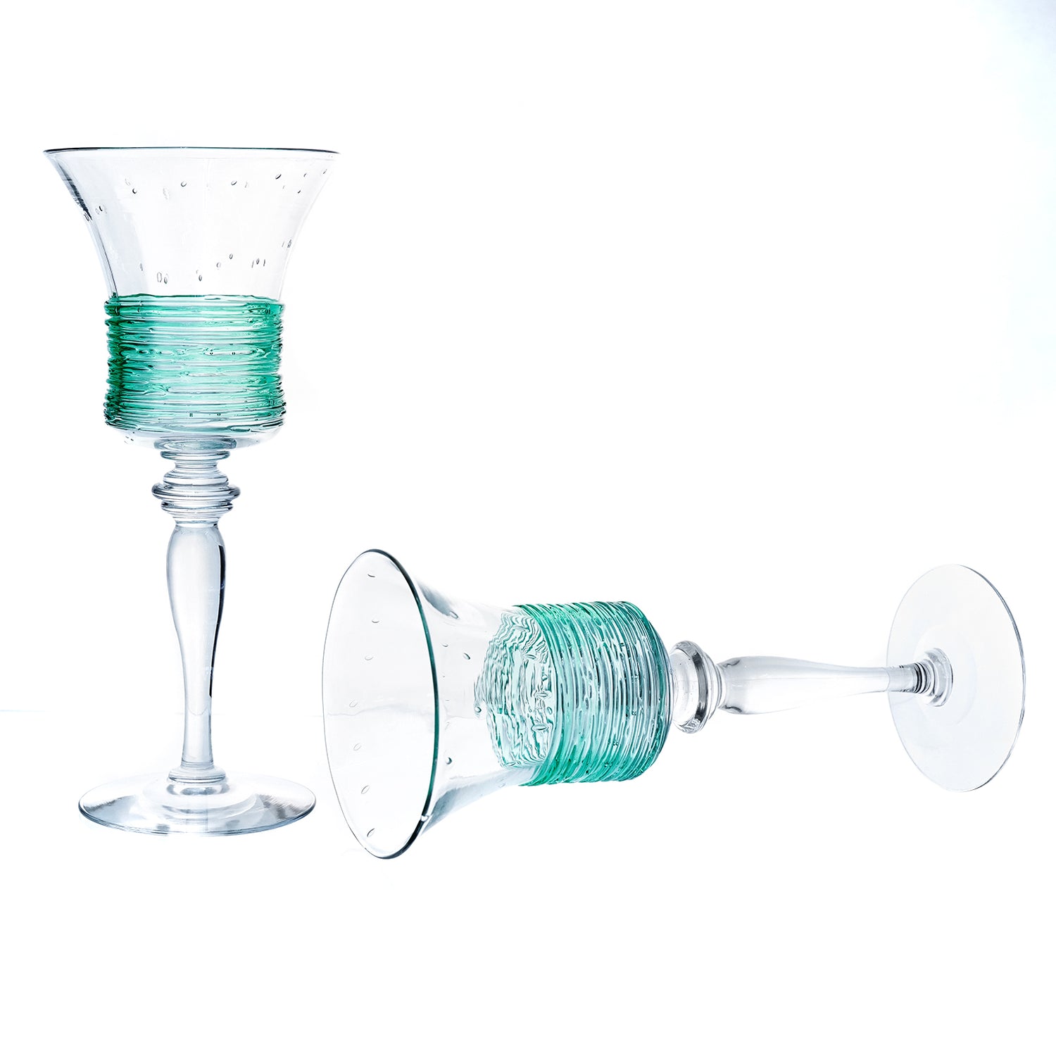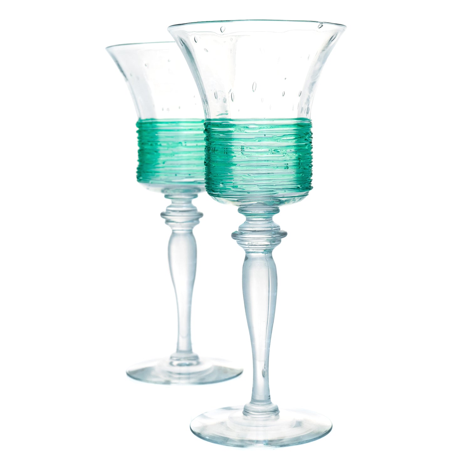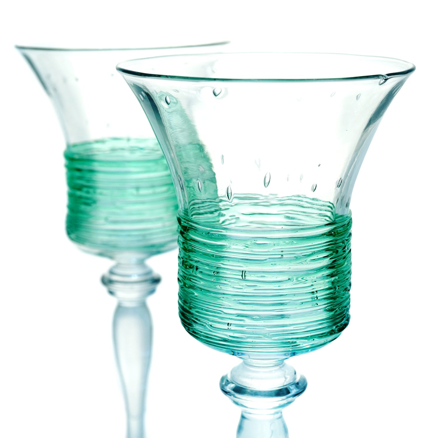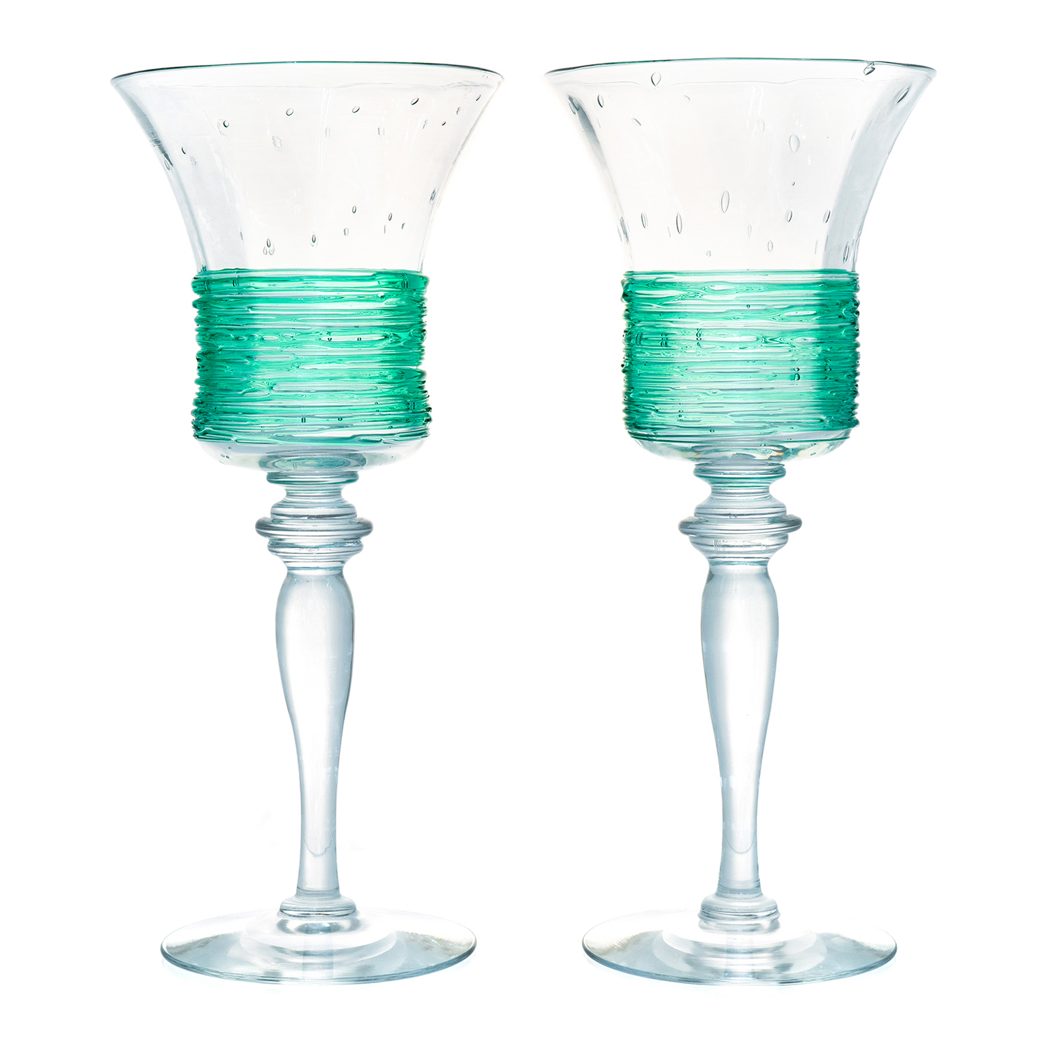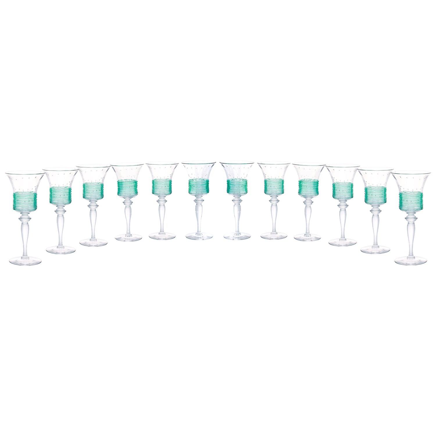 Circa 1920s by Fry Glass, West Virginia, USA. Brilliantly Art Deco, this set of 12 water goblets features a sleek silhouette ornamented with green threading. Their look brilliantly tempers the cutting edge of twenties design with a quintessentially American glass technique (threading). Known for its superb quality crystal, the Fry Glass Company produced very little Art Glass. These goblets are a rare opportunity. The set consists of 12 plus a spare for a total of 13. Excellent condition.