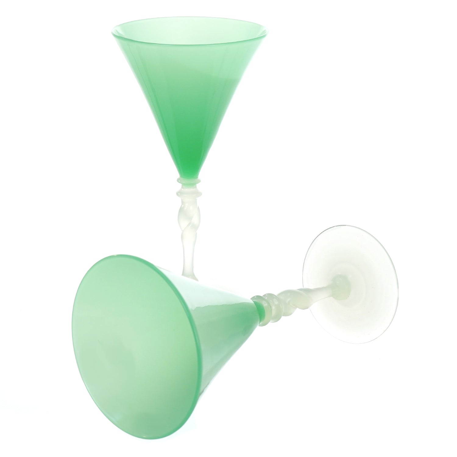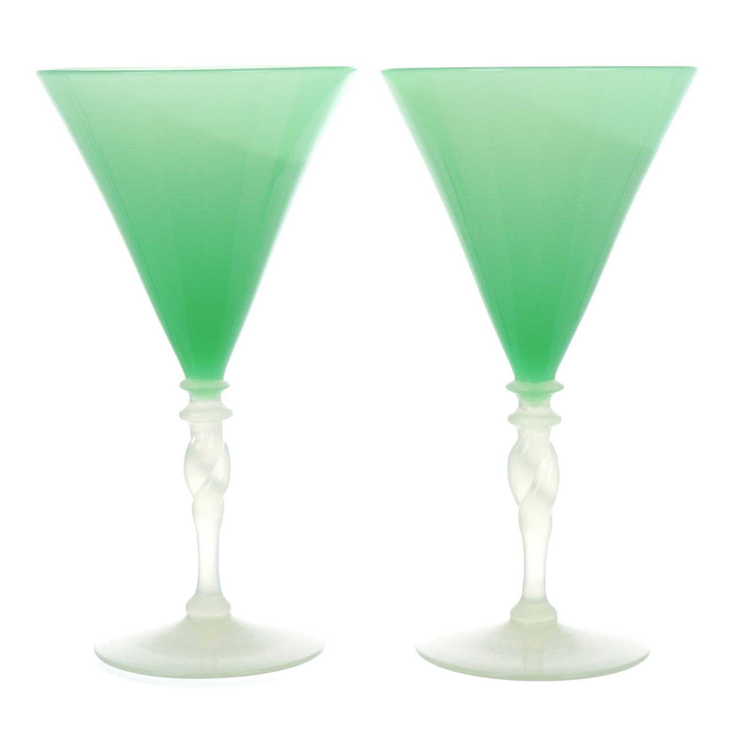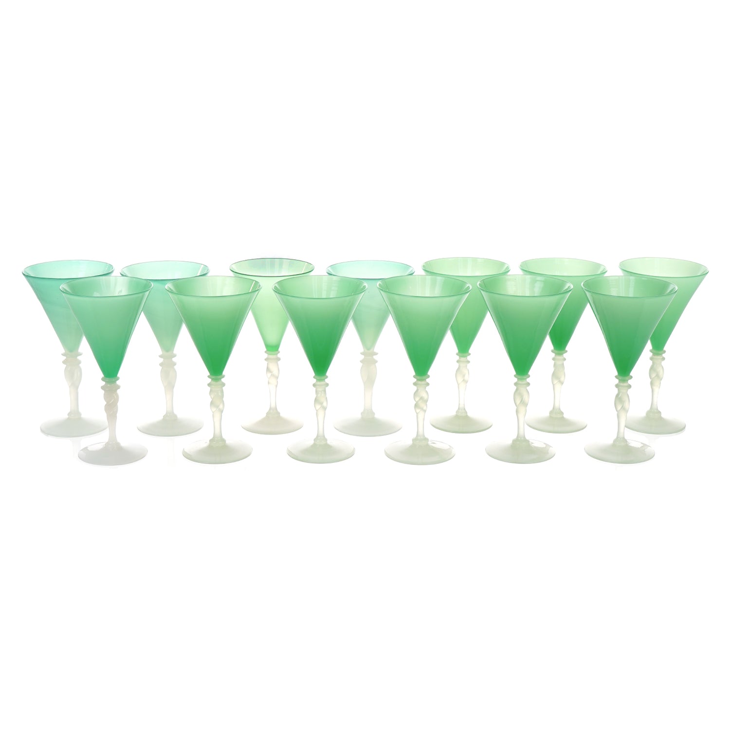 Circa 1920s, Steuben, Corning, New York. This set of 12 plus a spare (total 13) of Art Deco goblets are sublime examples of early colored Steuben glass. Perfect to use or display in modern décor, the quintessential Deco silhouette features a conical top with two disc-shaped knobs and a sleek twisted stem. The iconic combination of Jade and alabaster glass is twenties Steuben at its chic best. Excellent condition.