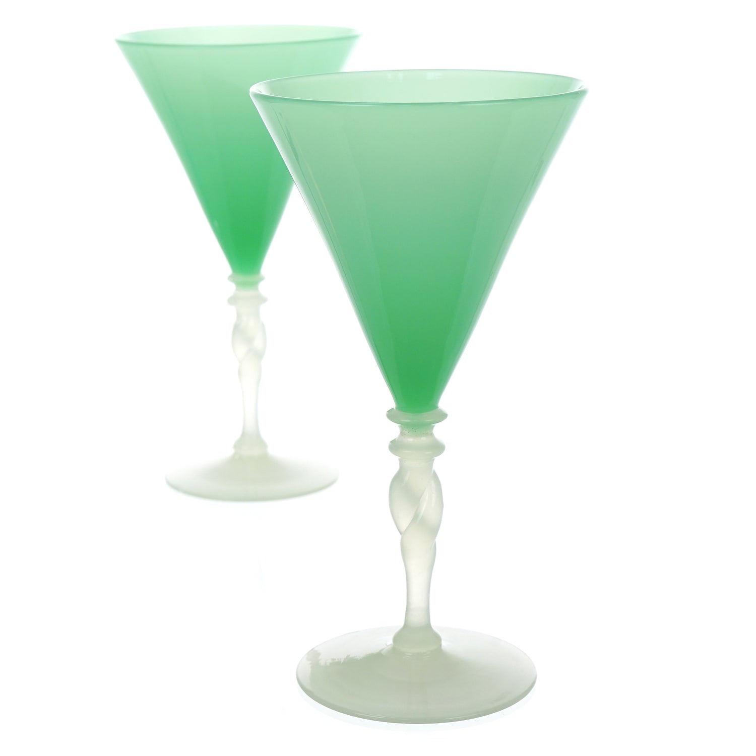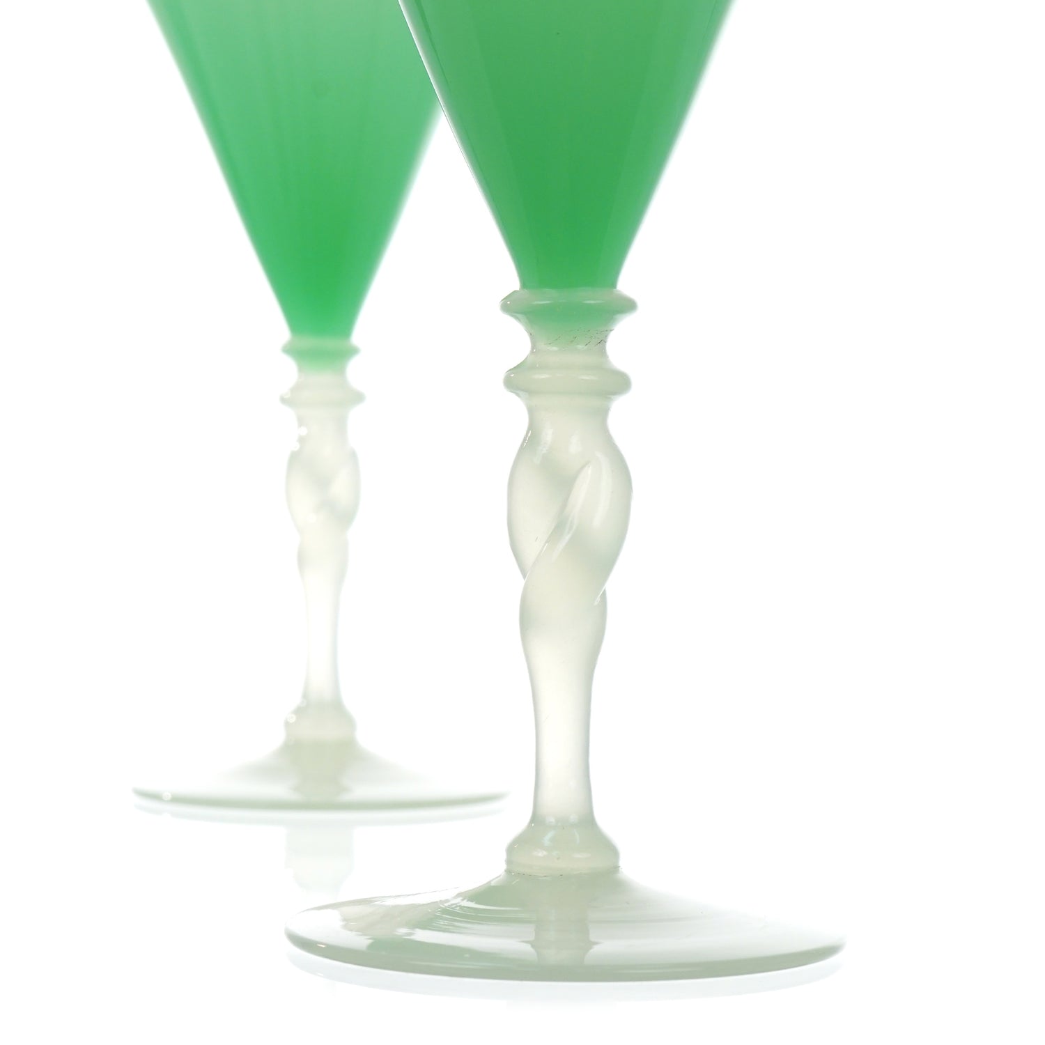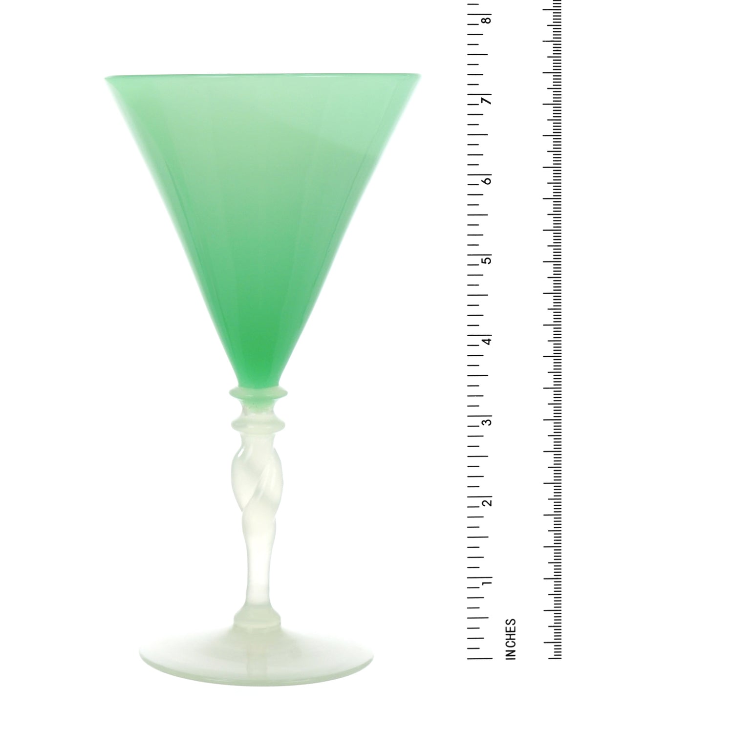 Circa 1920s, Steuben, Corning, New York. This set of 12 plus a spare (total 13) of Art Deco goblets are sublime examples of early colored Steuben glass. Perfect to use or display in modern décor, the quintessential Deco silhouette features a conical top with two disc-shaped knobs and a sleek twisted stem. The iconic combination of Jade and alabaster glass is twenties Steuben at its chic best. Excellent condition.