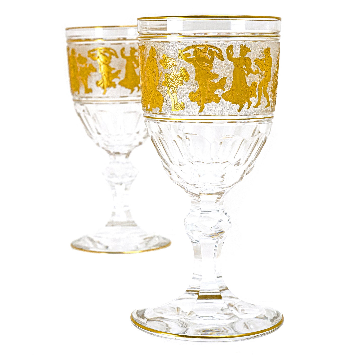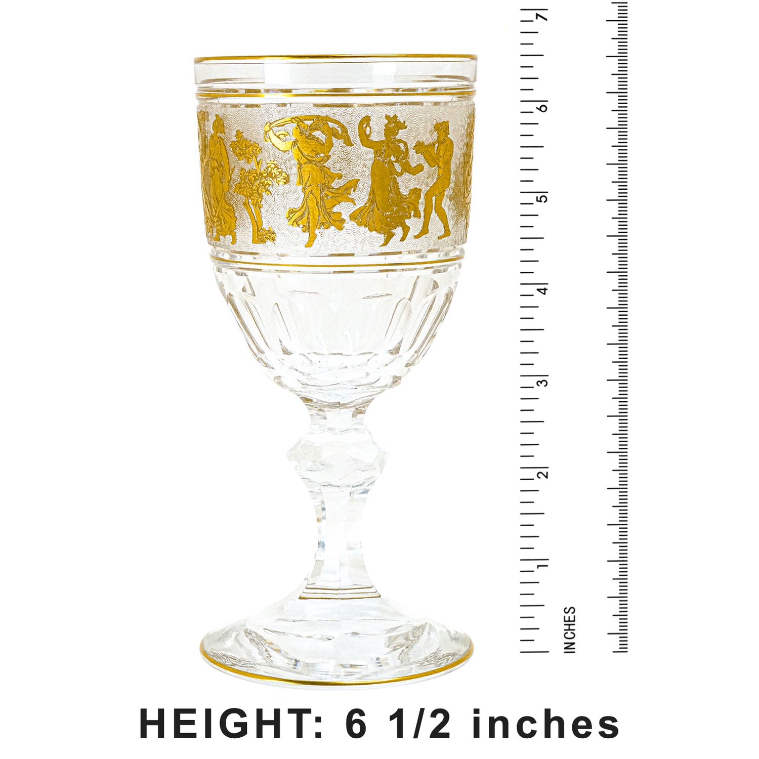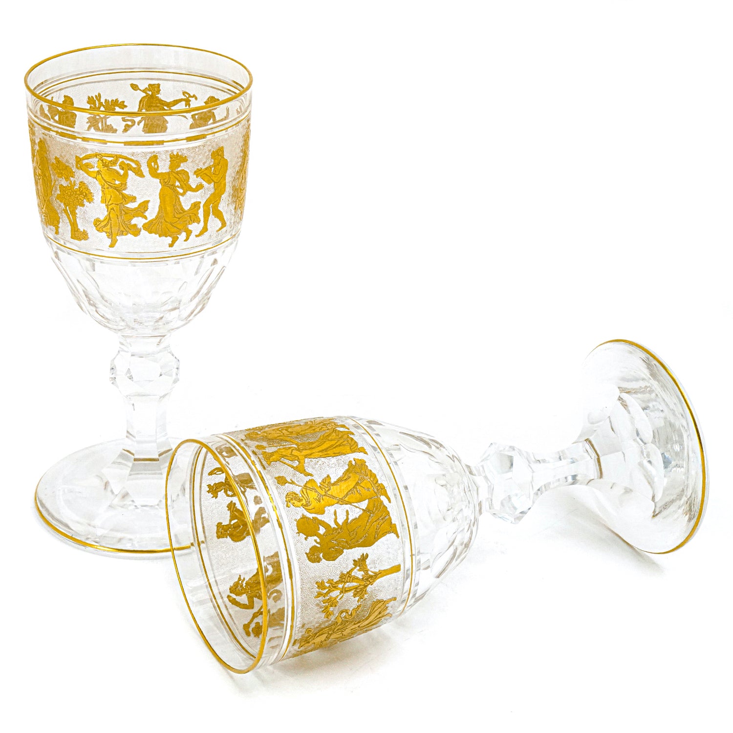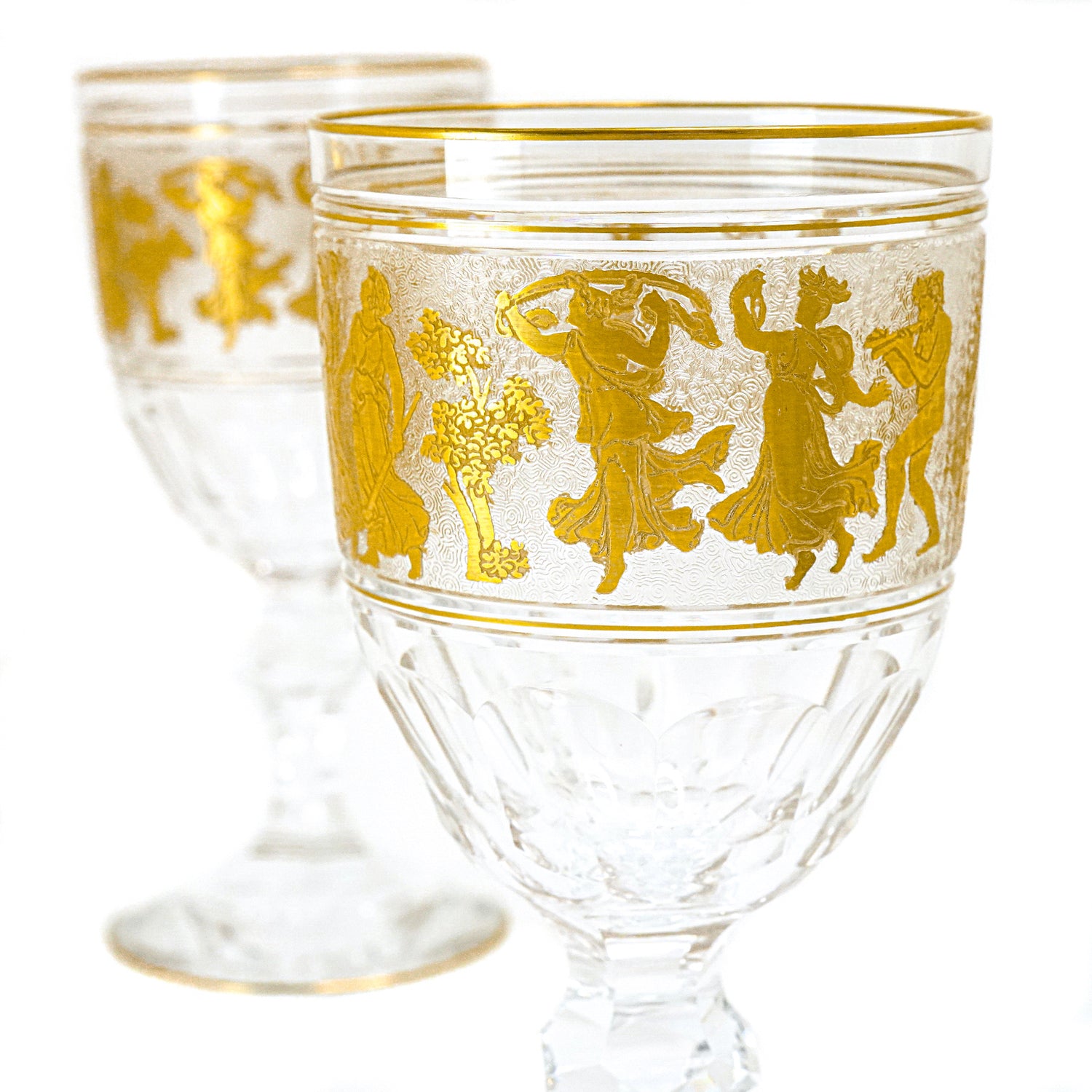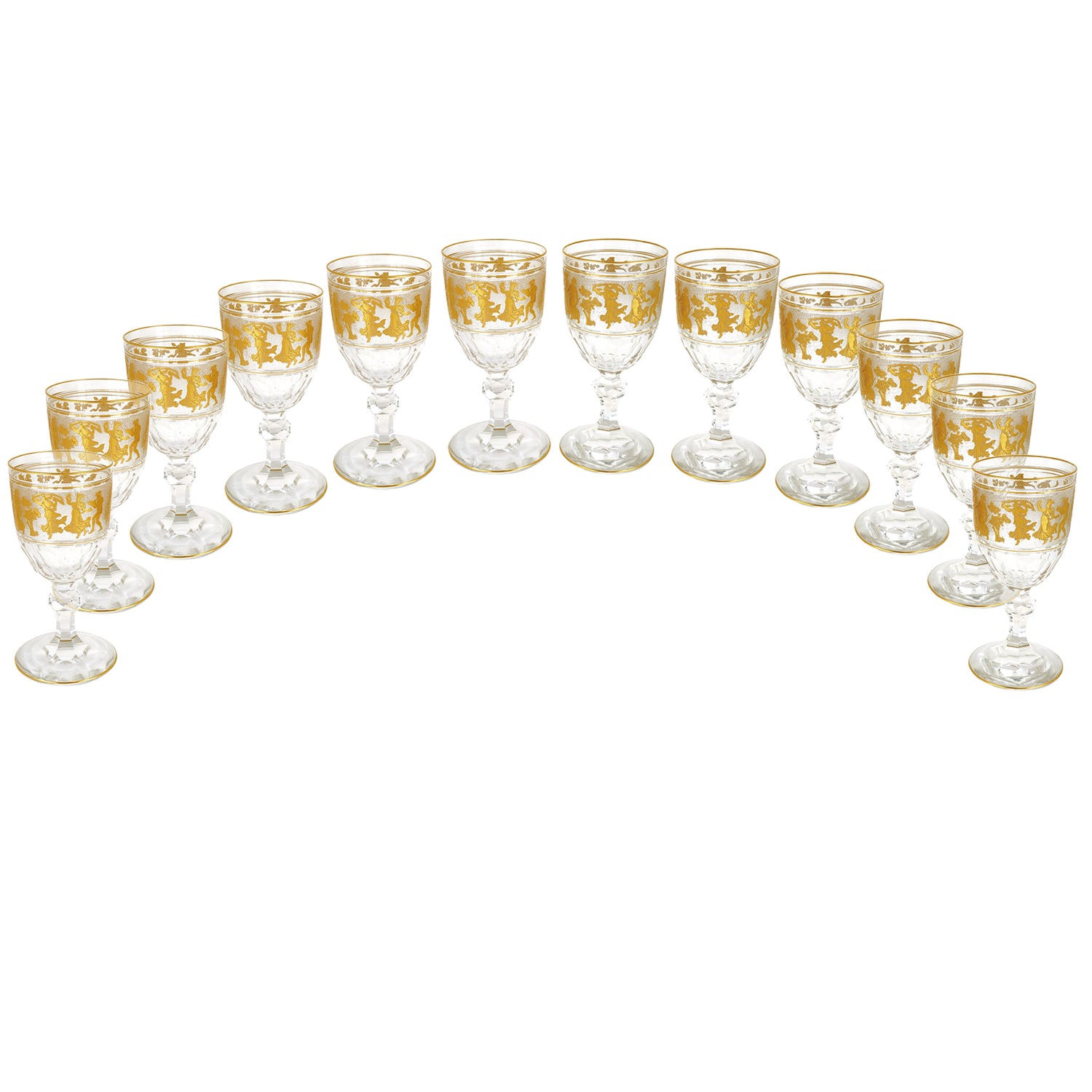 Circa 1920s, by Val St. Lambert, Belgium. This set of Val St. Lambert "Danse de Flore" water goblets are 12 plus a spare for 13 total. Perfect for water or wine, these old production glasses in clear-cut crystal with gilded decorations and details set a sharp table. Excellent condition.