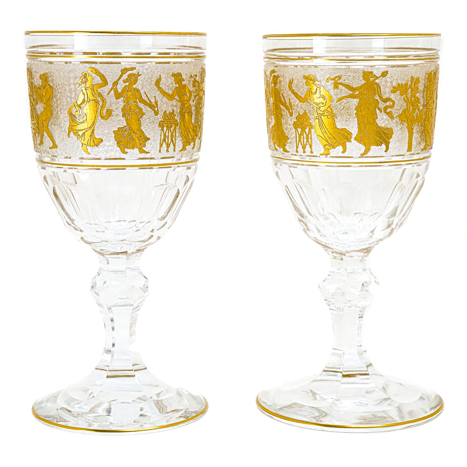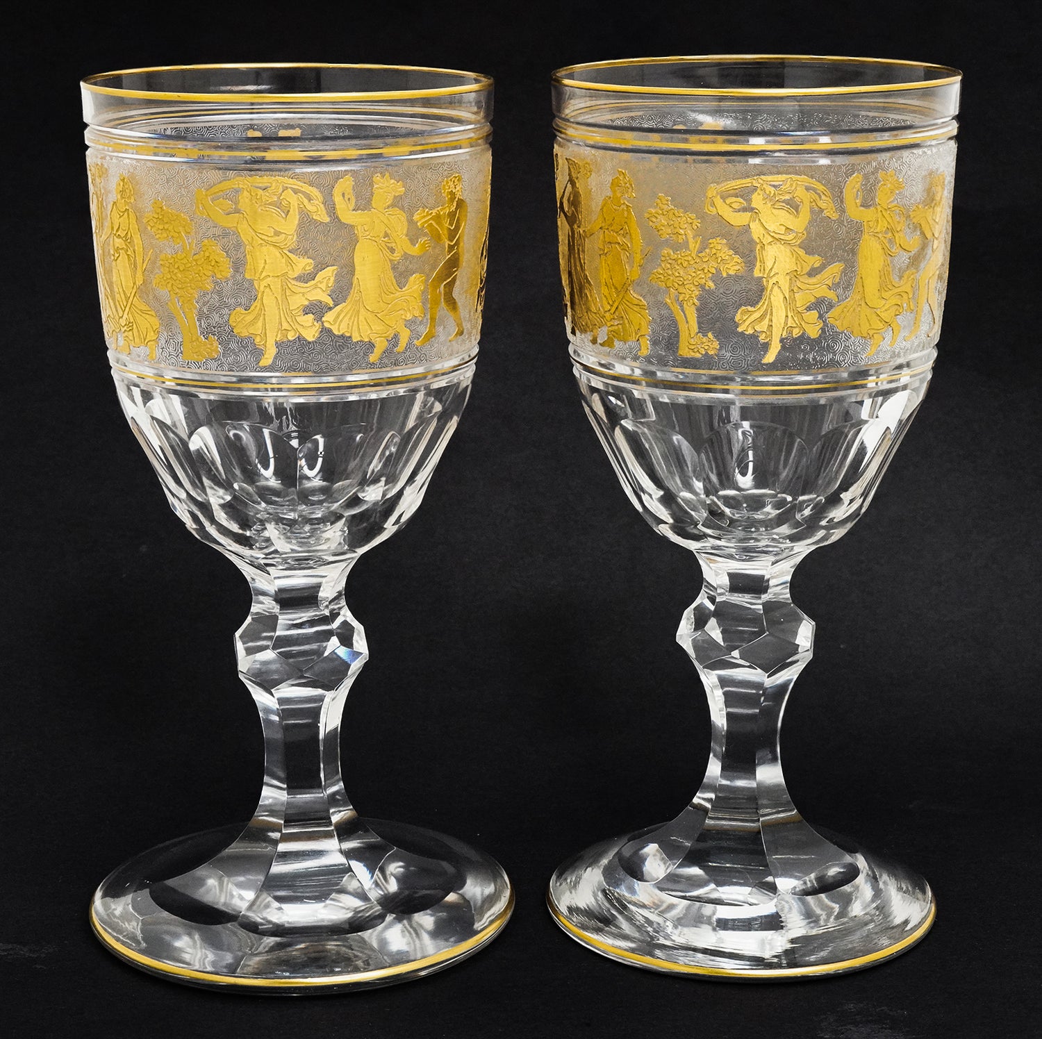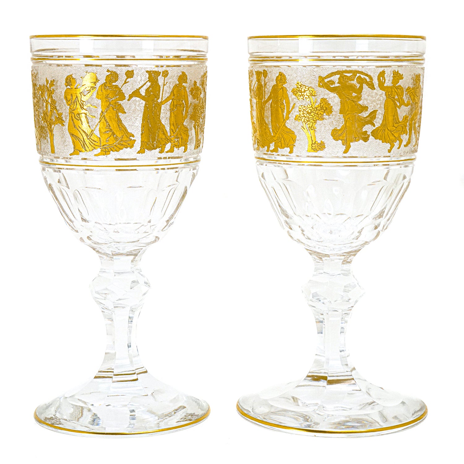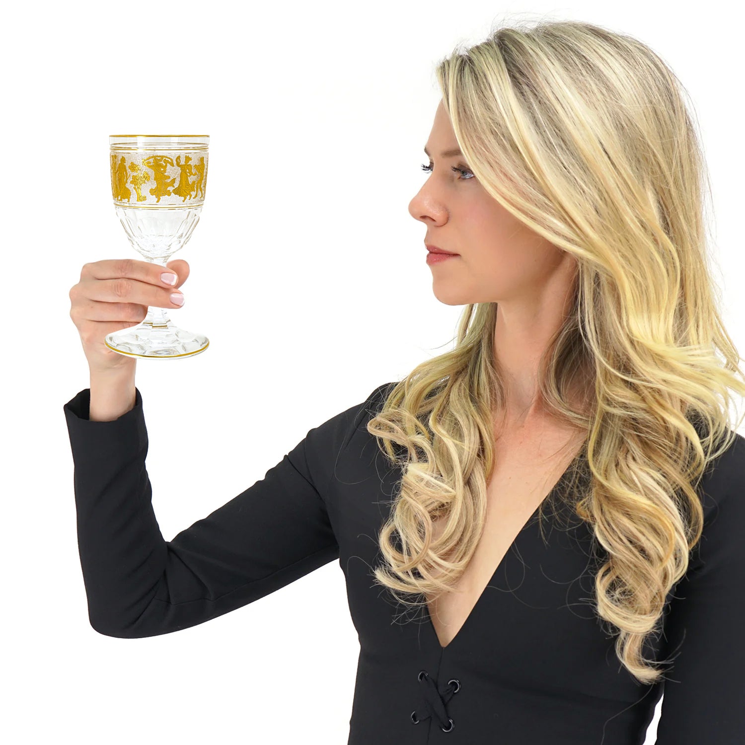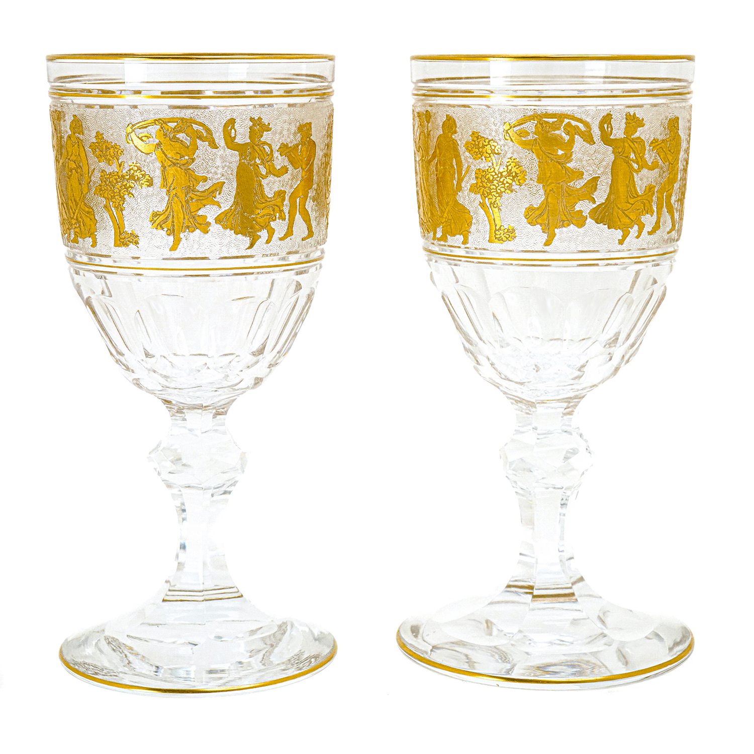 Circa 1920s, by Val St. Lambert, Belgium. This set of Val St. Lambert "Danse de Flore" water goblets are 12 plus a spare for 13 total. Perfect for water or wine, these old production glasses in clear-cut crystal with gilded decorations and details set a sharp table. Excellent condition.