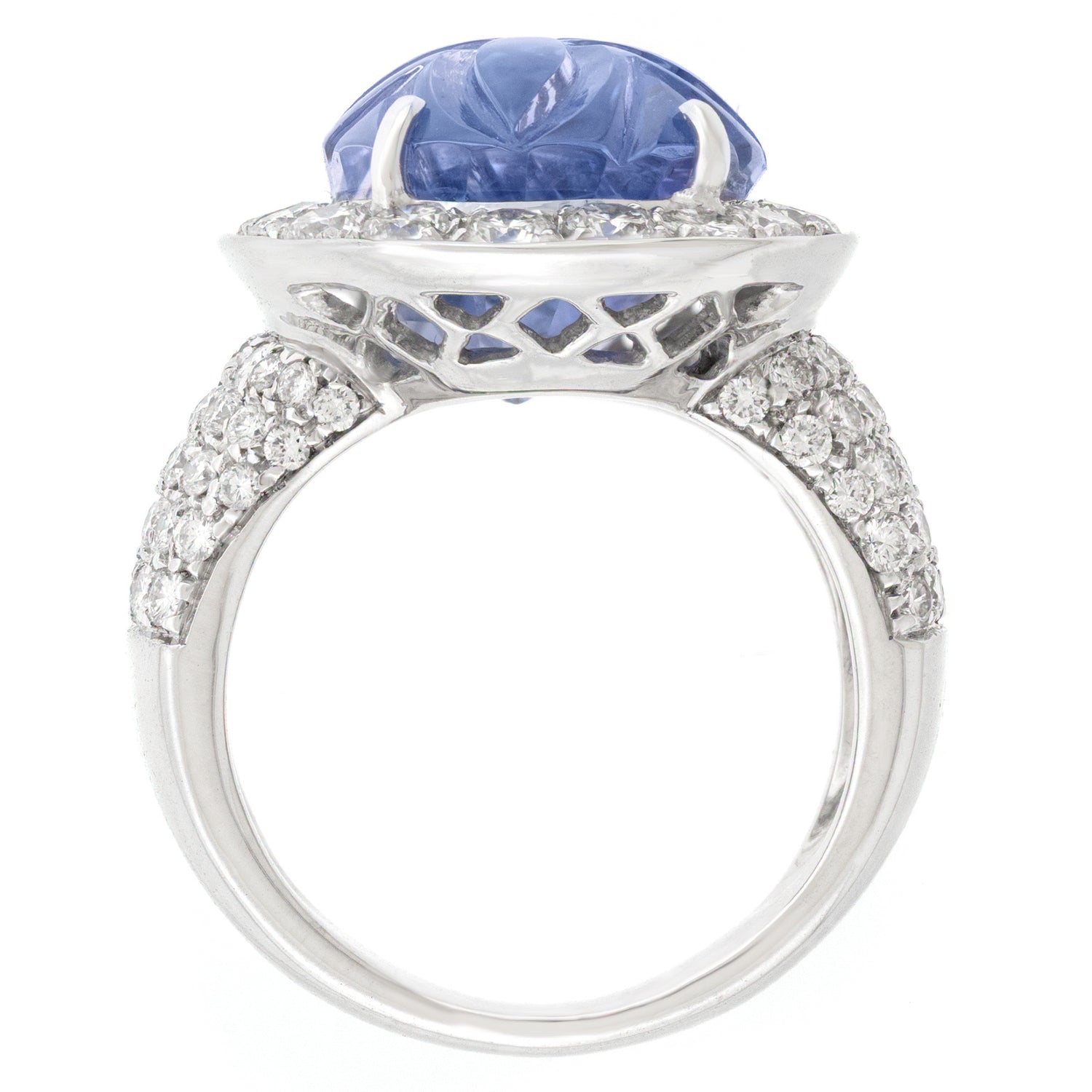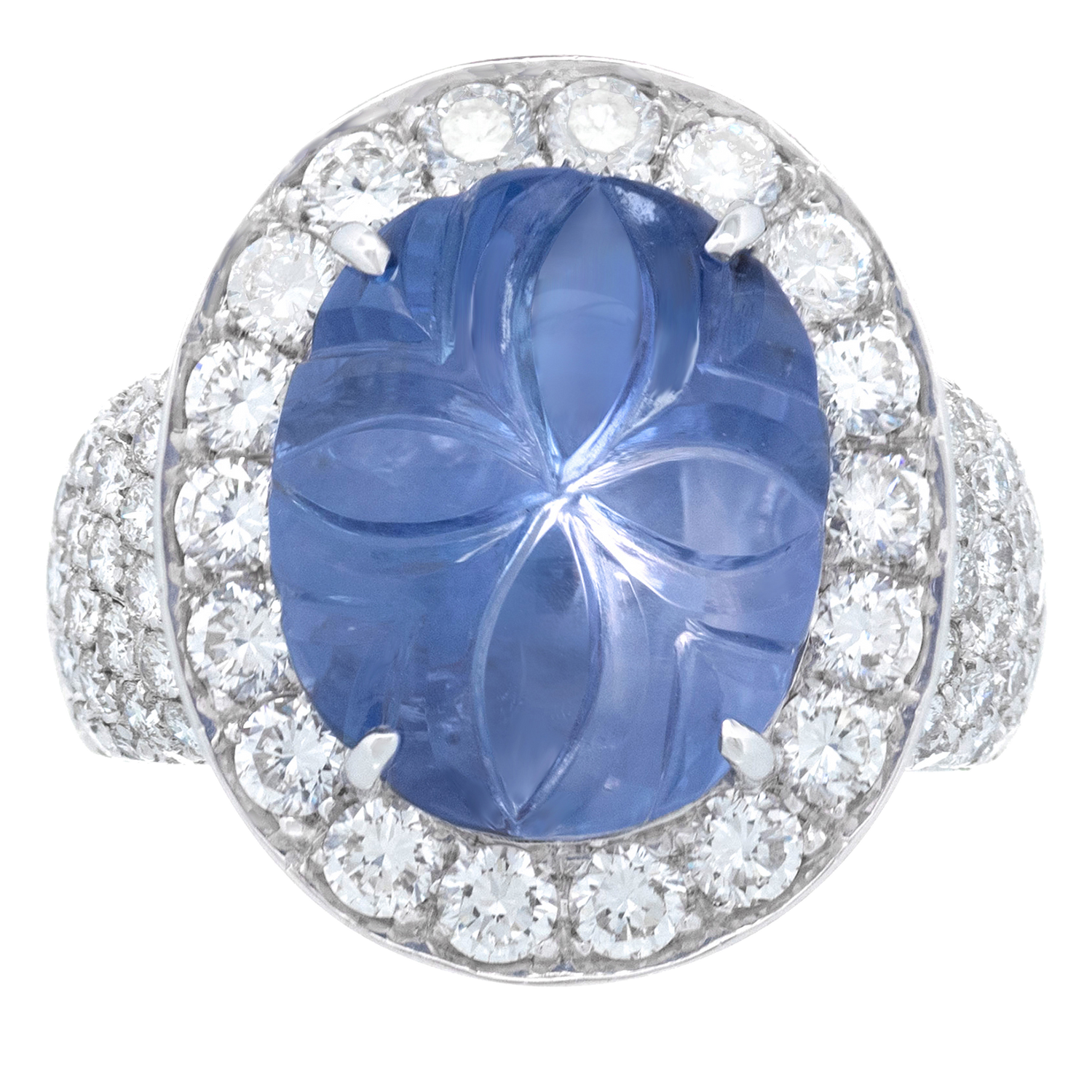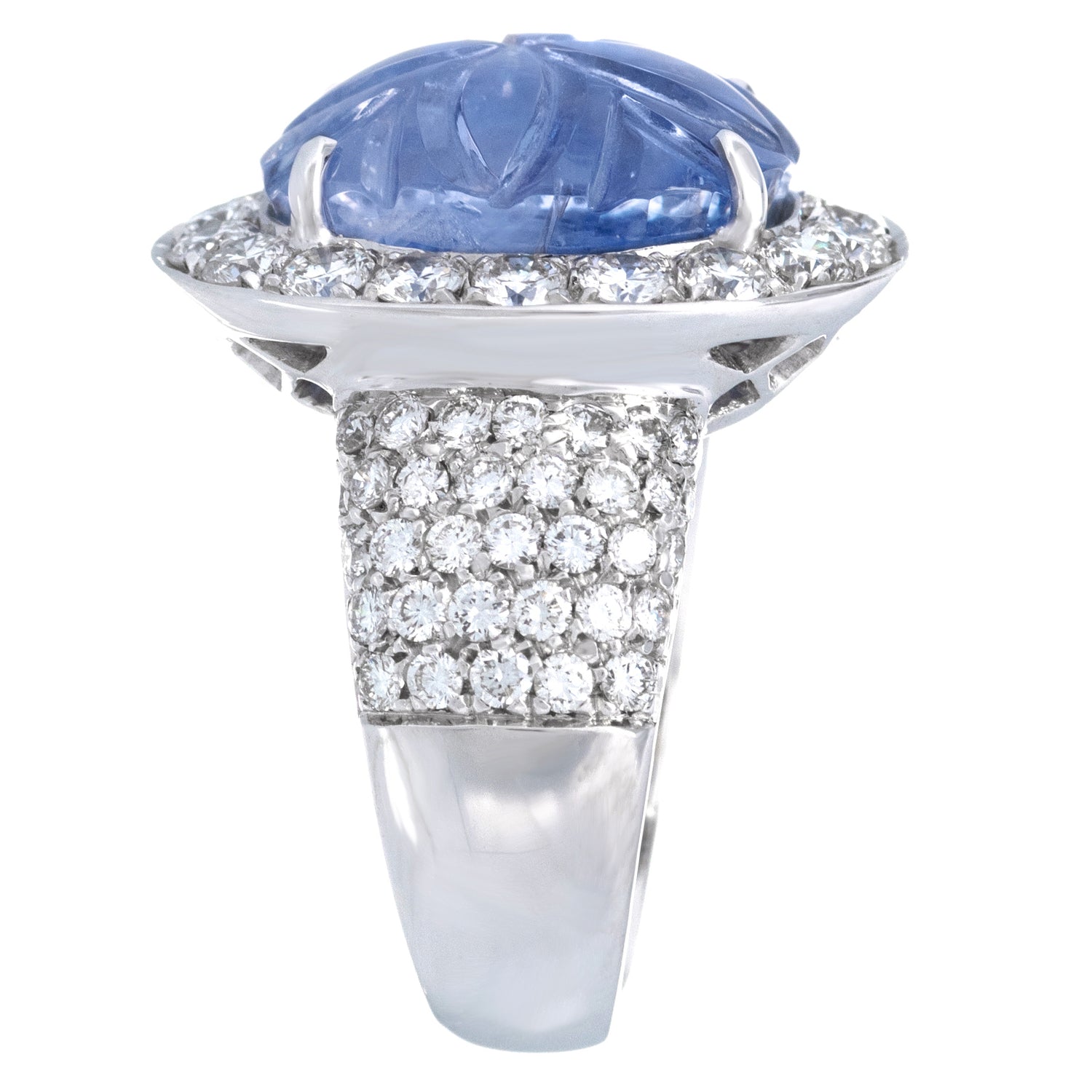 Circa 1980s, 18k, Italy. This colorful, sparkly ring is set with a carved 16.43-carat fine blue No Heat, Ceylon sapphire (GIA laboratory report). Three carats of brilliant white diamonds (G color, VS clarity) complete the look. Sidewalk to catwalk, this ring will become your signature style. Excellent condition.