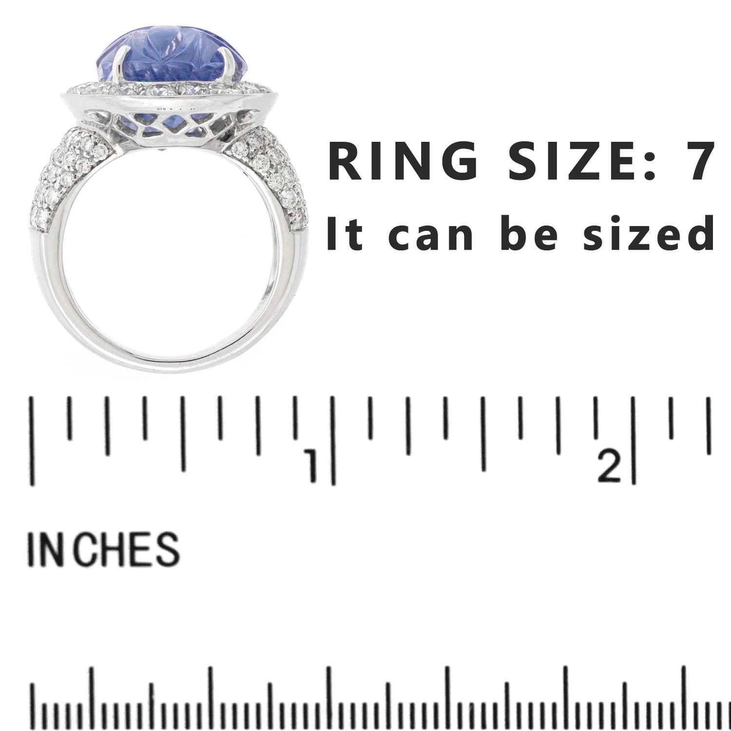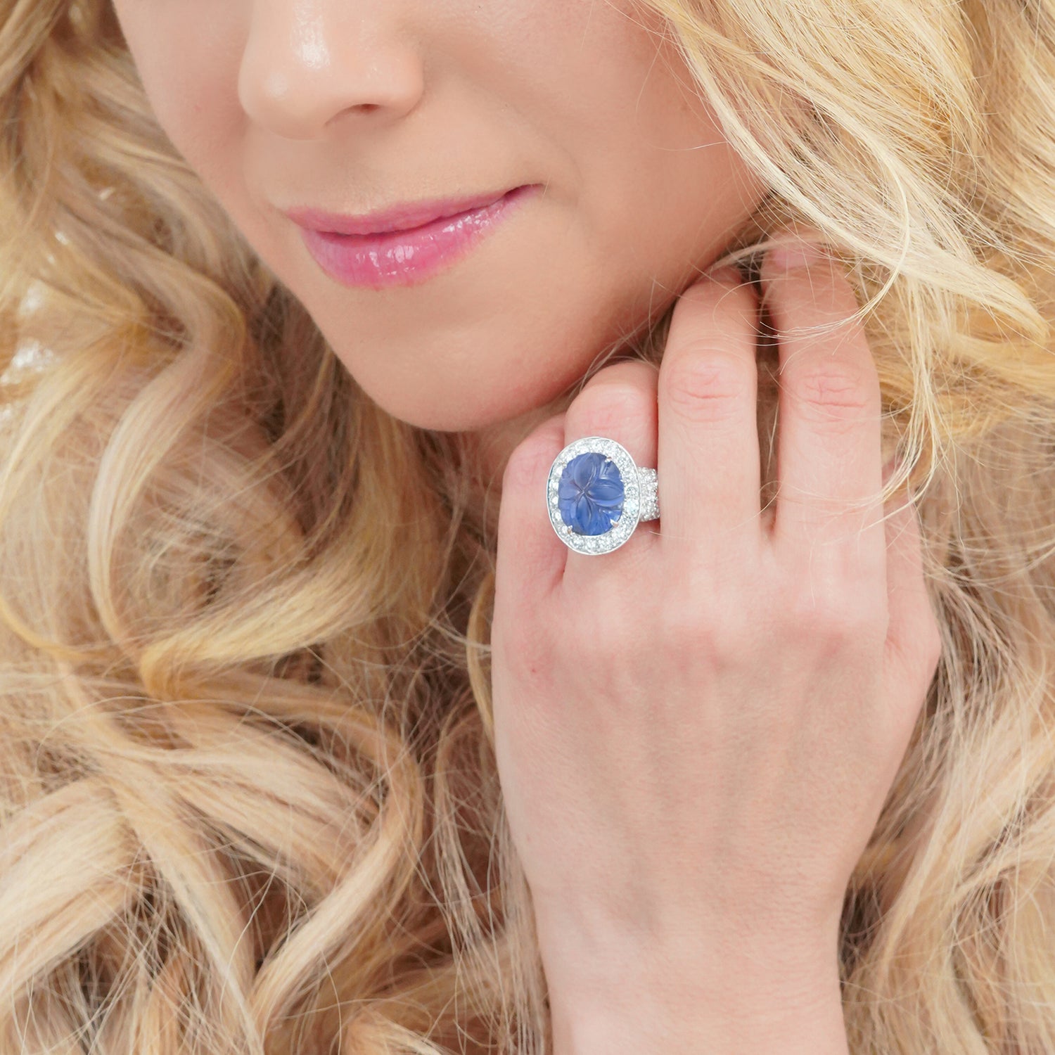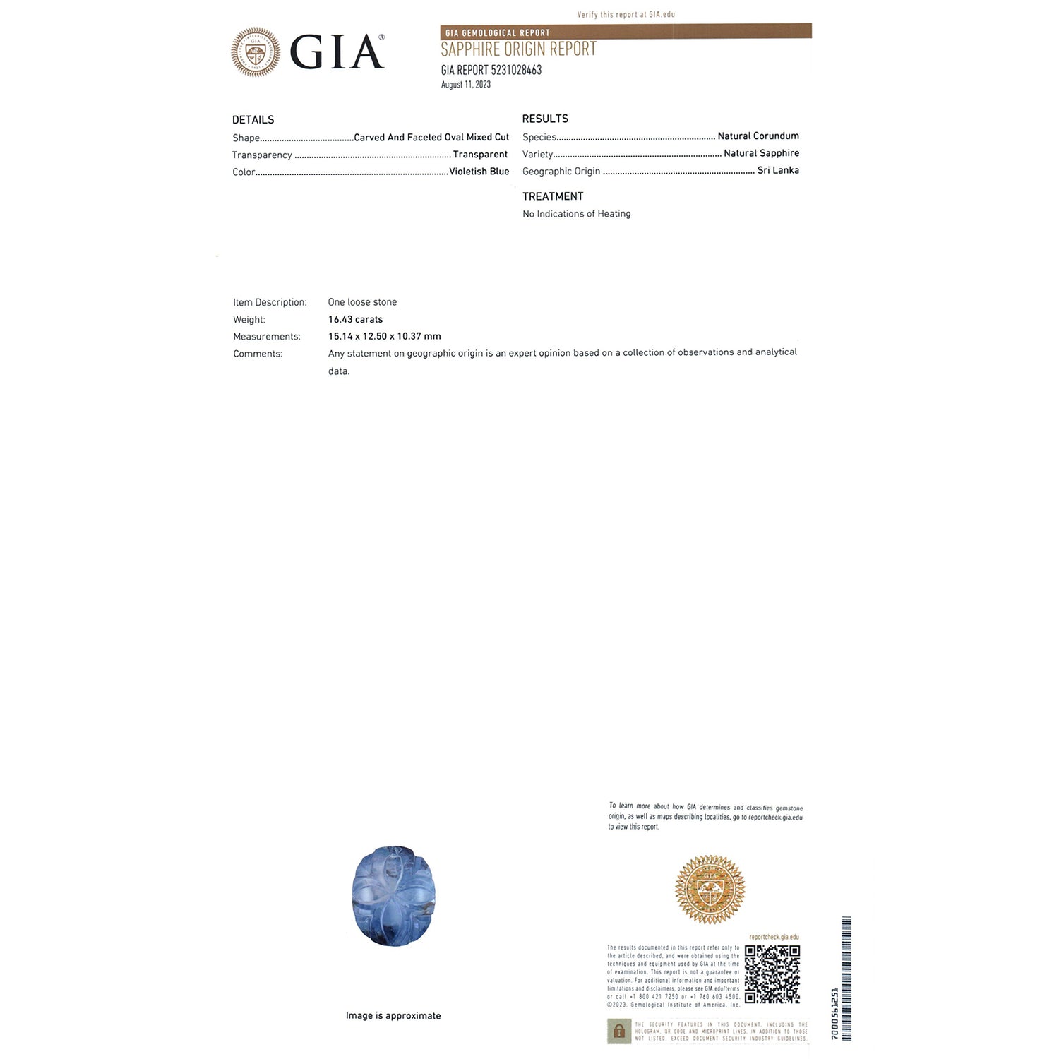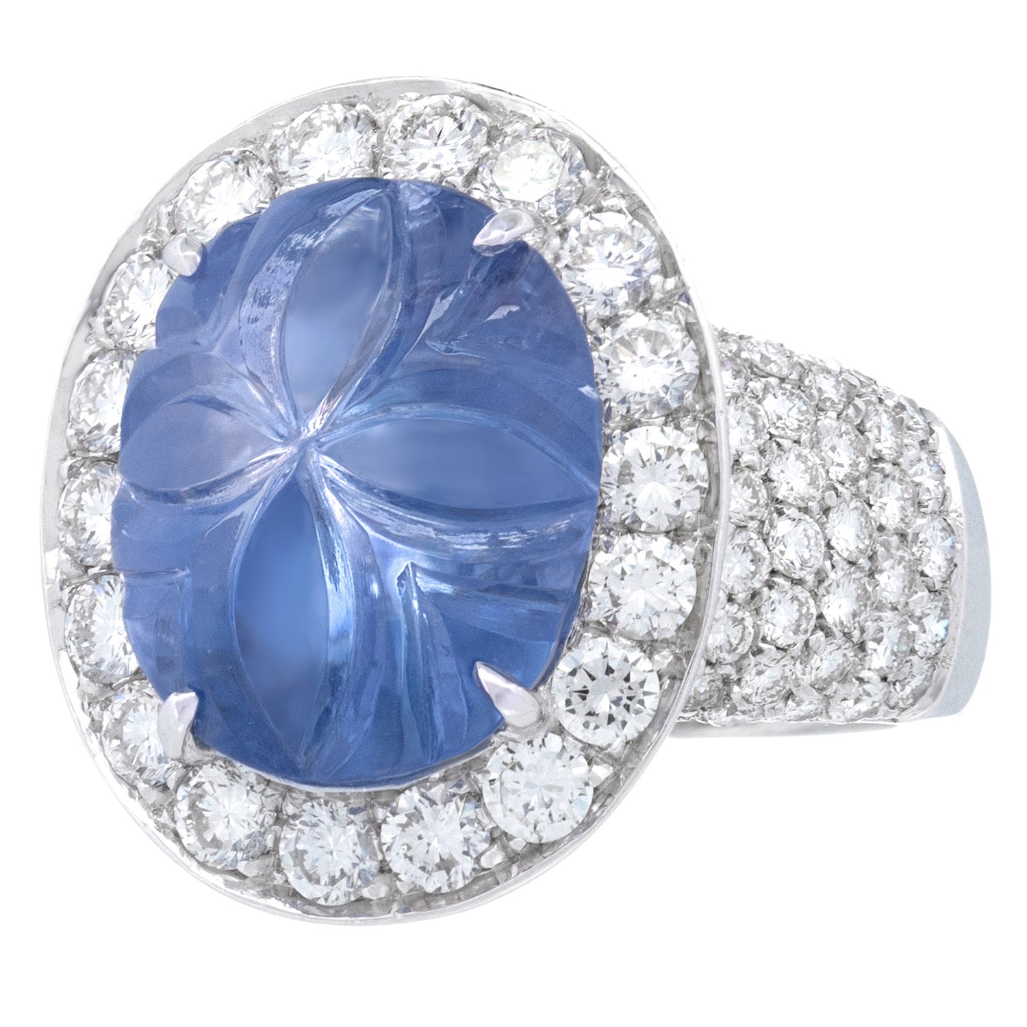 Circa 1980s, 18k, Italy. This colorful, sparkly ring is set with a carved 16.43-carat fine blue No Heat, Ceylon sapphire (GIA laboratory report). Three carats of brilliant white diamonds (G color, VS clarity) complete the look. Sidewalk to catwalk, this ring will become your signature style. Excellent condition.