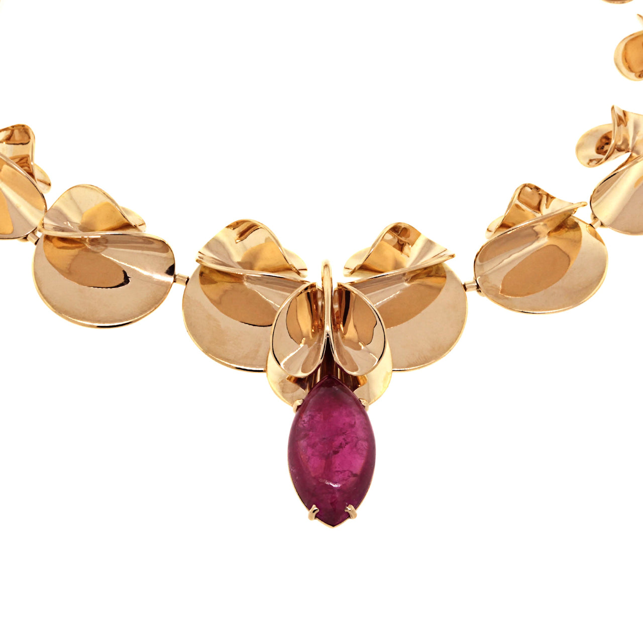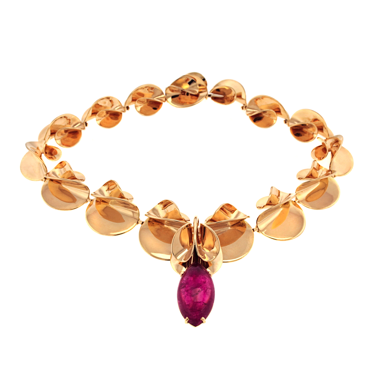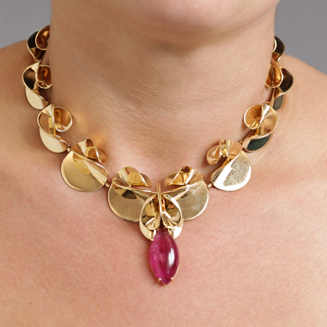 Circa 1960-1970s, Brechbuhl, Swiss. This modernist necklace has a fluid visual presence that delights the eye and a chic style that is quite unique. Handmade in heavy 18k gold it is superbly crafted and set with a vivid 25-carat Pink Tourmaline. Note regardless of its 16 1/5 inch length it fits a bit small. Excellent condition.