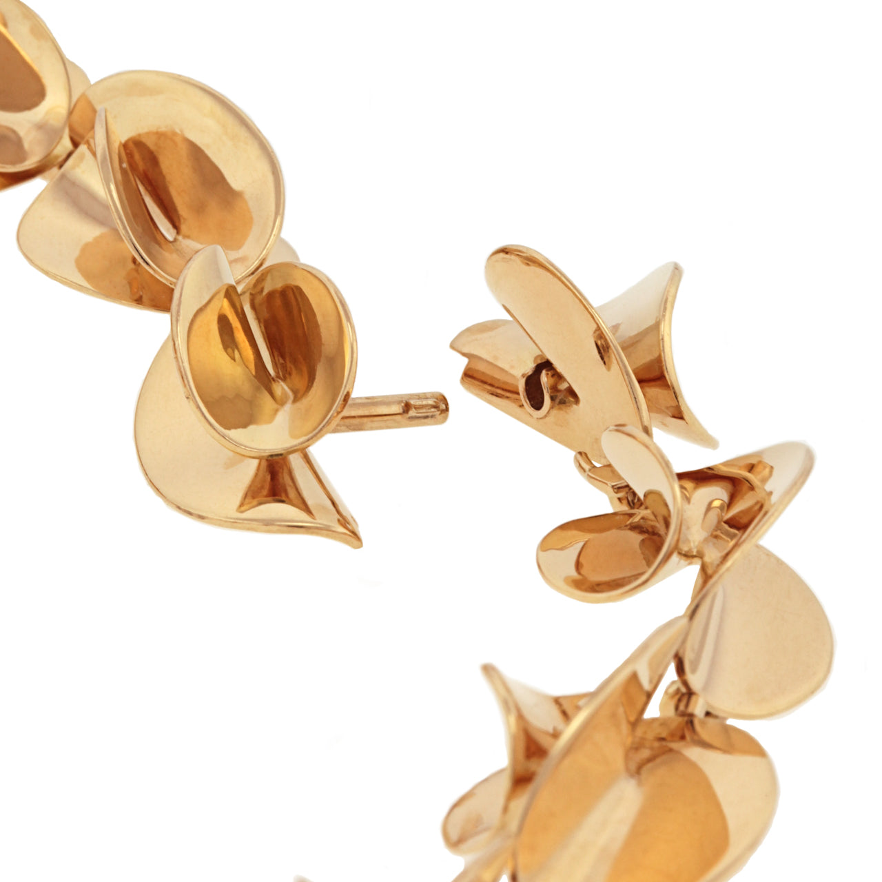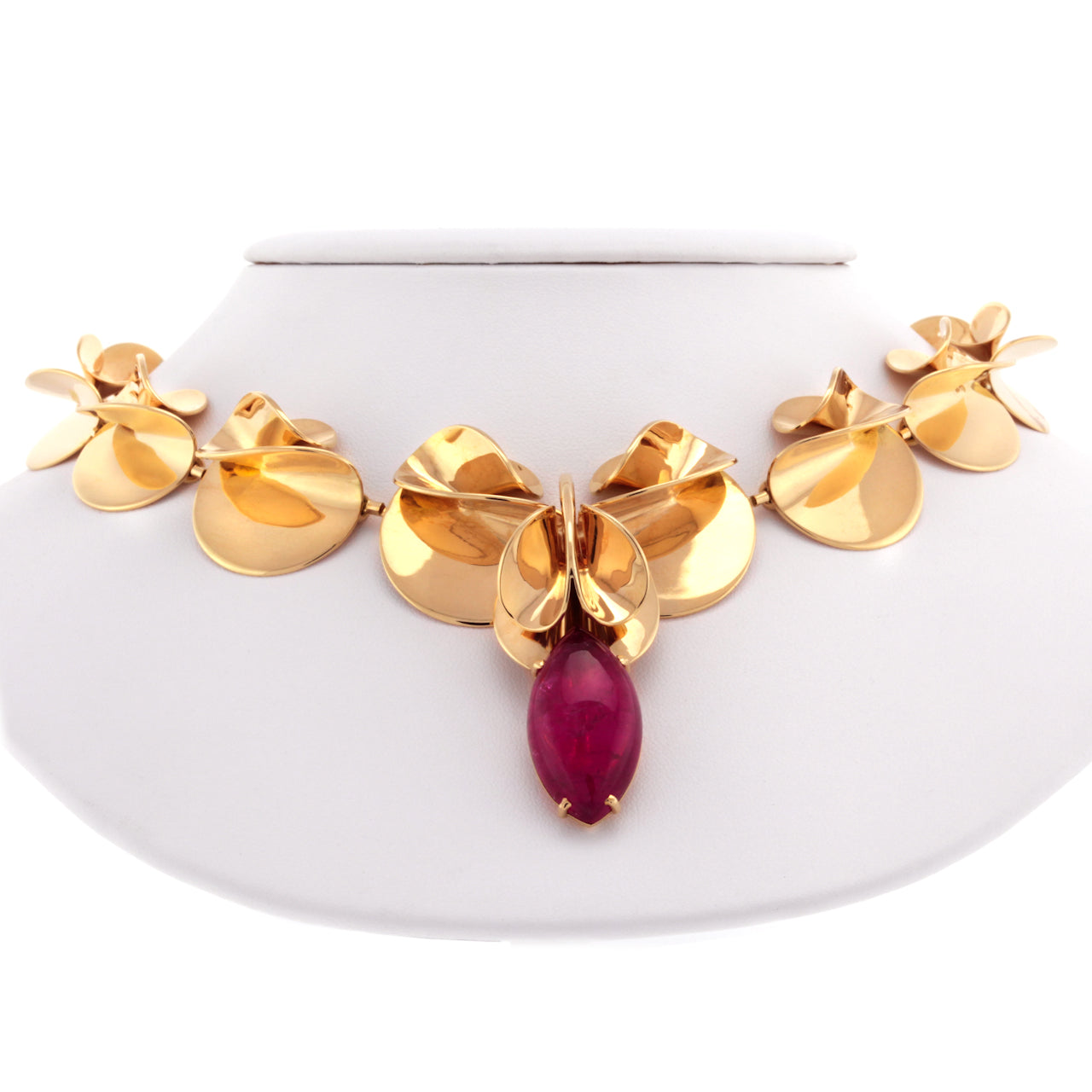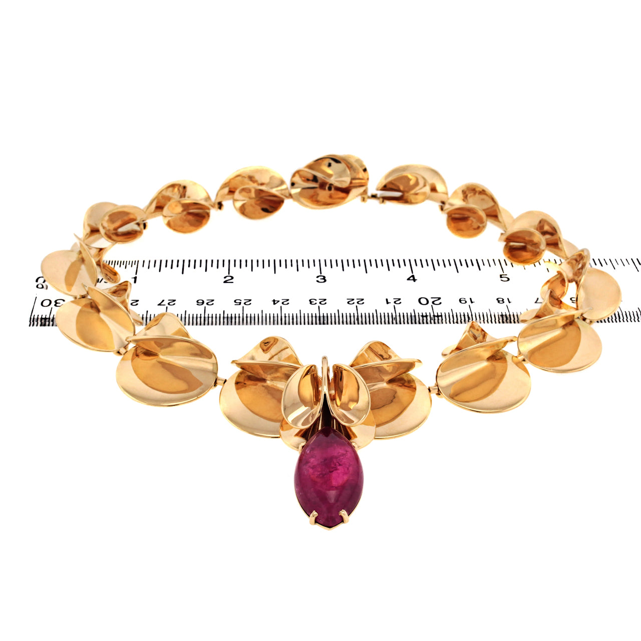 Circa 1960-1970s, Brechbuhl, Swiss. This modernist necklace has a fluid visual presence that delights the eye and a chic style that is quite unique. Handmade in heavy 18k gold it is superbly crafted and set with a vivid 25-carat Pink Tourmaline. Note regardless of its 16 1/5 inch length it fits a bit small. Excellent condition.