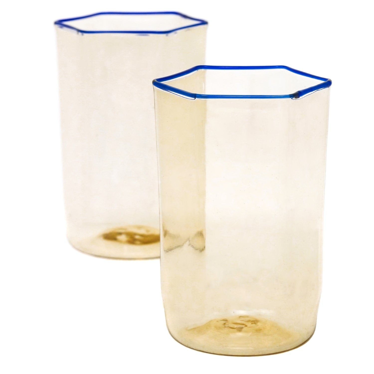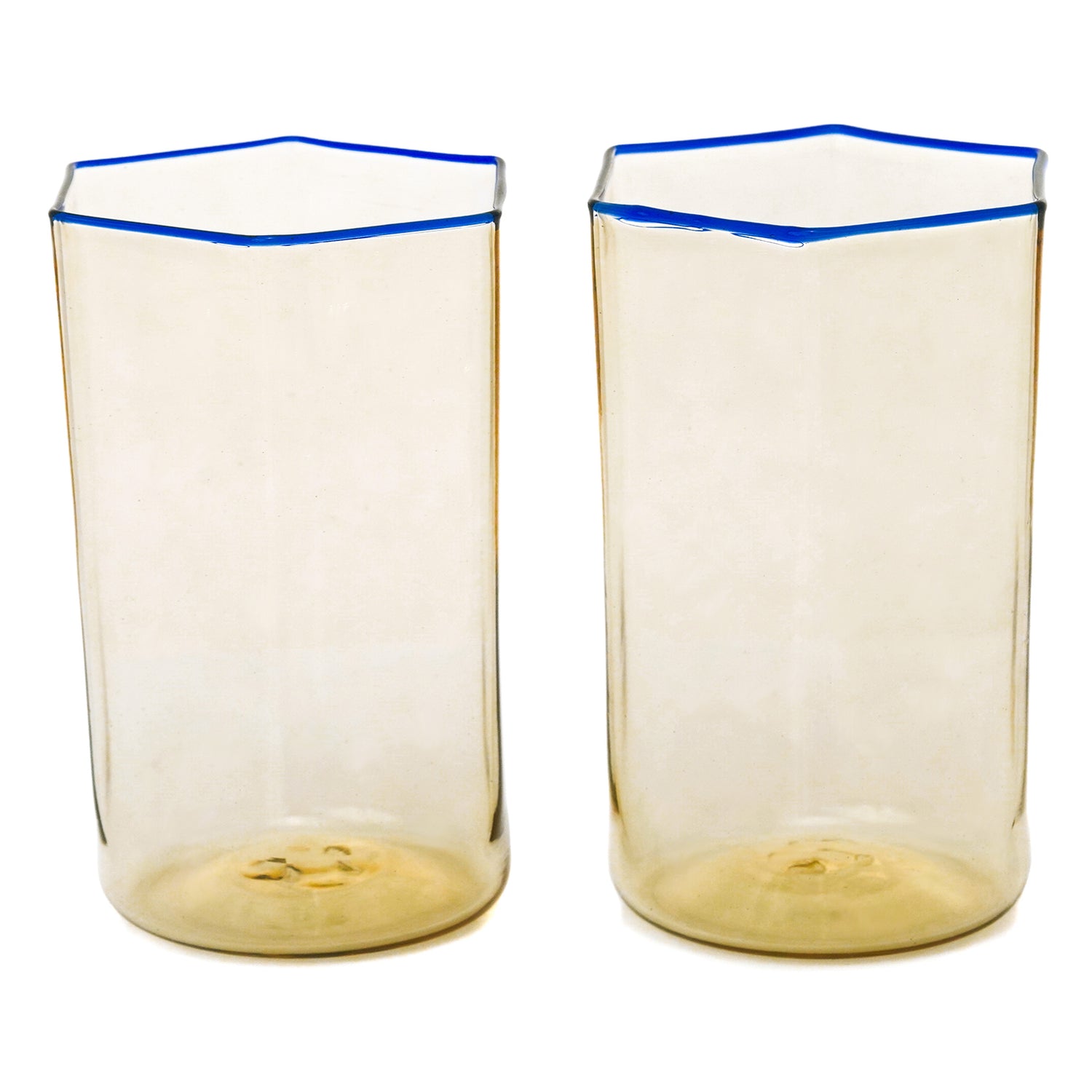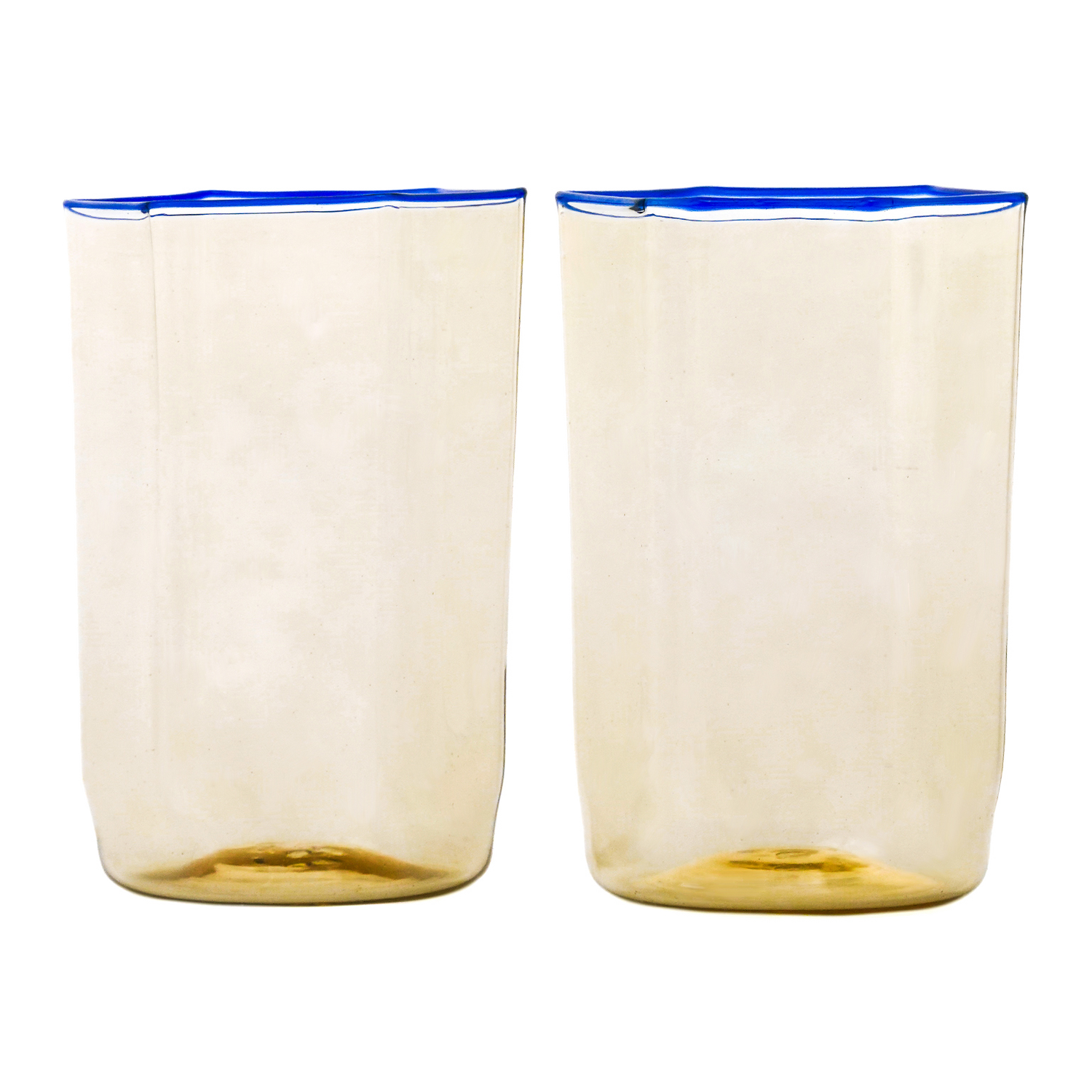Circa 1930s, Venini, Italy. These early modernist tumblers were designed by Carlo Scarpa in 1932. Delicately toned with cobalt blue rims, they are decades ahead of their time. Excellent condition.