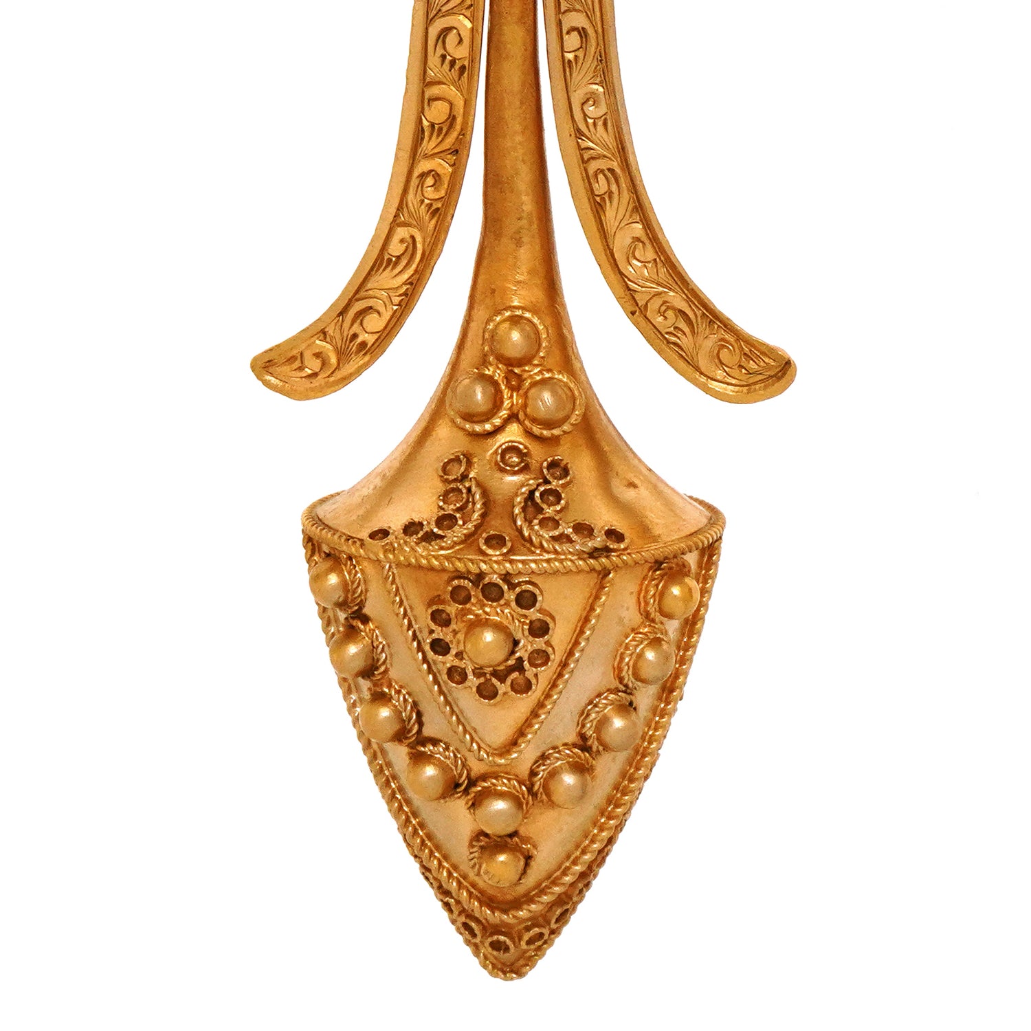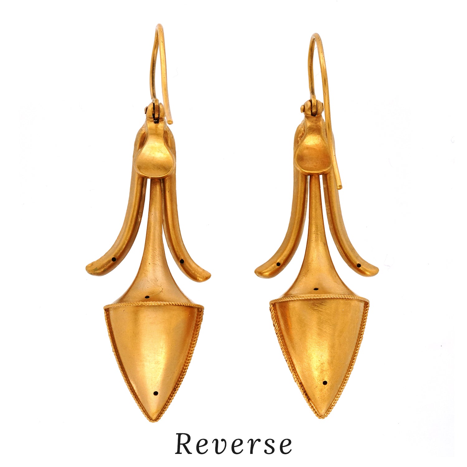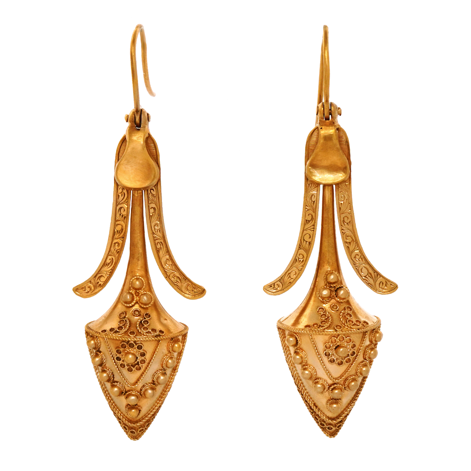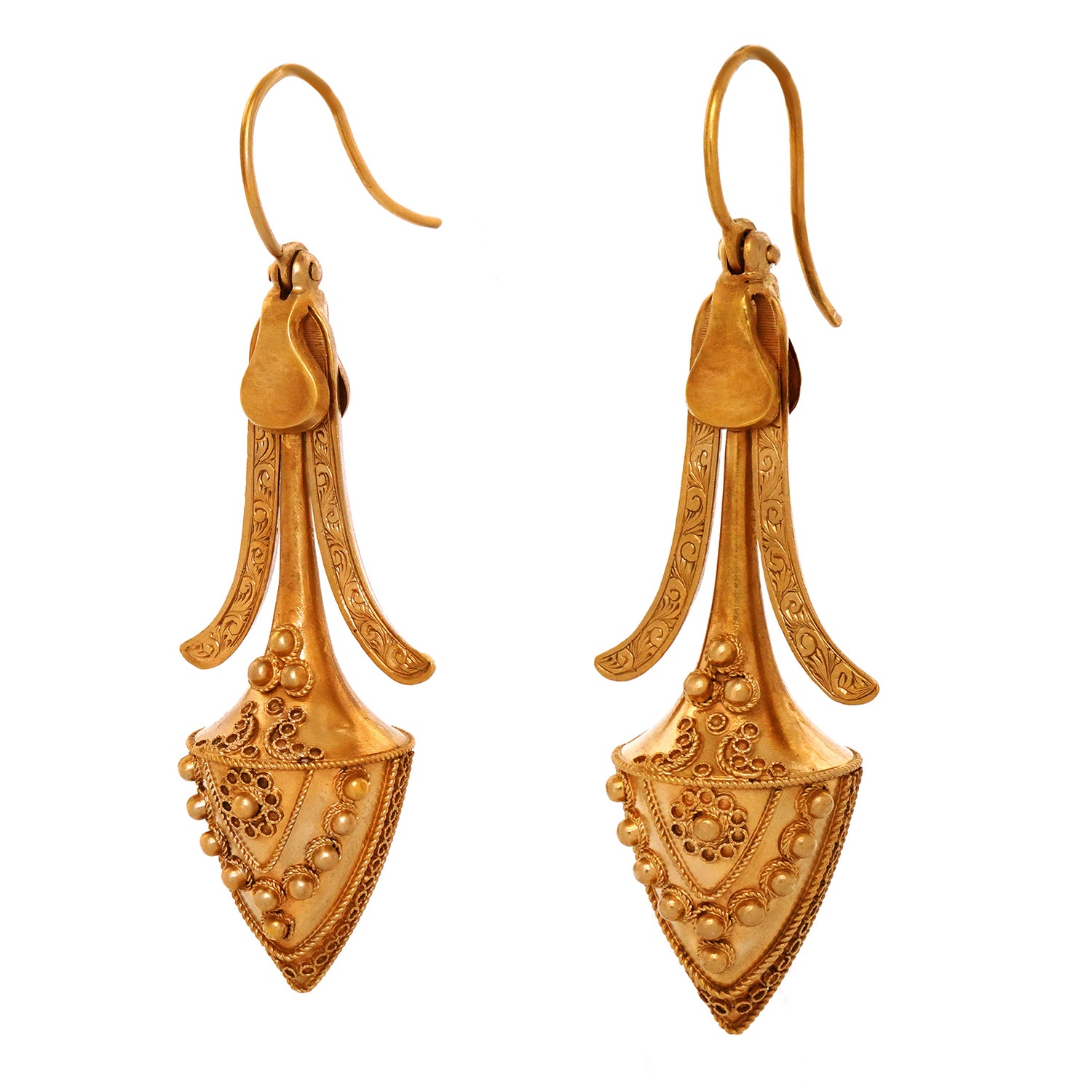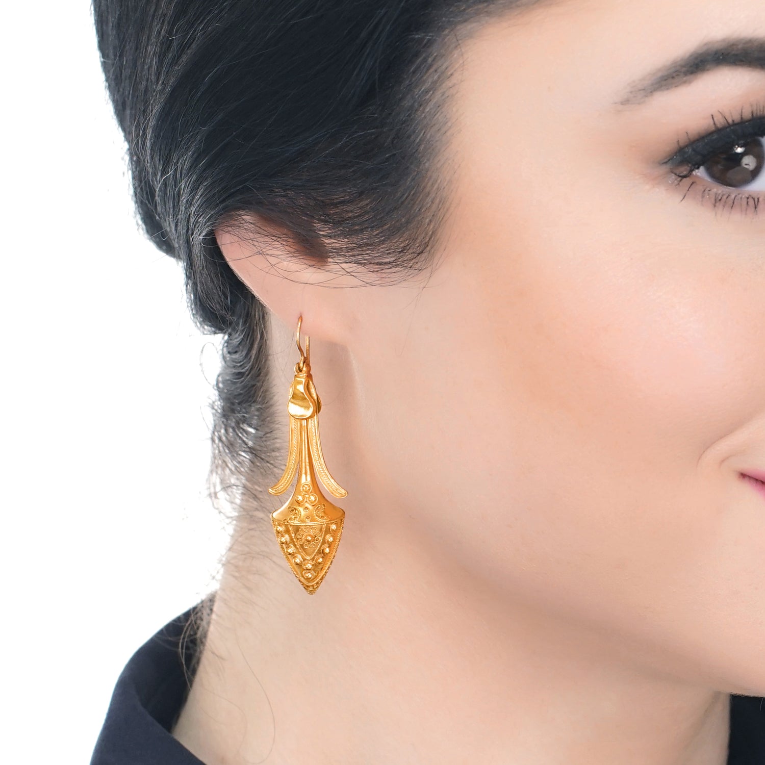 Circa 1880s, 14k, American. These nineteenth-century Etruscan revival earrings are elegant, flirty, and visually arresting. Fabulous length combined with exciting movement, fine detail, and a lovely patina makes them as fashionable today as they were over a hundred years ago. The look is neoclassical chic at its antique best! Finely made in fourteen-karat yellow gold, they are in excellent condition.