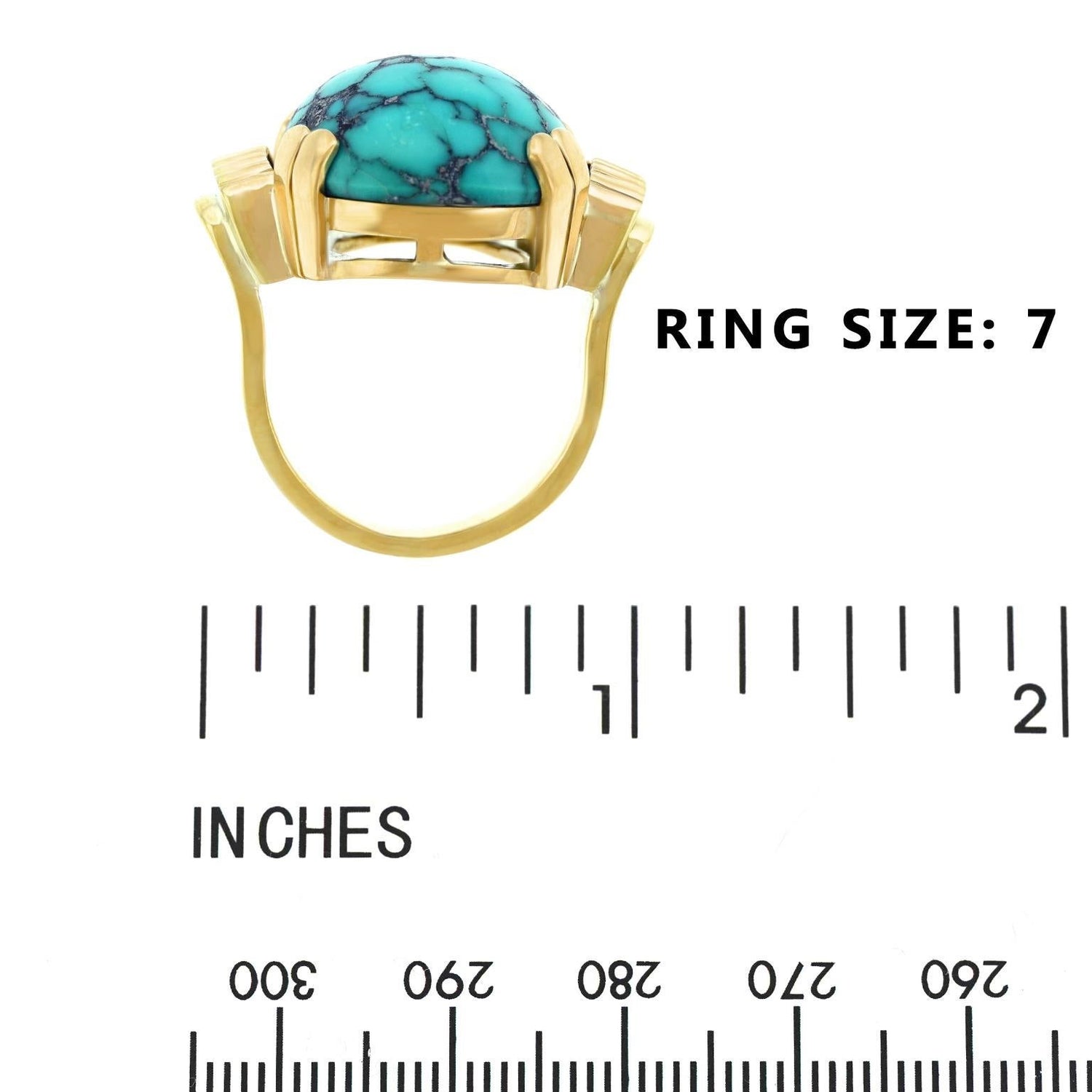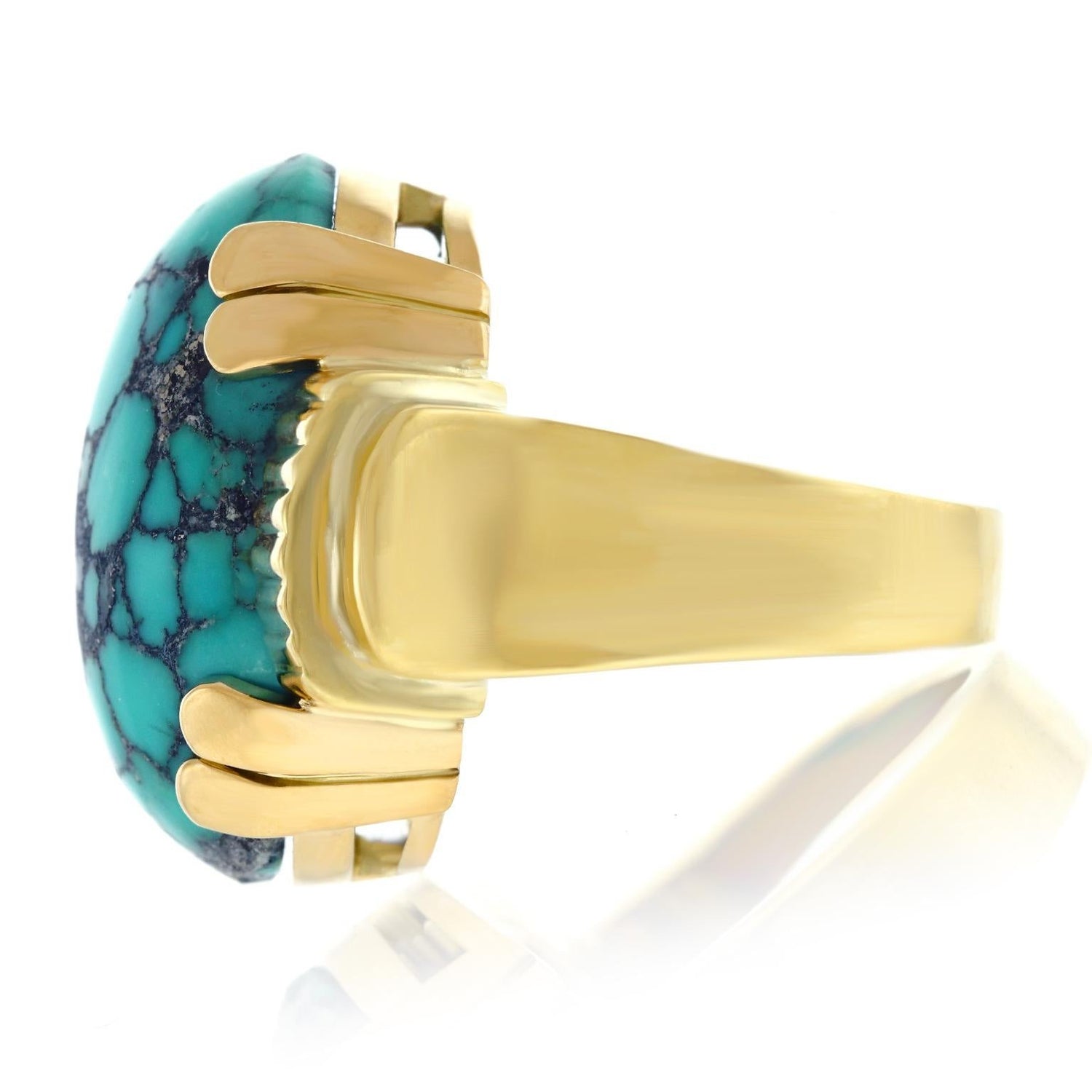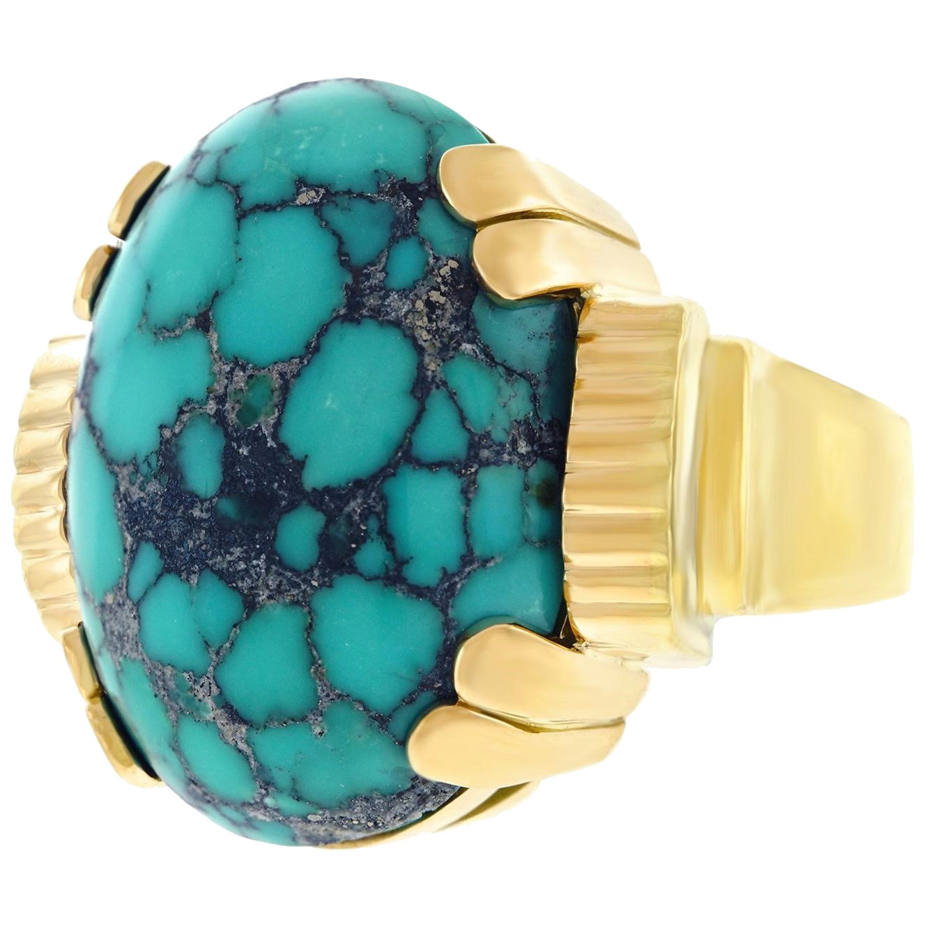 Circa 1950s, (element), Circa 2018 (Ring) 18k, Swiss. This big and bold ring features an especially finely figured, vibrant blue turquoise cabochon. The setting is fifties Swiss modern with style notes of industrial and deco, for a look that is vintage chic at its very best. Just right for everyday wear and finely fashioned, this ring is in excellent condition.