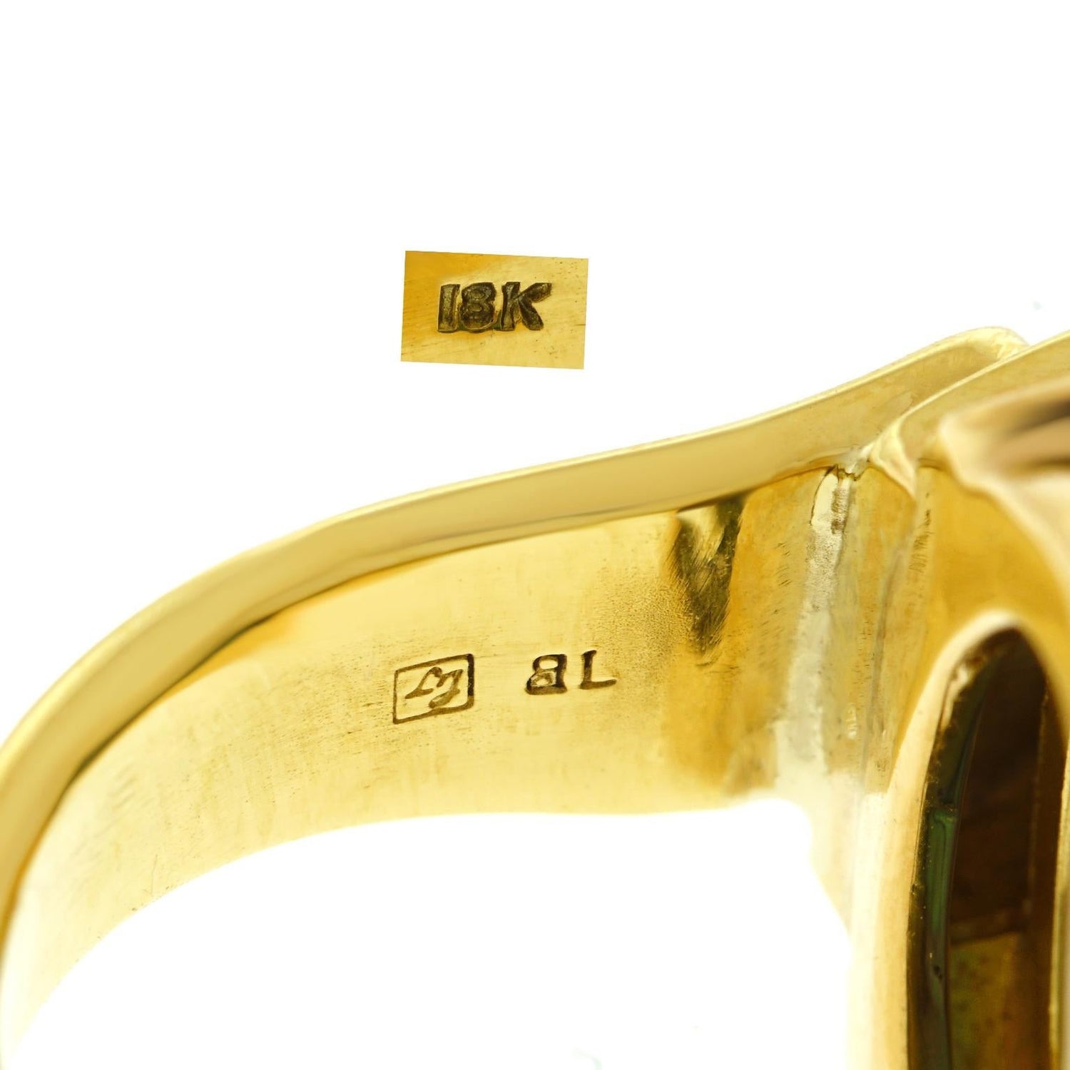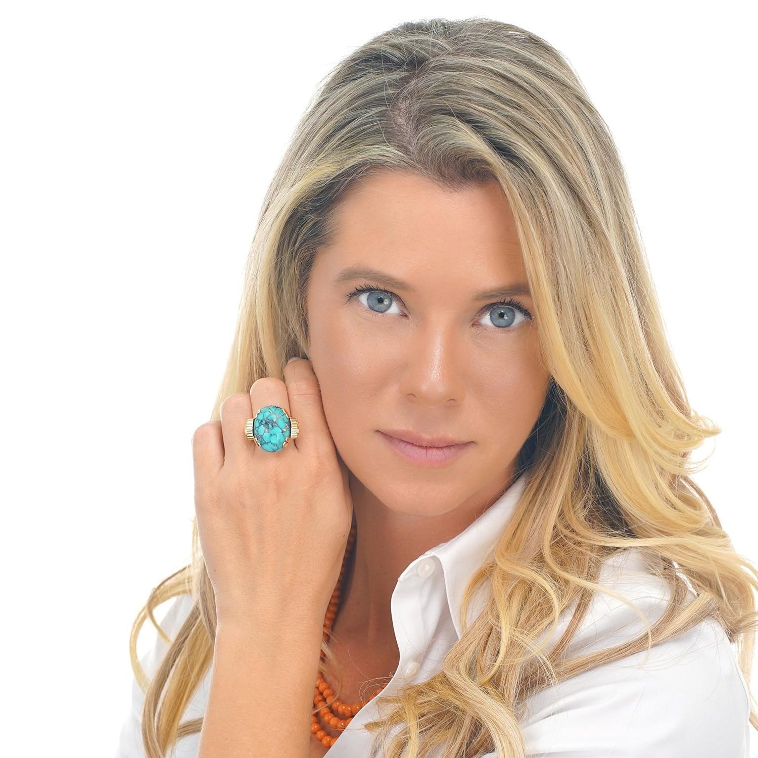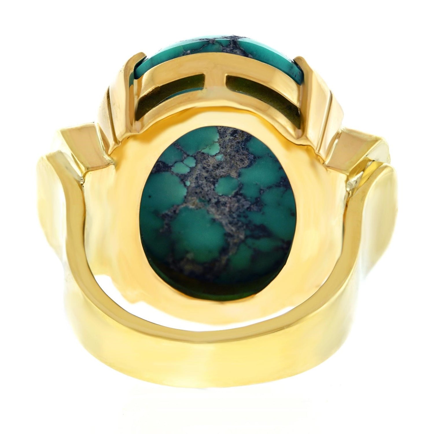 Circa 1950s, (element), Circa 2018 (Ring) 18k, Swiss. This big and bold ring features an especially finely figured, vibrant blue turquoise cabochon. The setting is fifties Swiss modern with style notes of industrial and deco, for a look that is vintage chic at its very best. Just right for everyday wear and finely fashioned, this ring is in excellent condition.