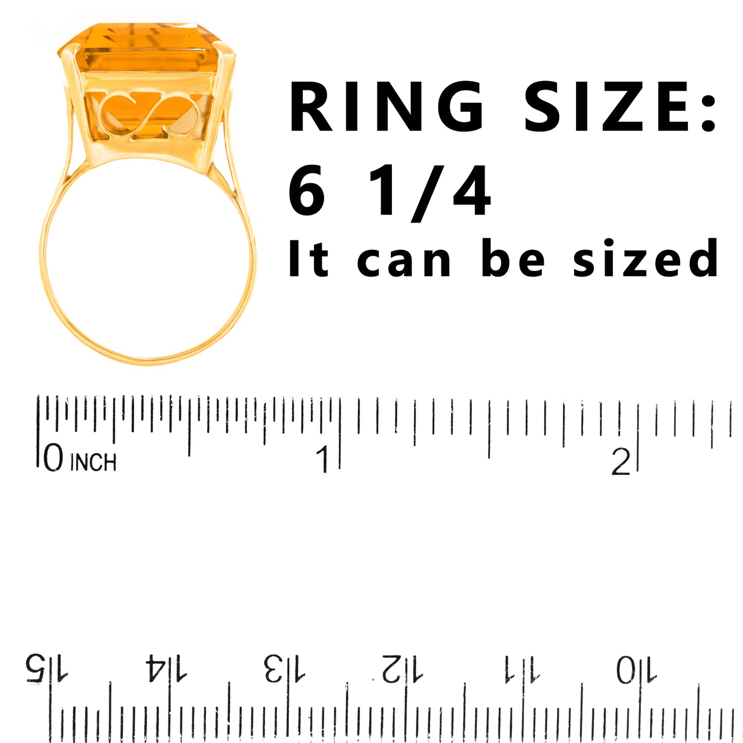 Circa 1940s, 14k.  This gorgeous forties ring is set with a beautifully-hued golden-orange 23.0-carat citrine. Its sleek retro design is perfect for casual to cocktail. Meticulously fabricated in 14k yellow gold, this ring is in excellent condition.