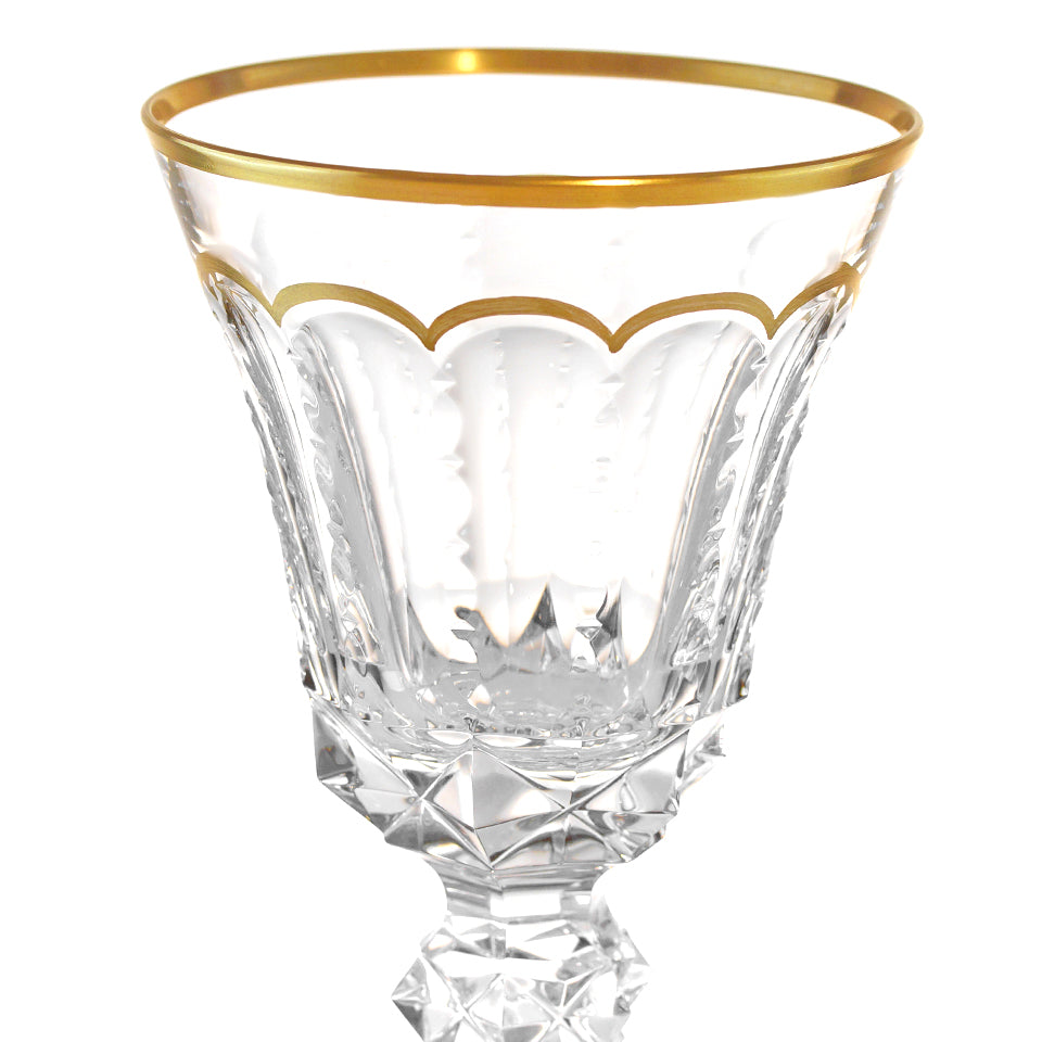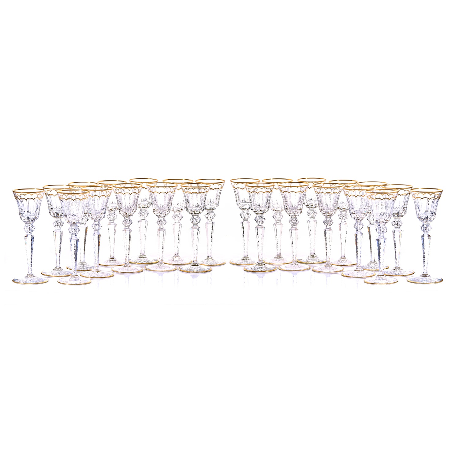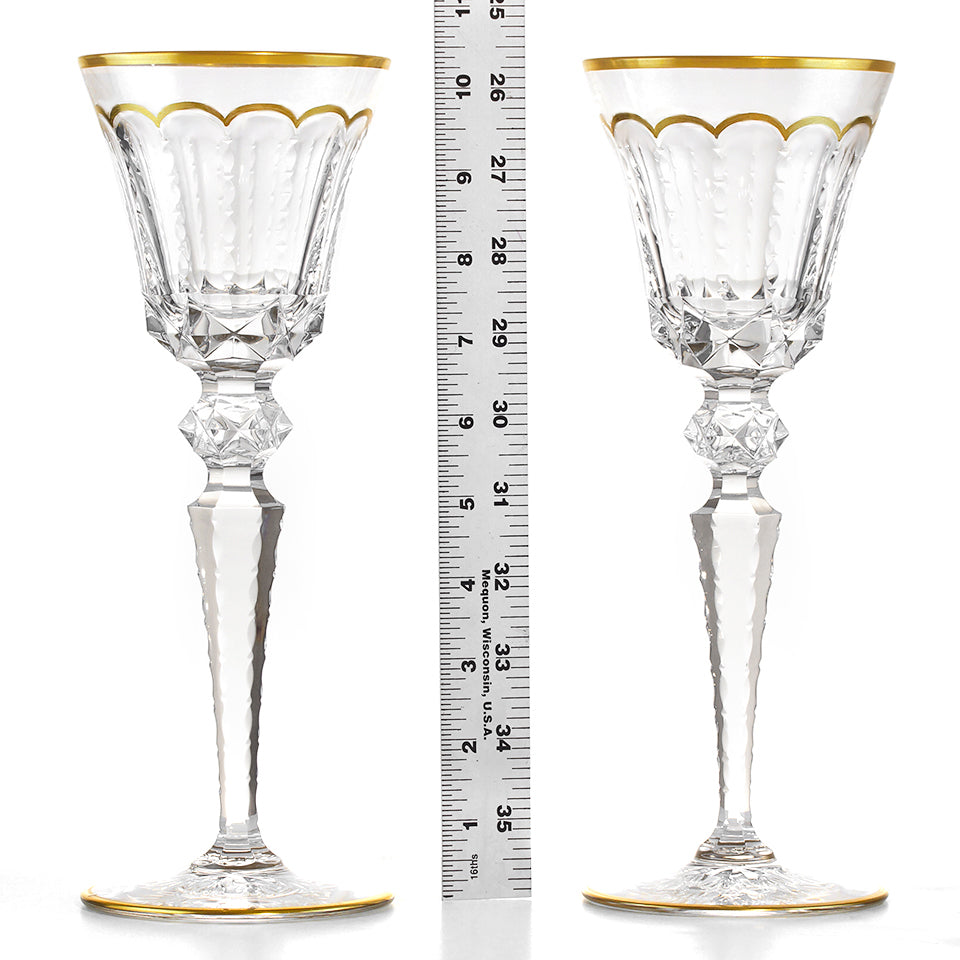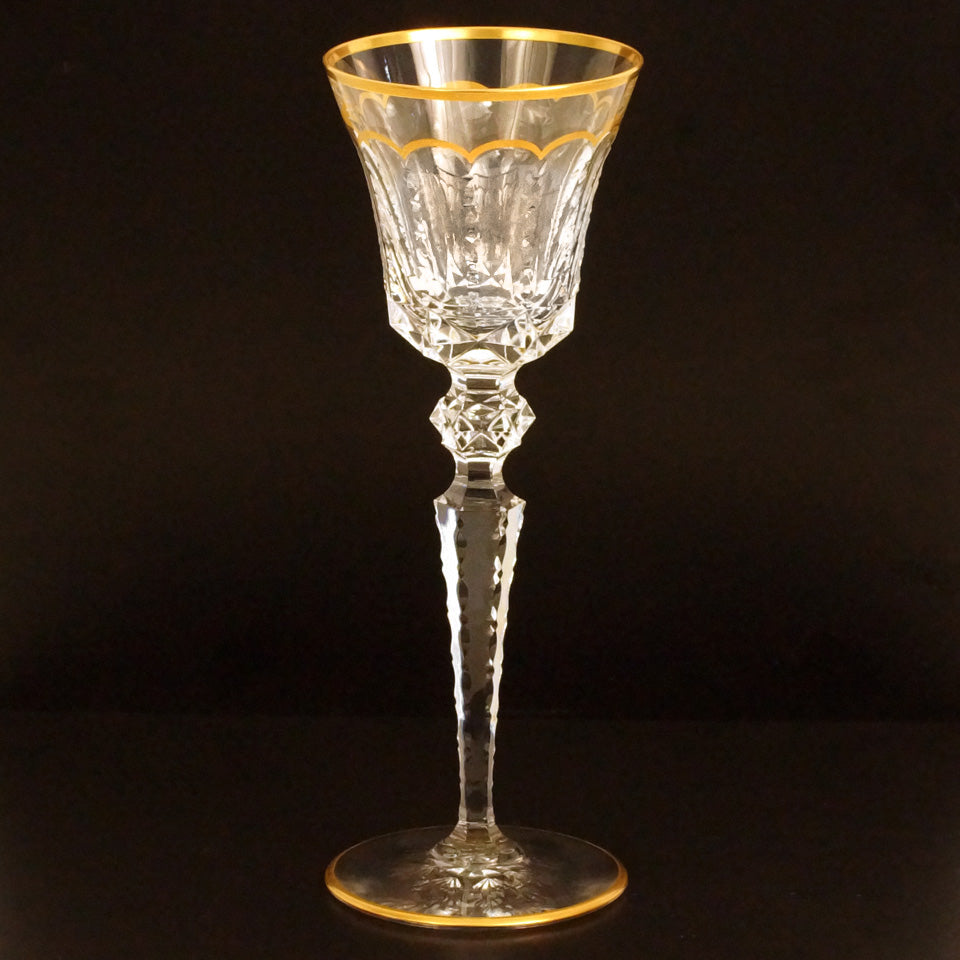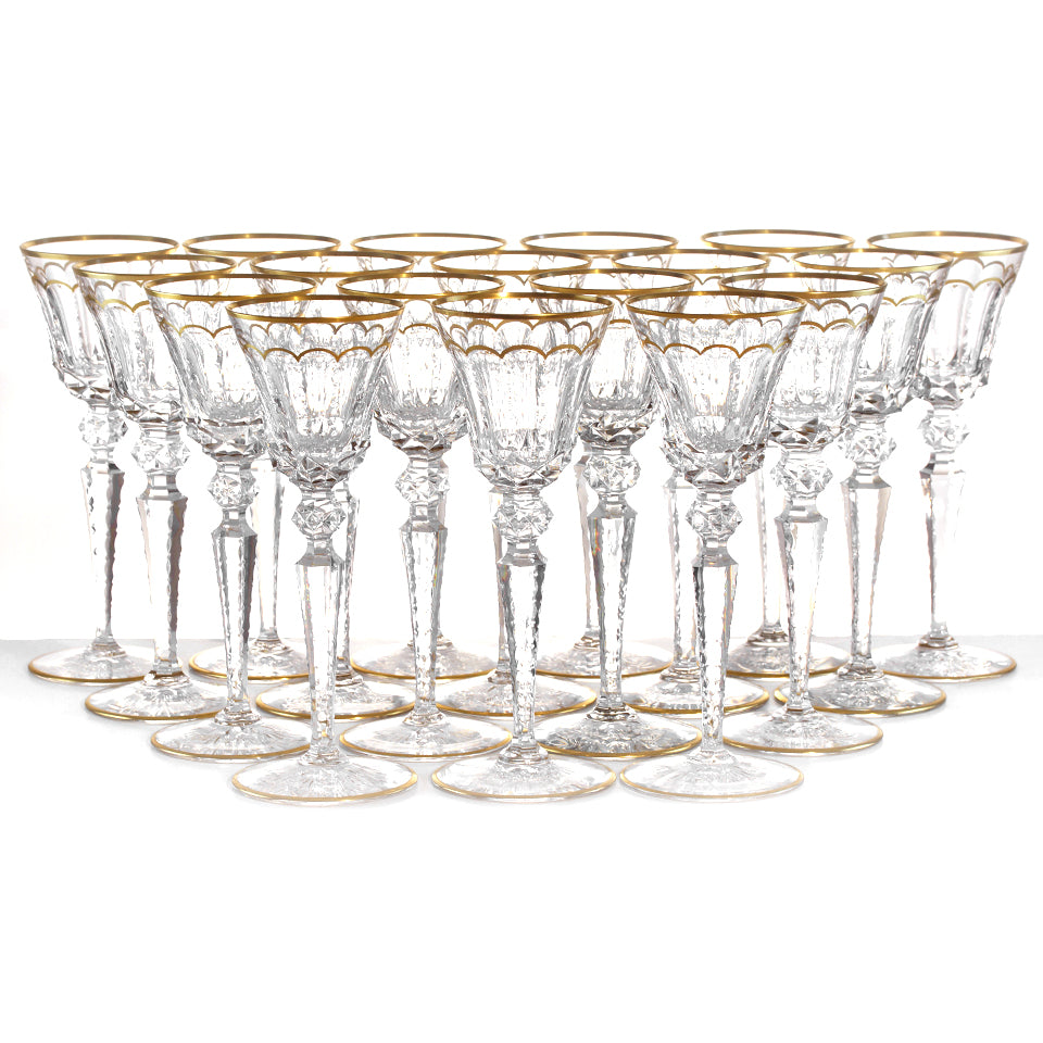 Circa 1967, St. Louis Crystal, France. Magnificently tall, these stunning St. Louis water goblets in the renowned “Excellence” pattern feature a detailed hand-cut pattern, gold trim, and impressive height (over ten inches). Setting a memorable table, this set of 24 was originally for water, however, in modern service they are most often used for wine. French cut-crystal is renowned for quality and style. St. Louis, still operating today, is one of France’s finest glass houses. Excellent condition.