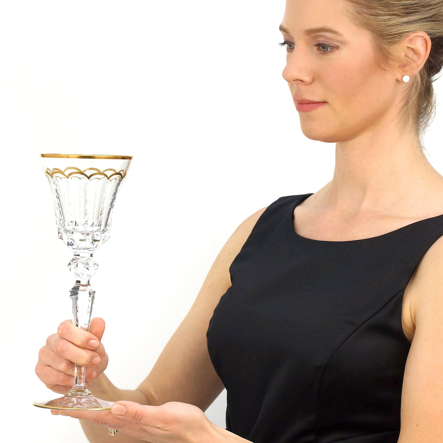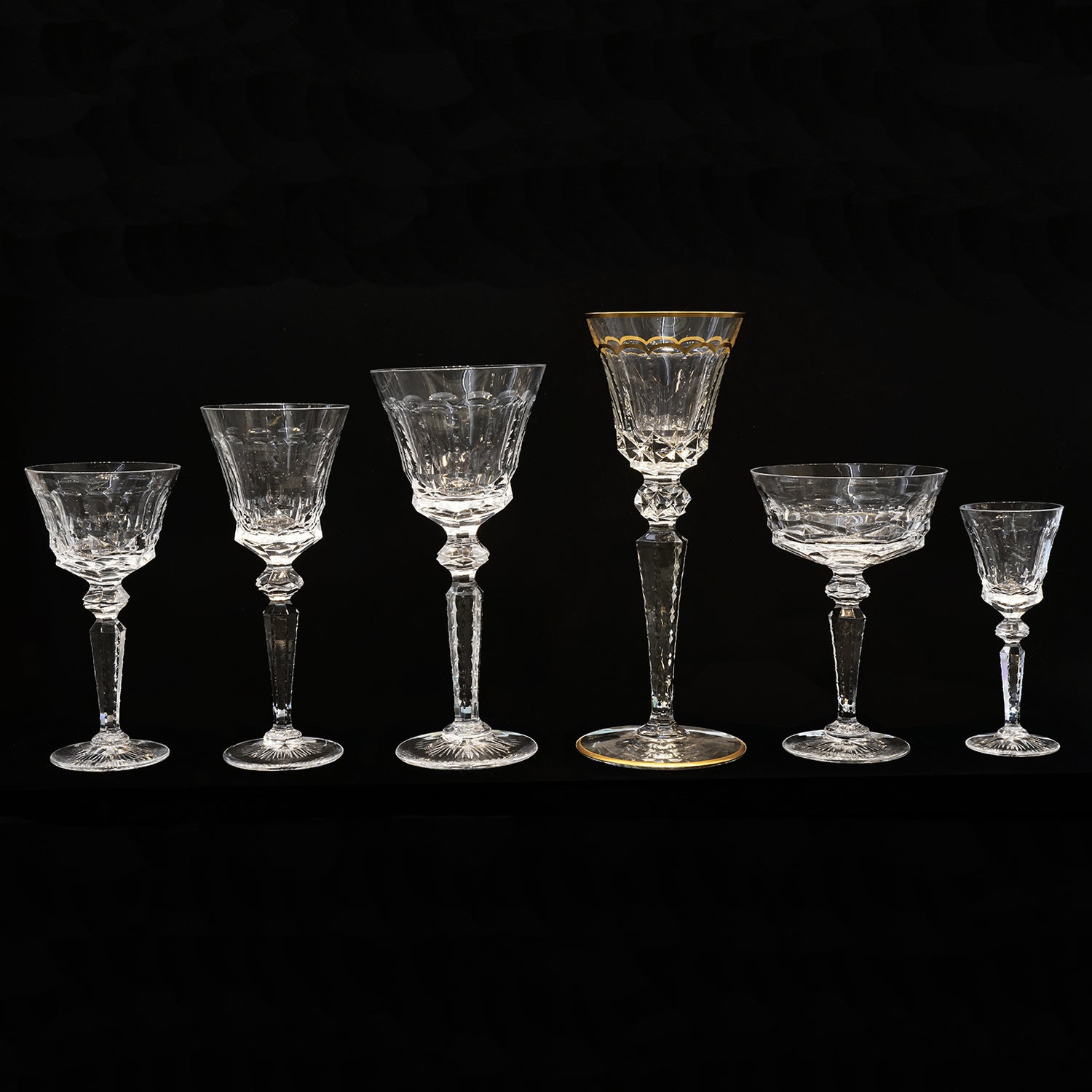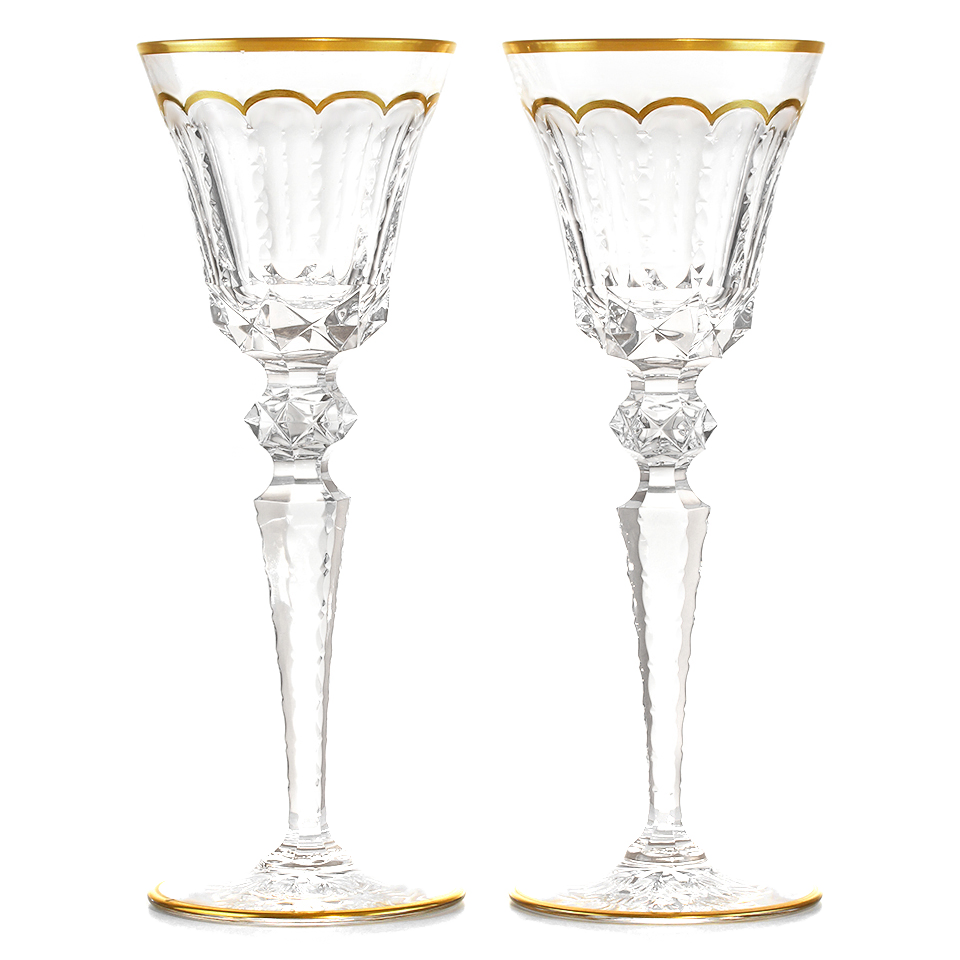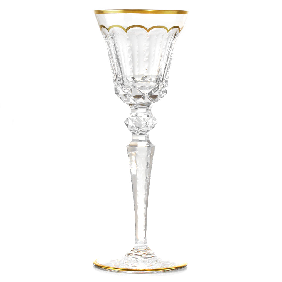 Circa 1967, St. Louis Crystal, France. Magnificently tall, these stunning St. Louis water goblets in the renowned “Excellence” pattern feature a detailed hand-cut pattern, gold trim, and impressive height (over ten inches). Setting a memorable table, this set of 24 was originally for water, however, in modern service they are most often used for wine. French cut-crystal is renowned for quality and style. St. Louis, still operating today, is one of France’s finest glass houses. Excellent condition.