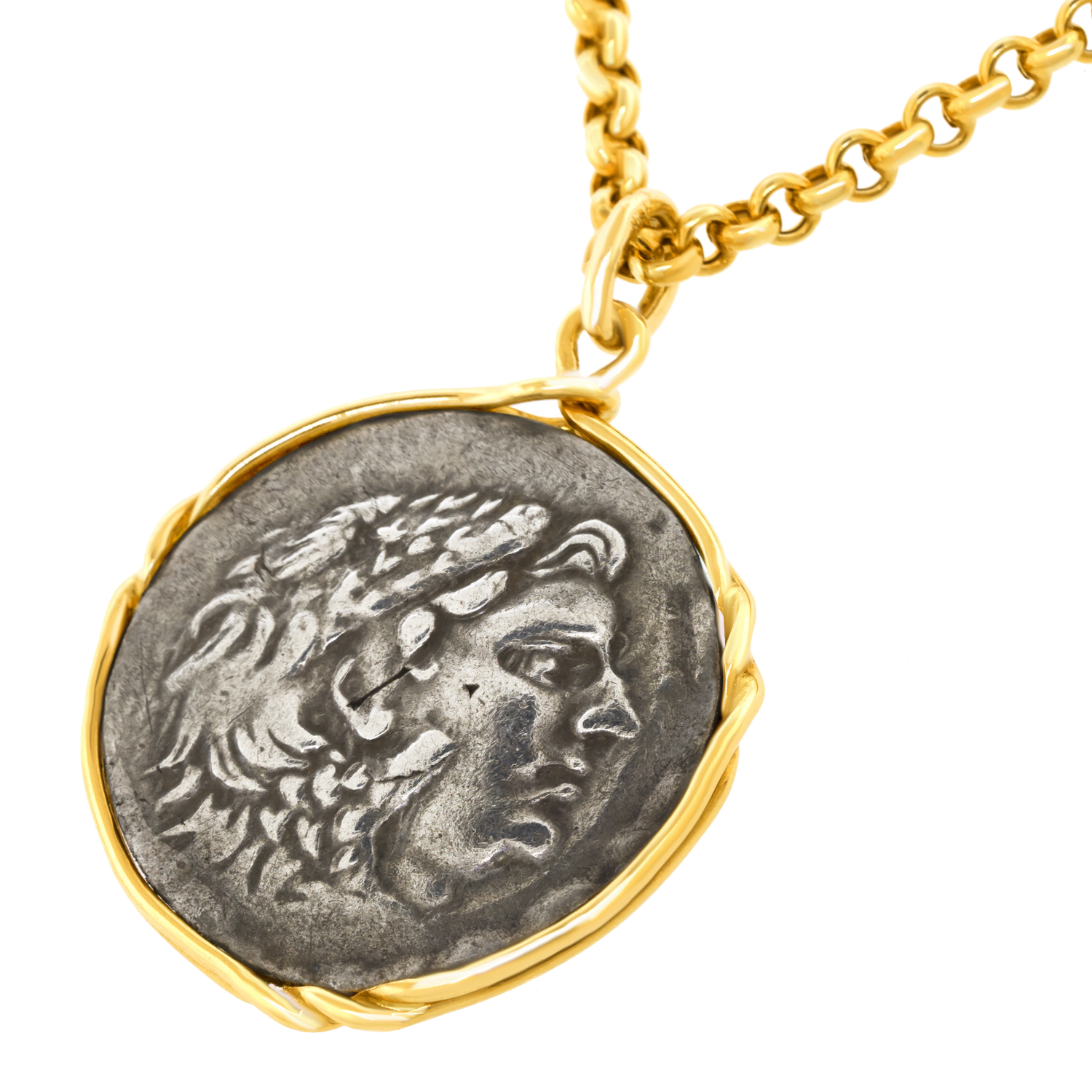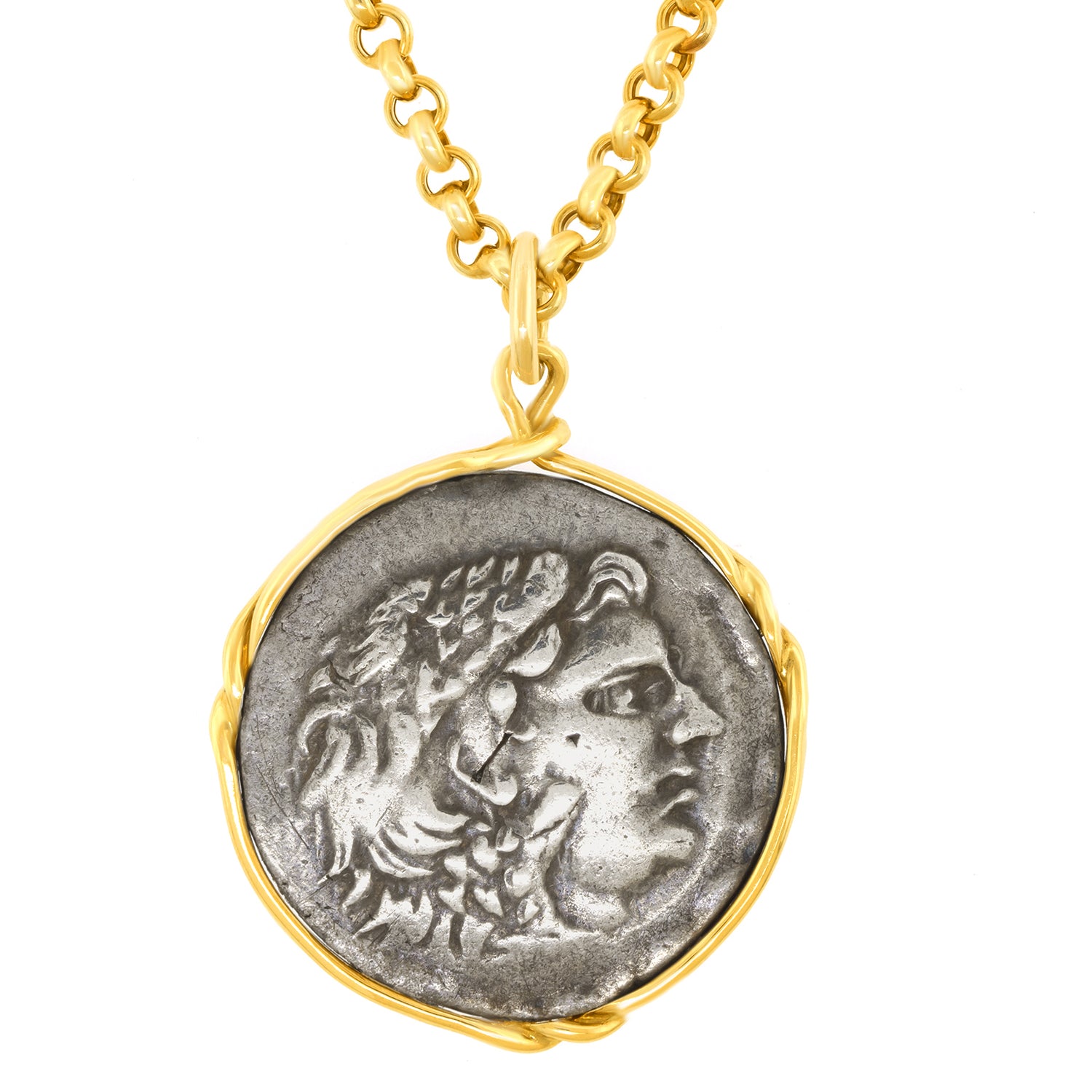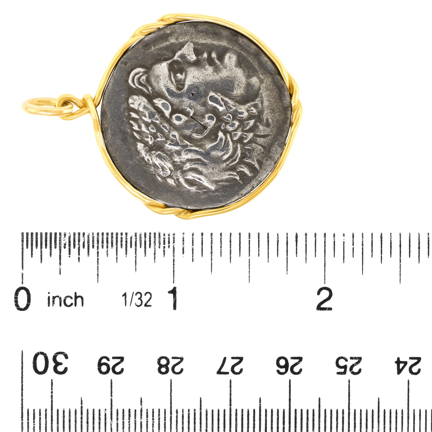 Circa 100 B.C., Silver Tetradrachm coin, Greece, with 14k frame, c1960s. A sleek yellow gold frame is the perfect foil for this extra large 2000+ year-old silver coin. The look is casually glamourous, effortlessly town and country, and brilliant in any moment of fashion. This necklace adds a stylish vintage look to any ensemble. Combine it with other pendants or talismans for a mythic, spiritual vibe. For over two millennia, this coin has passed through the hands of nobles, warriors, shamans, and brigands alike. Grasp the coin in your hand and let yourself be transported; it has touched untold thousands, each with a story. Superbly designed and fabricated, it is in excellent condition.