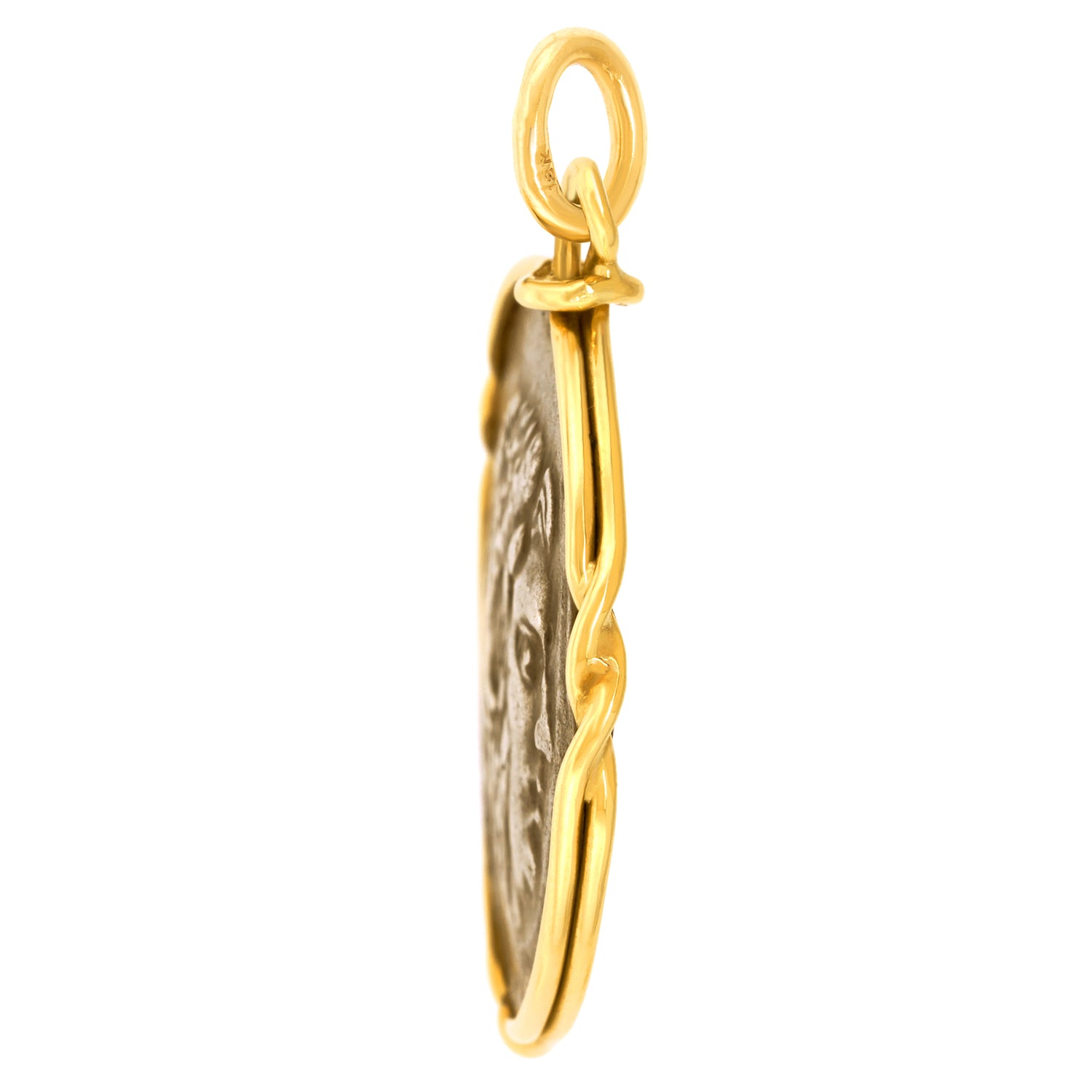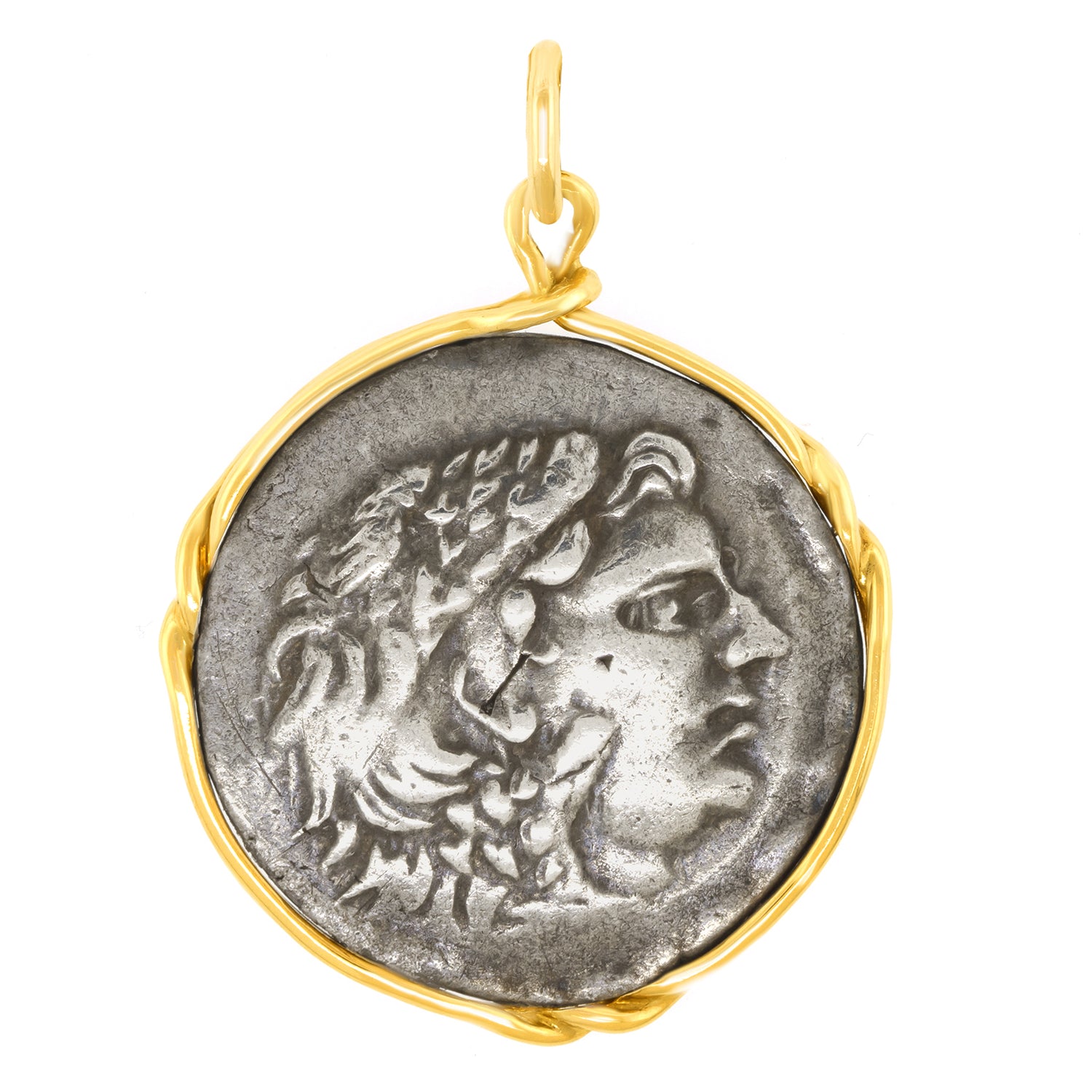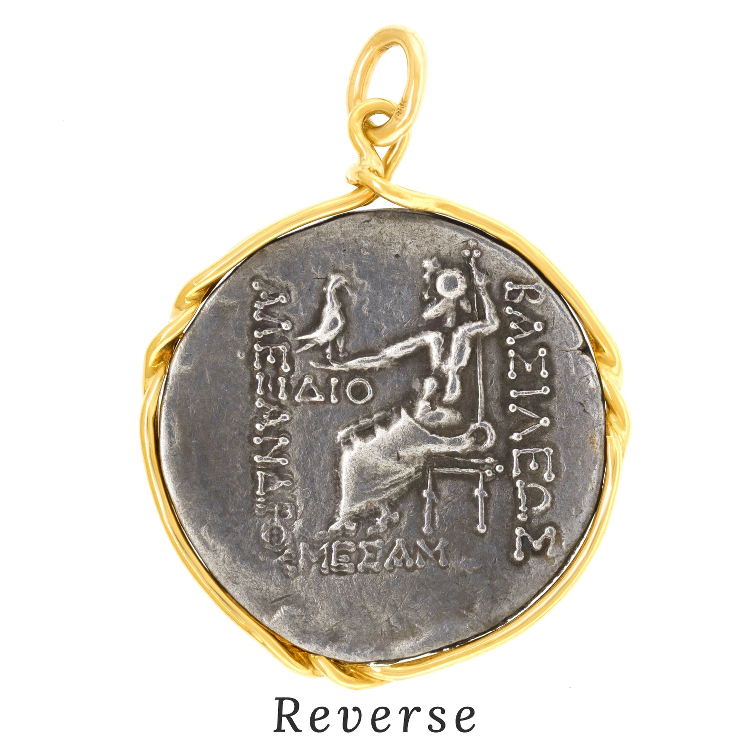 Circa 100 B.C., Silver Tetradrachm coin, Greece, with 14k frame, c1960s. A sleek yellow gold frame is the perfect foil for this extra large 2000+ year-old silver coin. The look is casually glamourous, effortlessly town and country, and brilliant in any moment of fashion. This necklace adds a stylish vintage look to any ensemble. Combine it with other pendants or talismans for a mythic, spiritual vibe. For over two millennia, this coin has passed through the hands of nobles, warriors, shamans, and brigands alike. Grasp the coin in your hand and let yourself be transported; it has touched untold thousands, each with a story. Superbly designed and fabricated, it is in excellent condition.