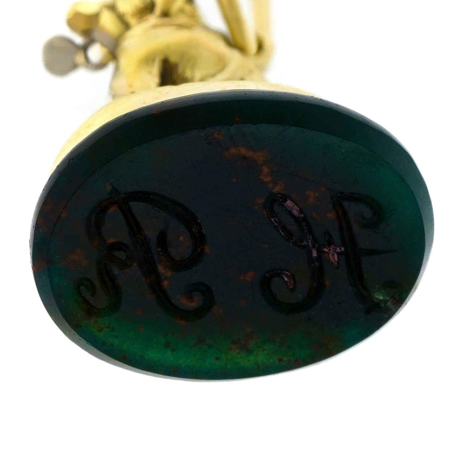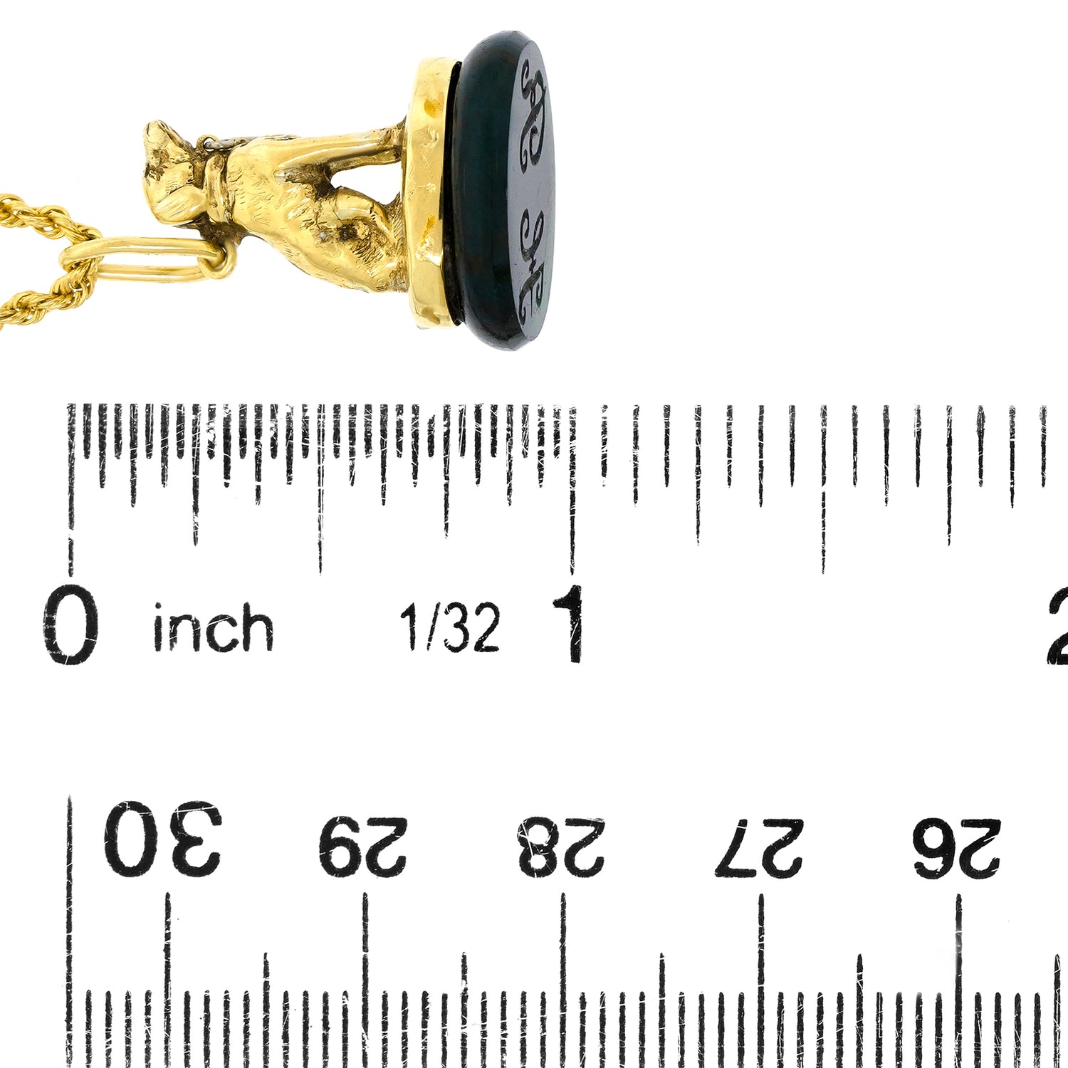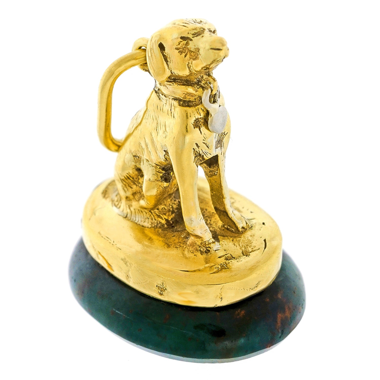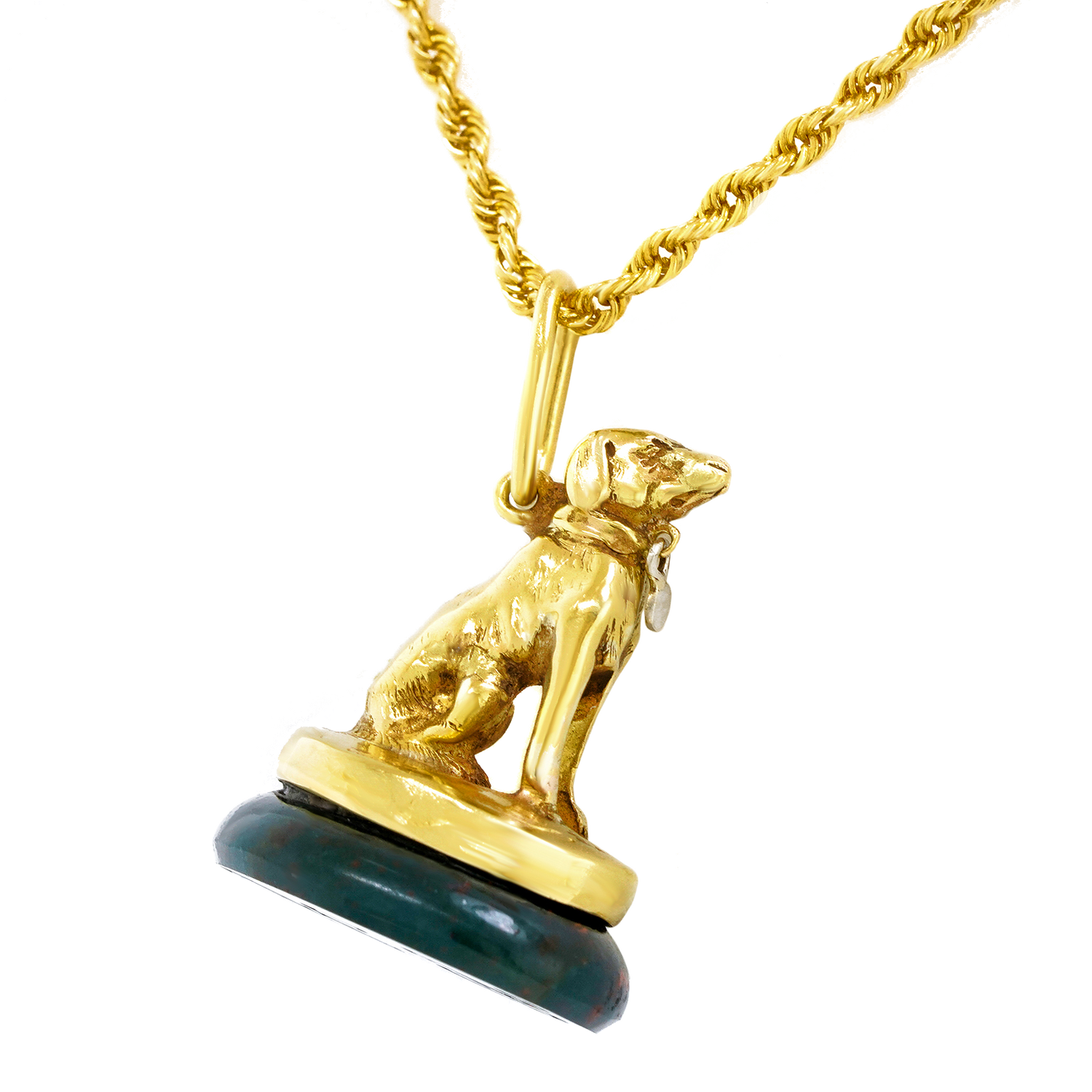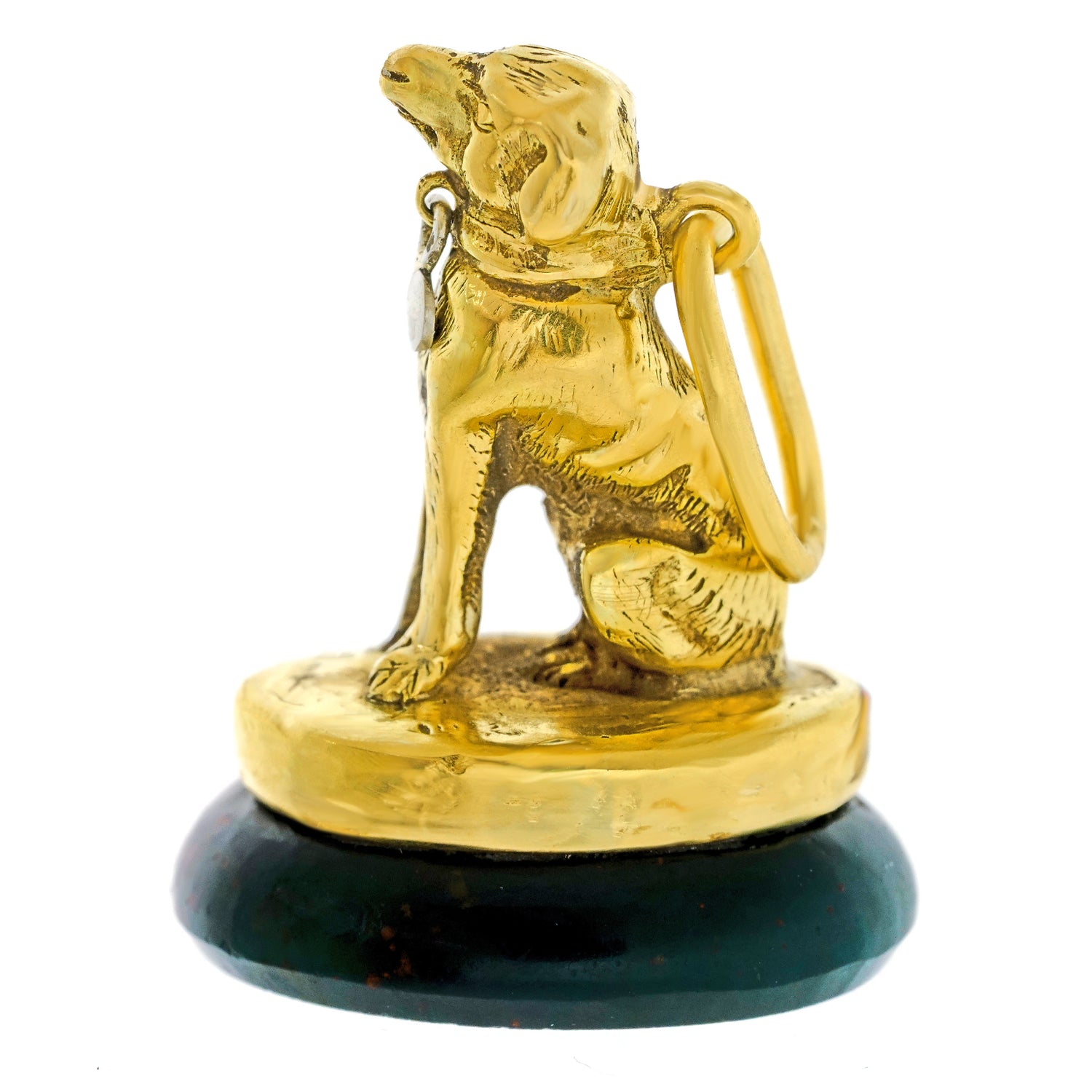 Circa 1880s, 18k, possibly English. Spectacular in every way, this dog fob is the perfect pendant. Finely figured in eighteen-karat yellow gold with a bloodstone base to complete the visual narrative, … authentically antique, is fashion truth. Excellent condition. Noted: The dog tag is a later addition.