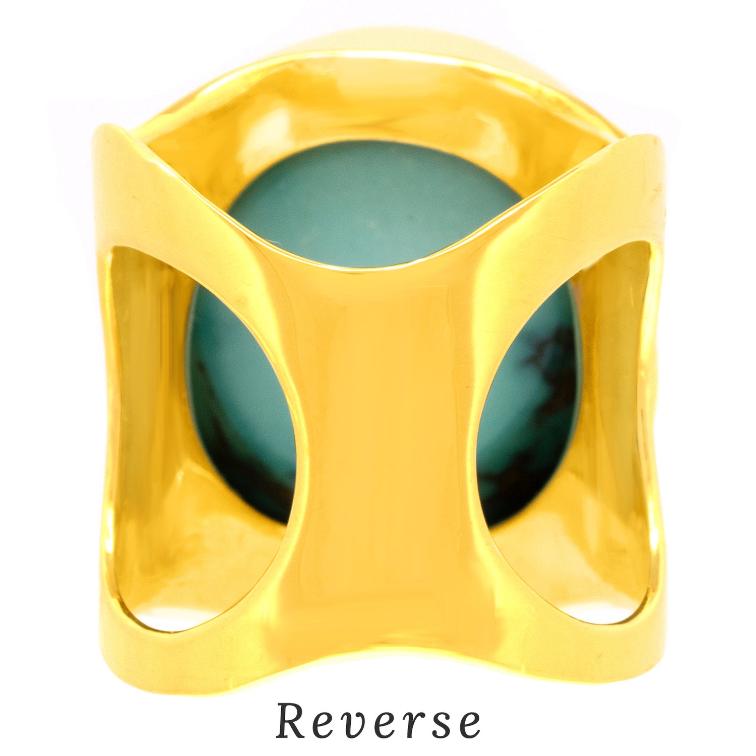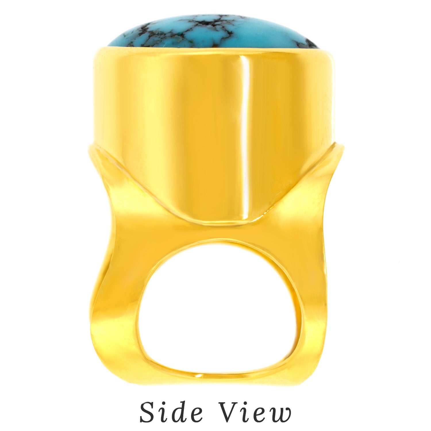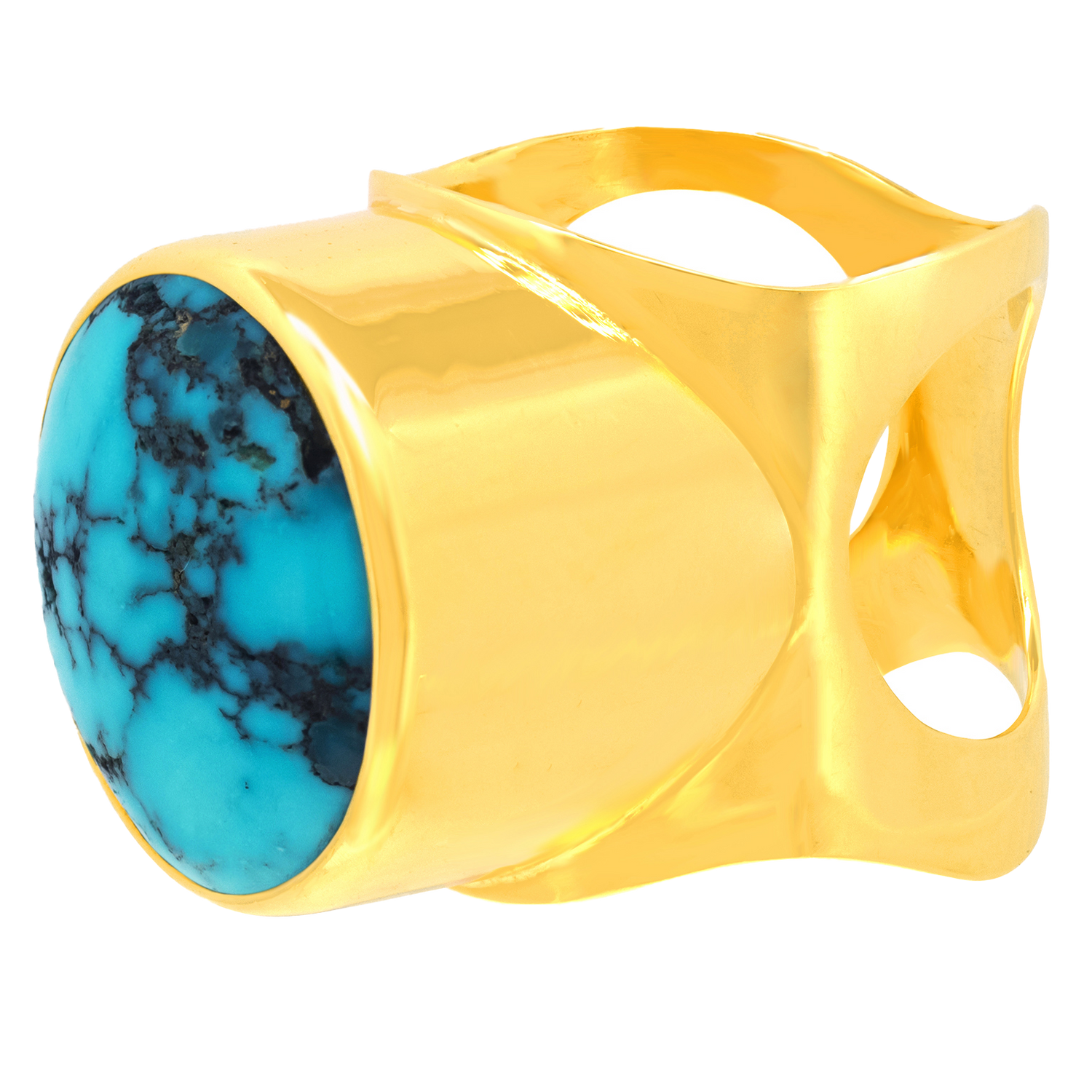 Circa 1970s, 18k, American. Beyond cool and past verve is where this fabulous seventies ring lives. The form is a wide band with cutout circles and a large turquoise set in a wonderful elongated collet or tube bezel. The look is elevated hippie chic and cover of Vogue! Well-made in eighteen-karat yellow, gold this ring is in excellent condition.