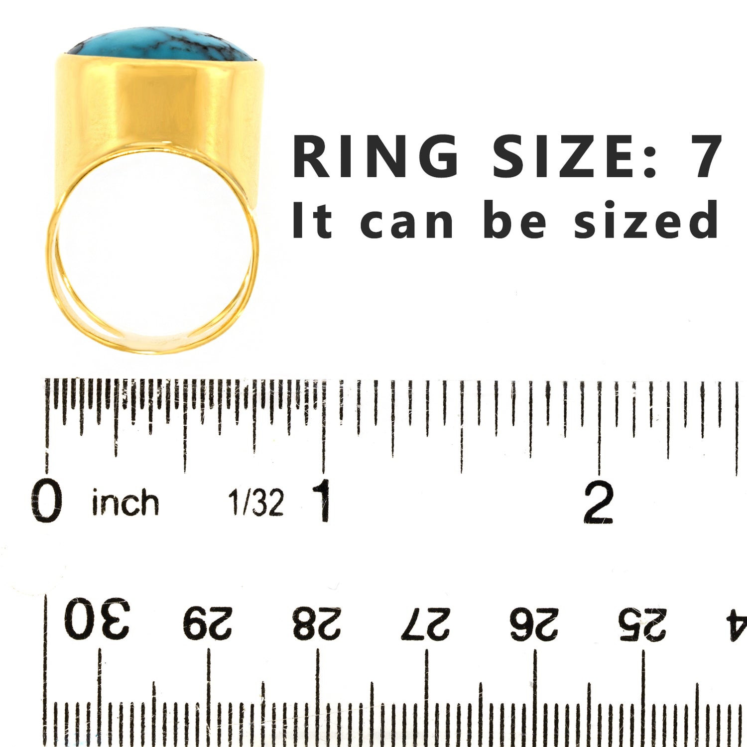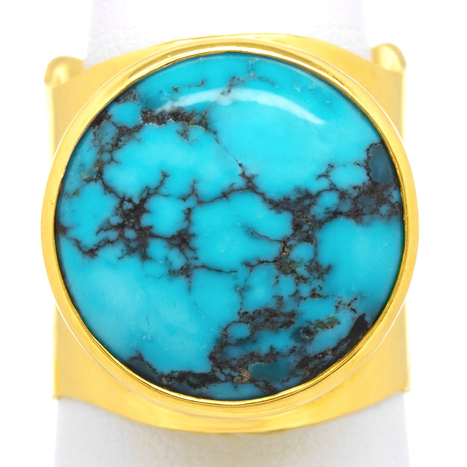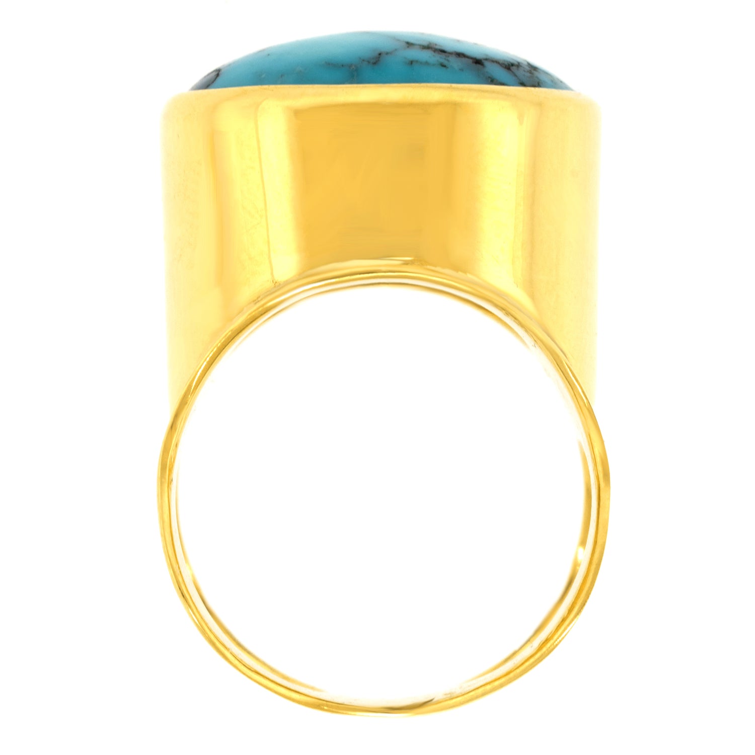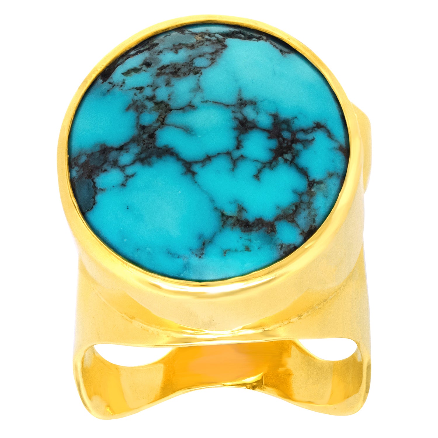 Circa 1970s, 18k, American. Beyond cool and past verve is where this fabulous seventies ring lives. The form is a wide band with cutout circles and a large turquoise set in a wonderful elongated collet or tube bezel. The look is elevated hippie chic and cover of Vogue! Well-made in eighteen-karat yellow, gold this ring is in excellent condition.