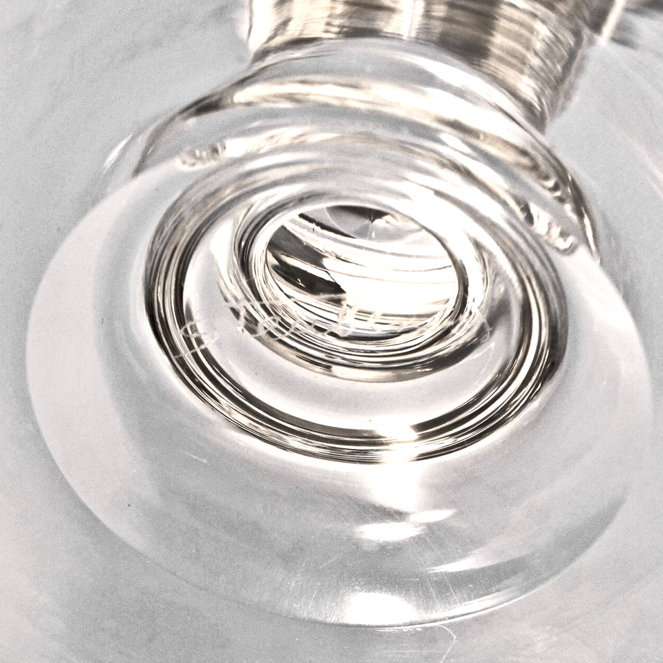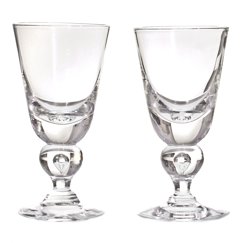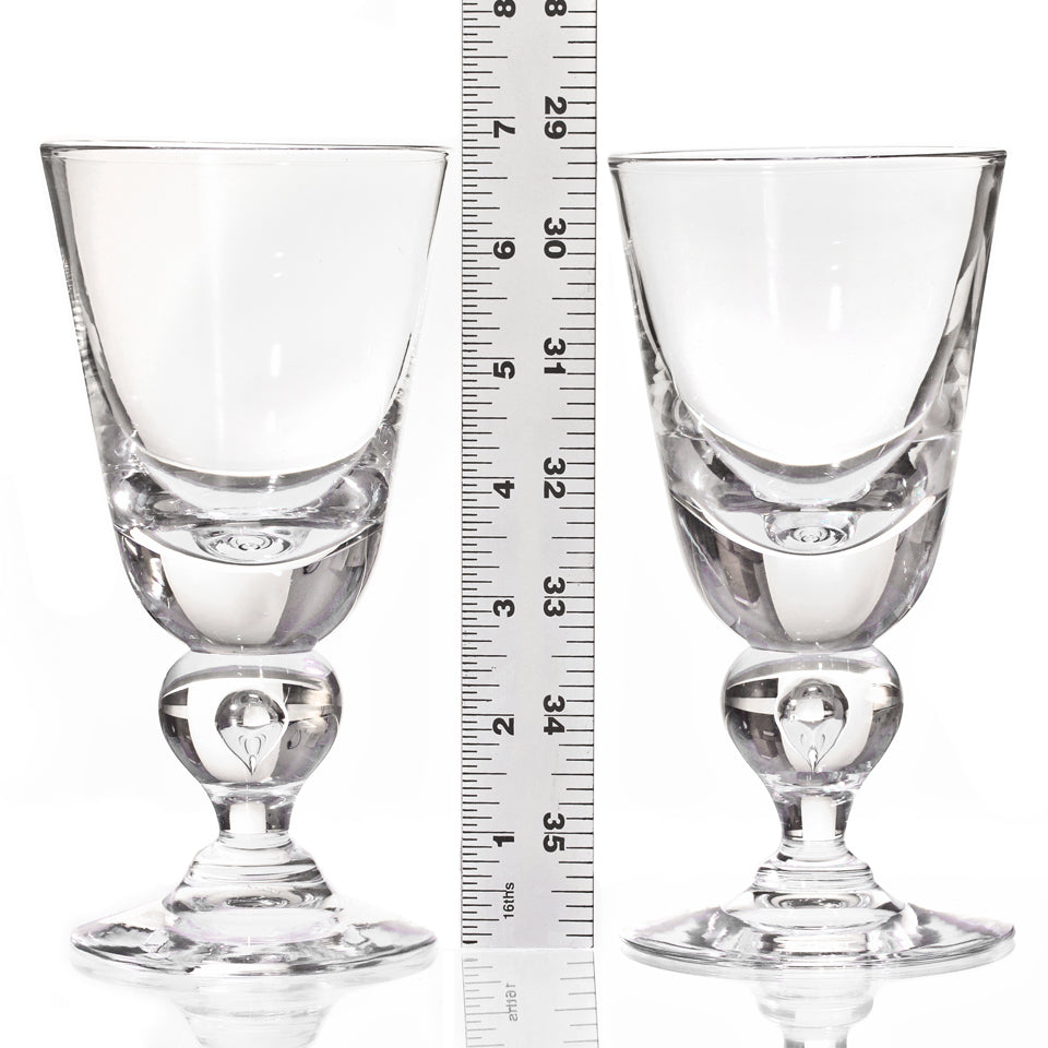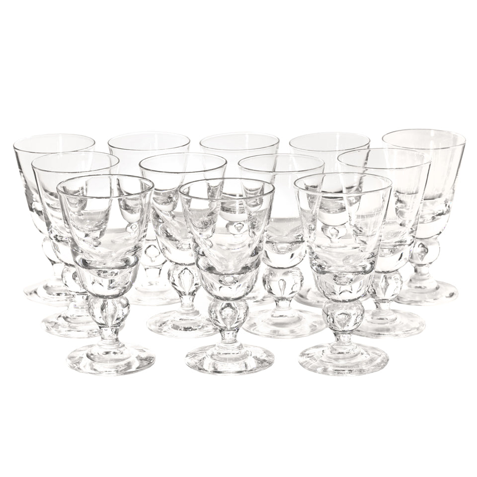 Circa 1940, by the Steuben Glass Works, Corning, NY. Known as the #7877 baluster stem, this is the most coveted of all modernist glasses. Intended as a water glass, today these goblets find more usage as wine goblets. This George Thompson design is perfectly balanced, deliciously heavy in the hand, and visually pleasing, while conspicuously modern. Excellent condition.