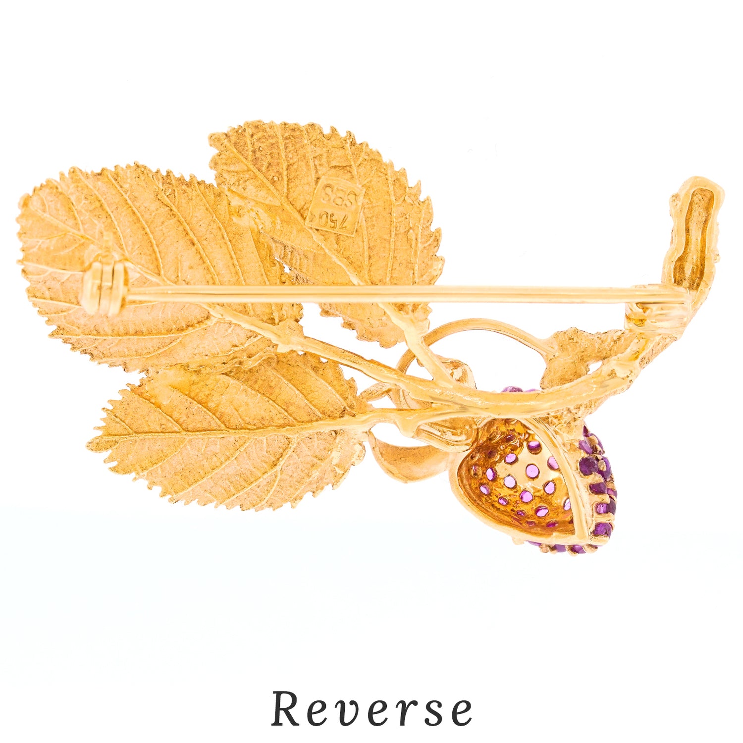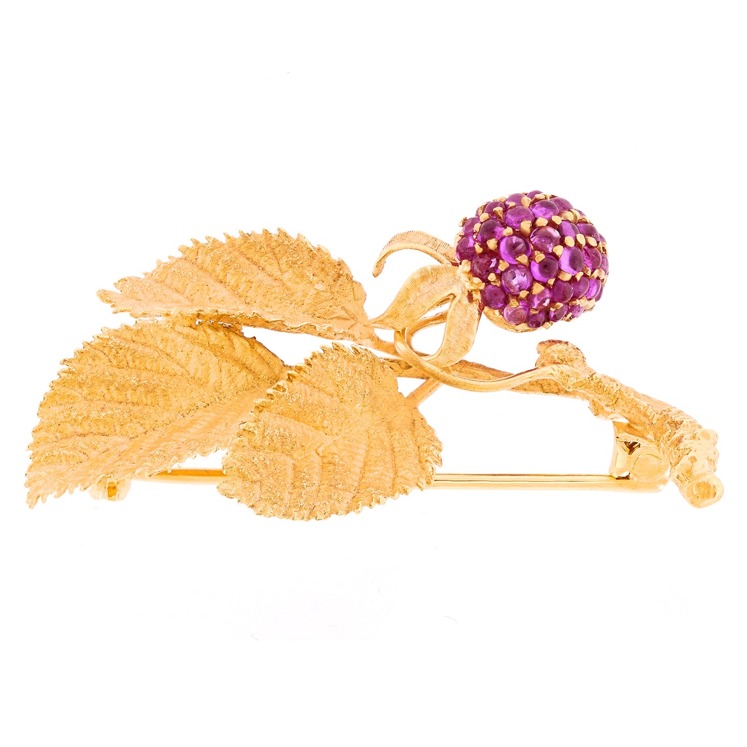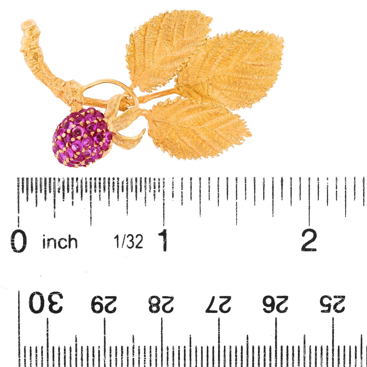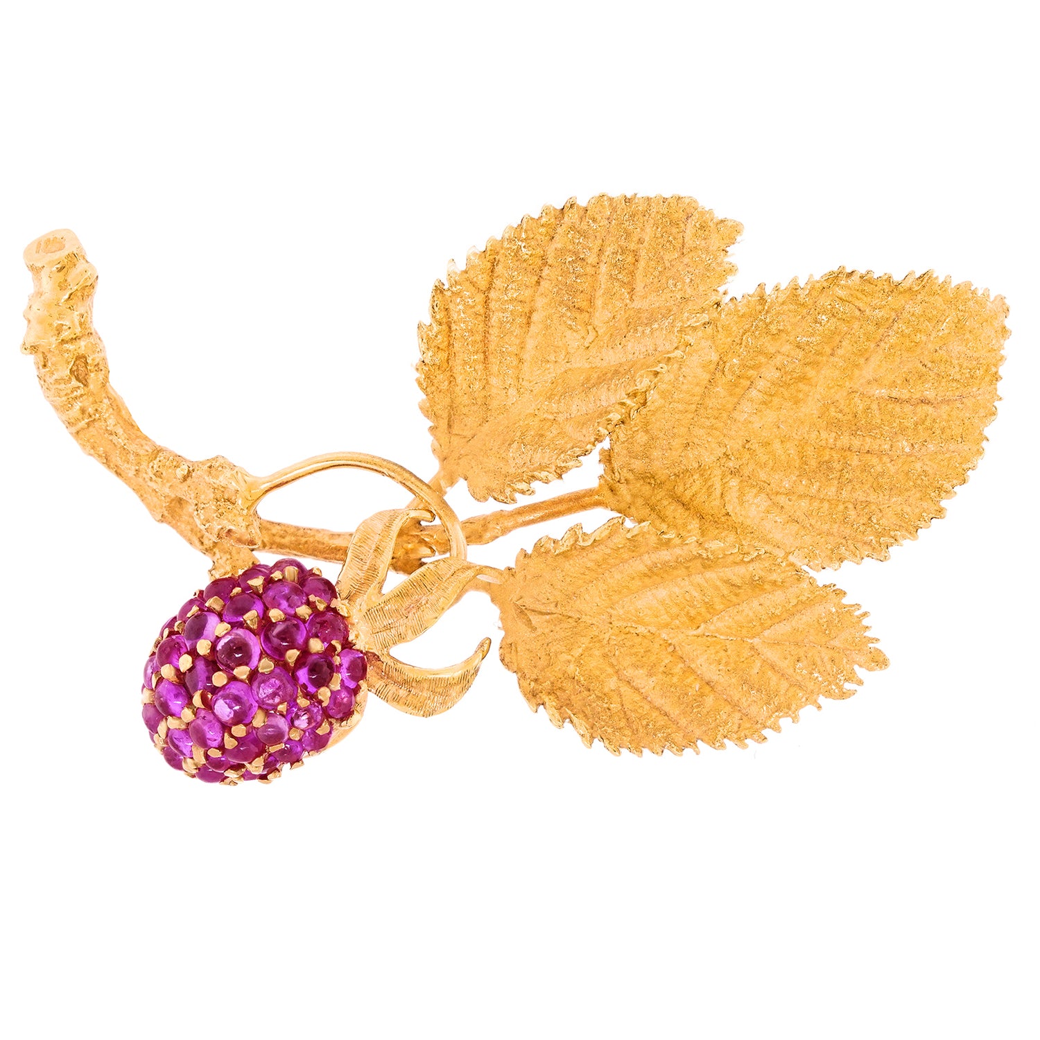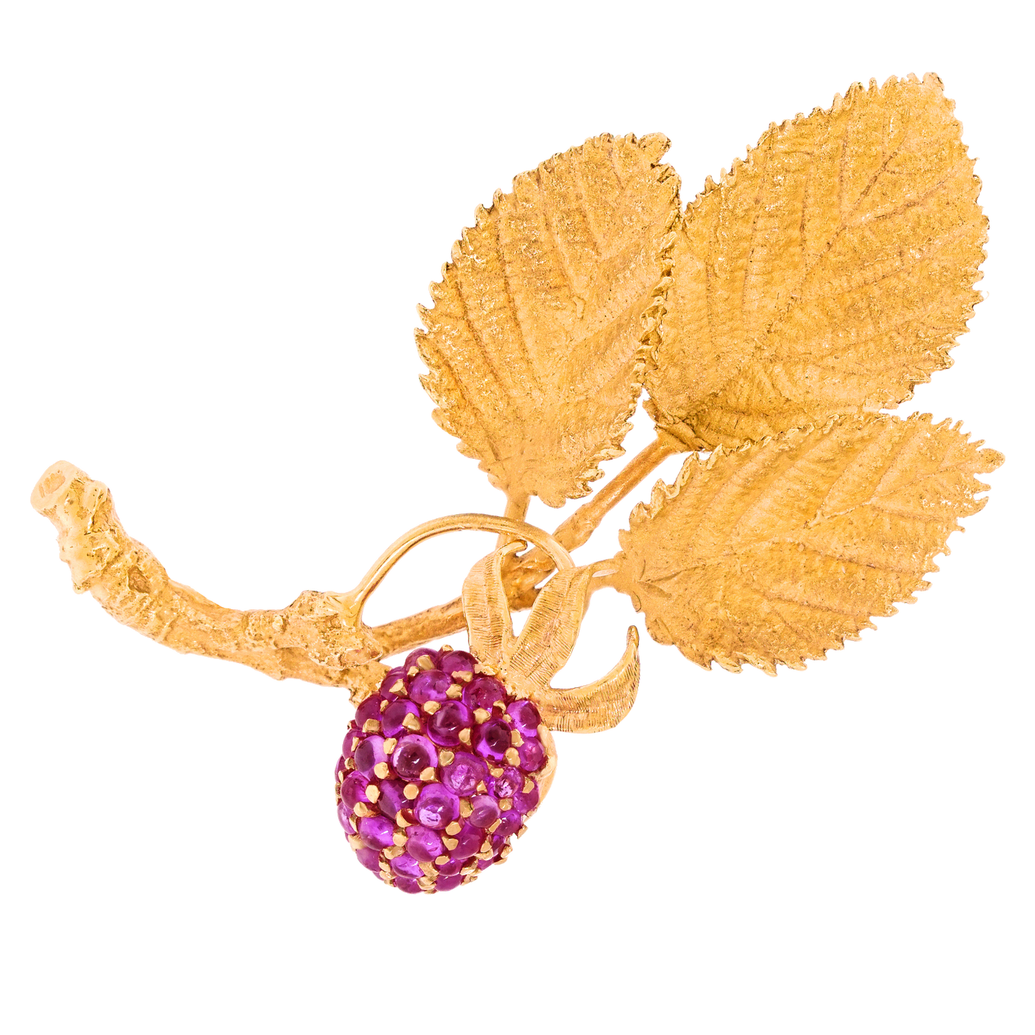 Circa 1960s, 18k, Switzerland. This charming raspberry and leaves brooch has a transcendent post-modern vibe redolent of chic contemporary moments yet to come. Lush deep pink sapphires are juxtaposed with gold leaves to create a look that is as elegant as it is timeless. Finely fashioned, it is in excellent condition.