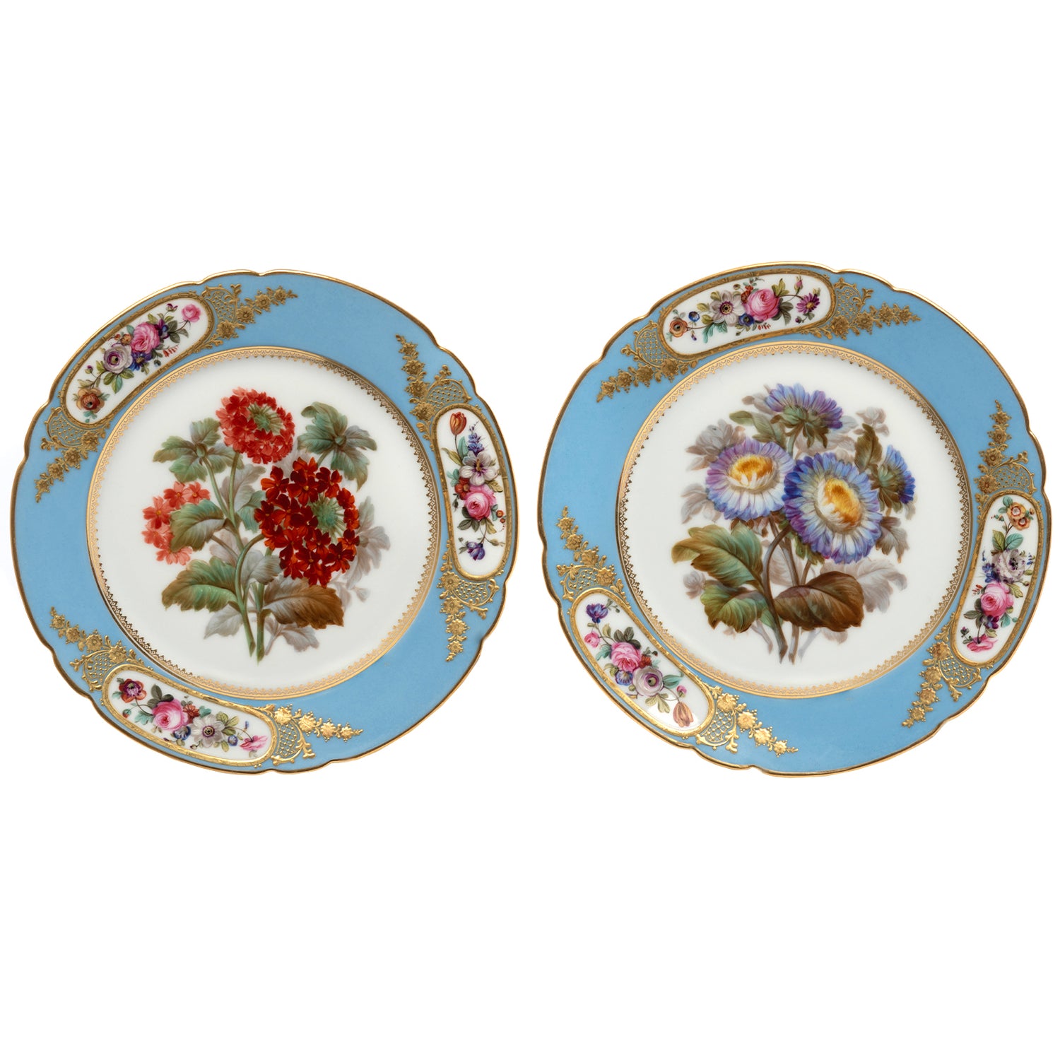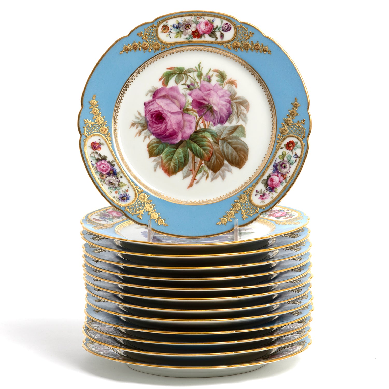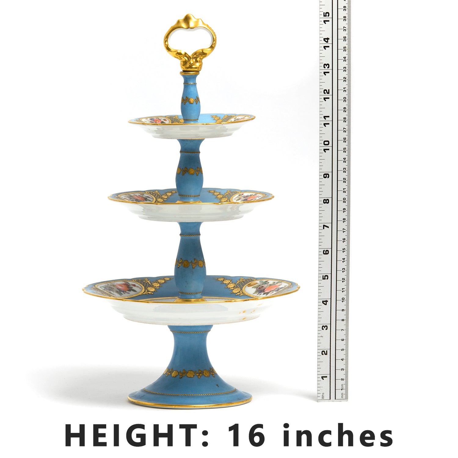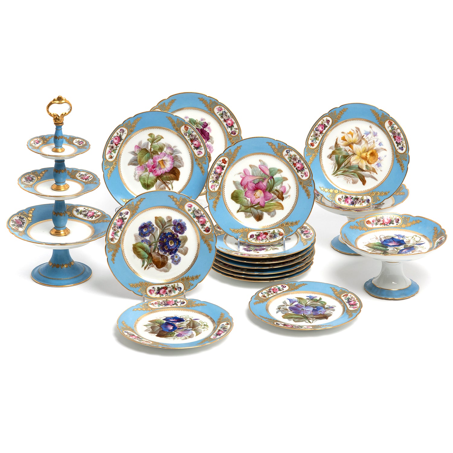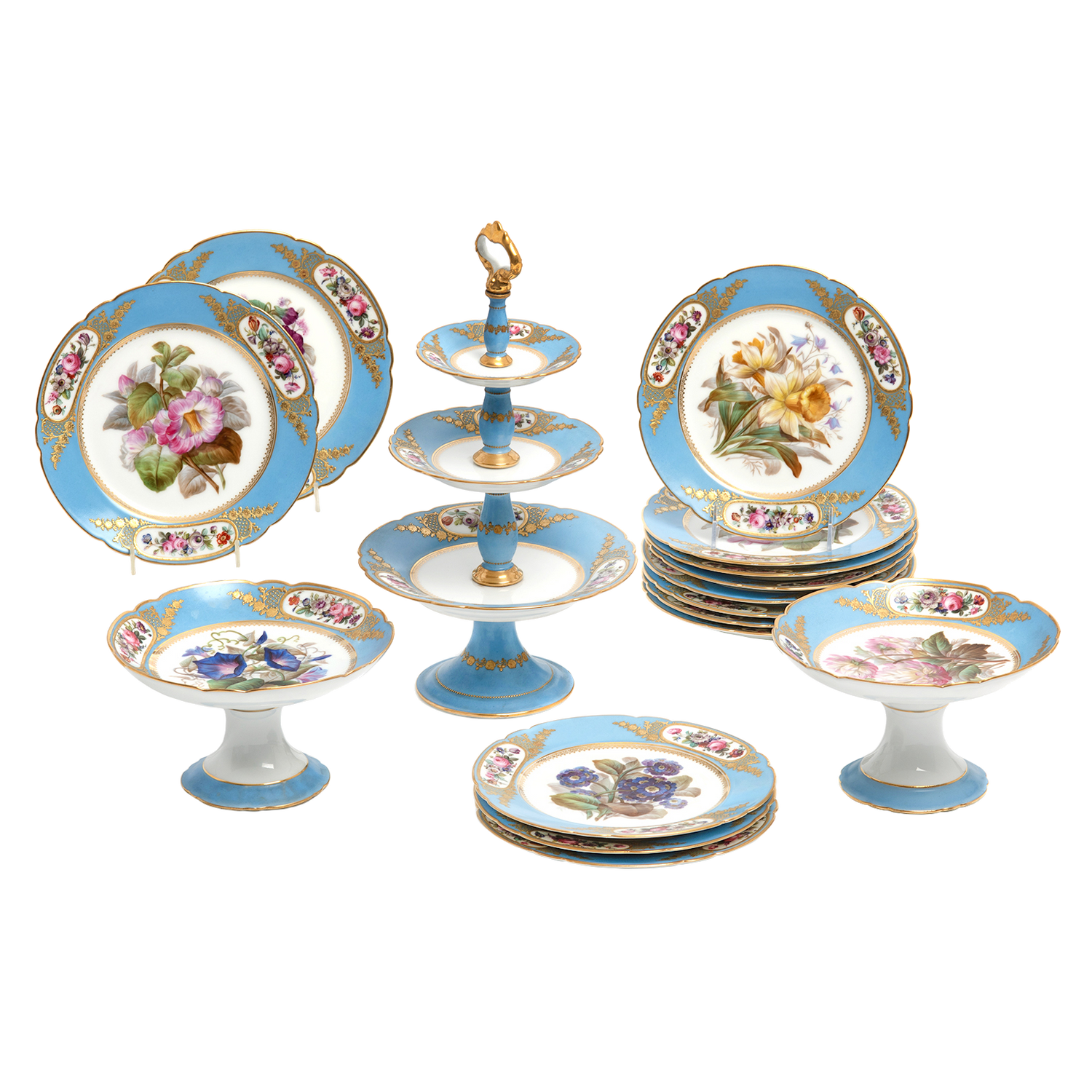 Circa 1840s, by Françiois-Eugene Rousseau, Paris, France. Hand-painted and multi-motif, this gold medal one-of-a-kind set is stunning! Old school Parisian charm at its museum quality best, this set includes thirteen plates, two tazzas, and one 3-tier dessert or petit fours stand. Excellent condition.
