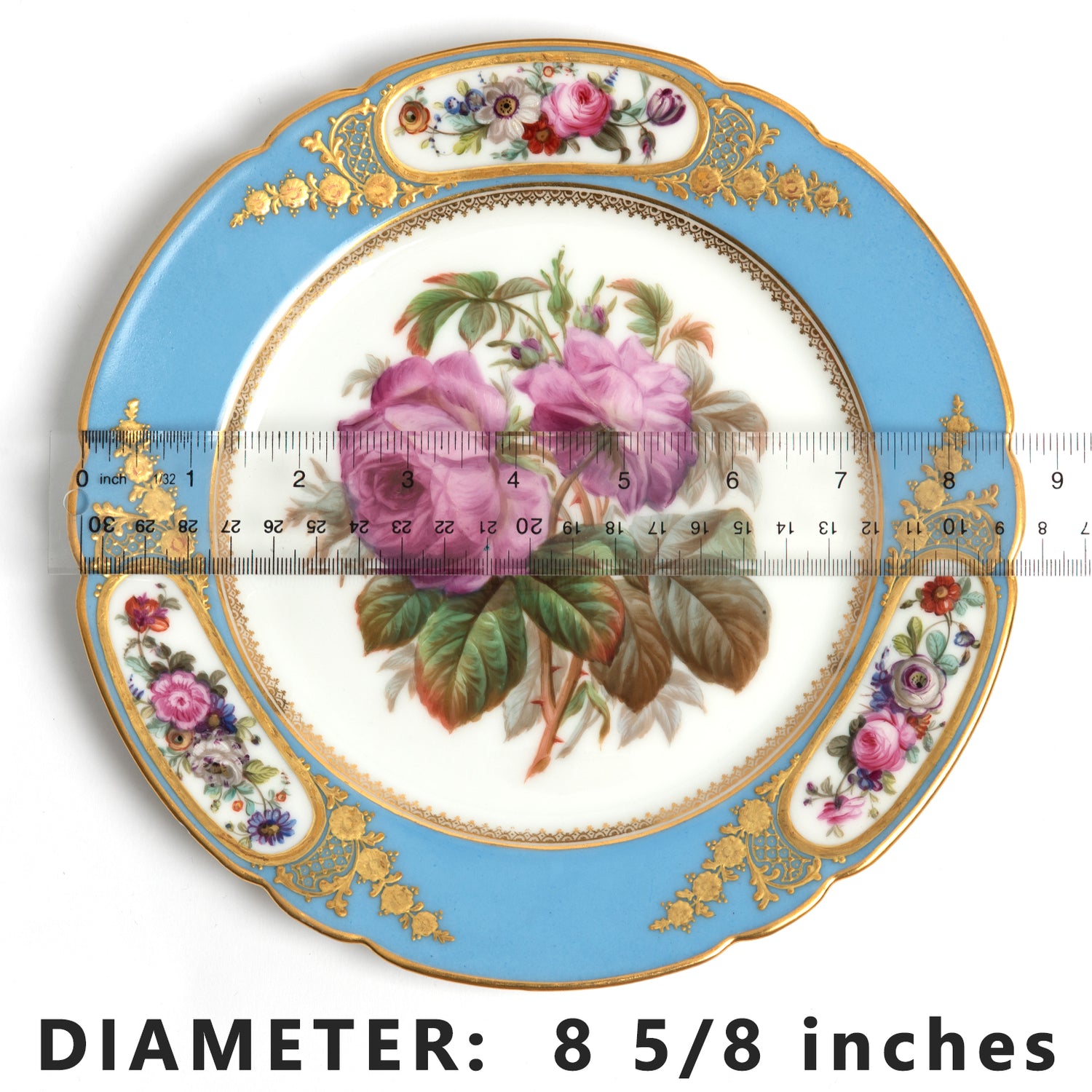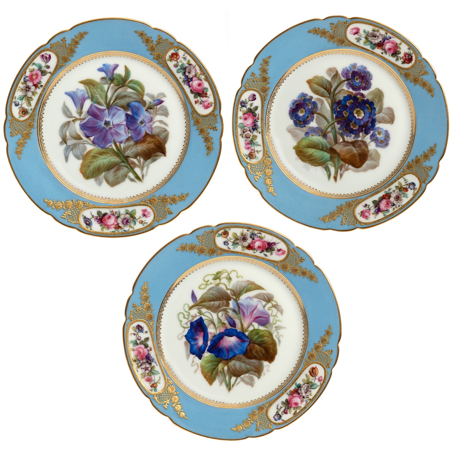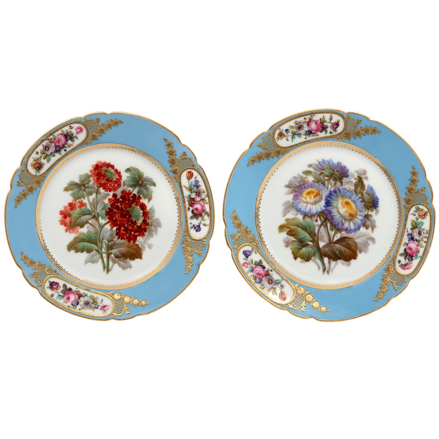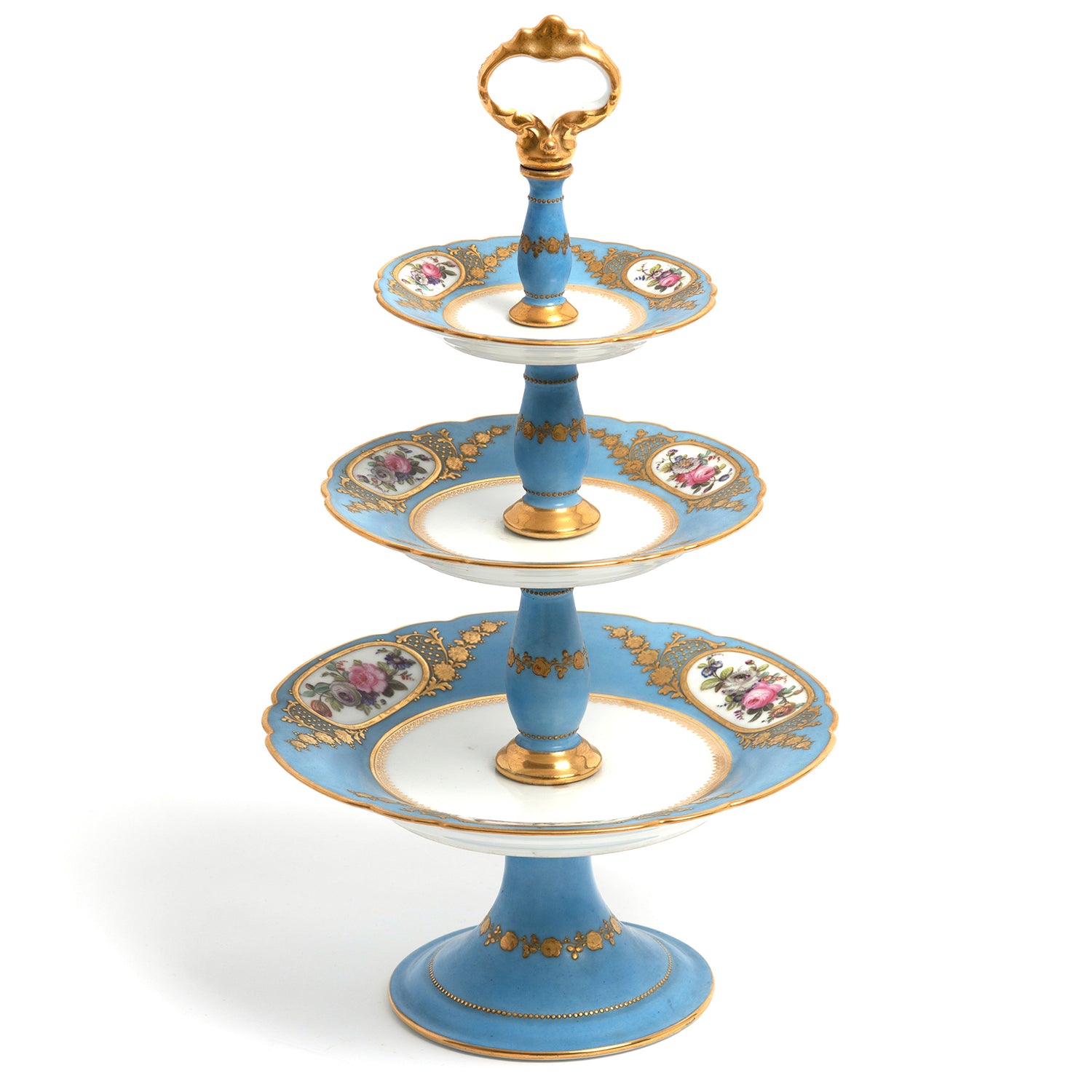 Circa 1840s, by Françiois-Eugene Rousseau, Paris, France. Hand-painted and multi-motif, this gold medal one-of-a-kind set is stunning! Old school Parisian charm at its museum quality best, this set includes thirteen plates, two tazzas, and one 3-tier dessert or petit fours stand. Excellent condition.