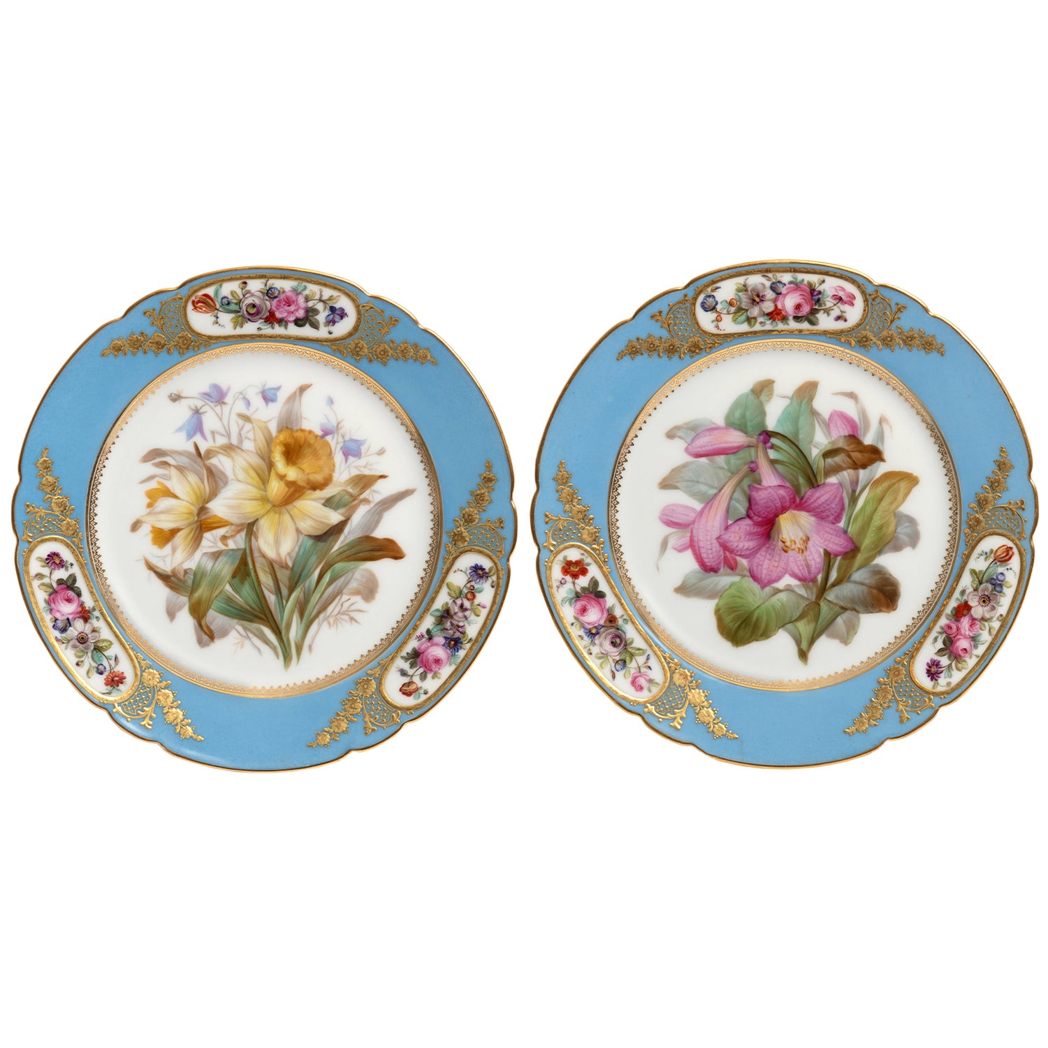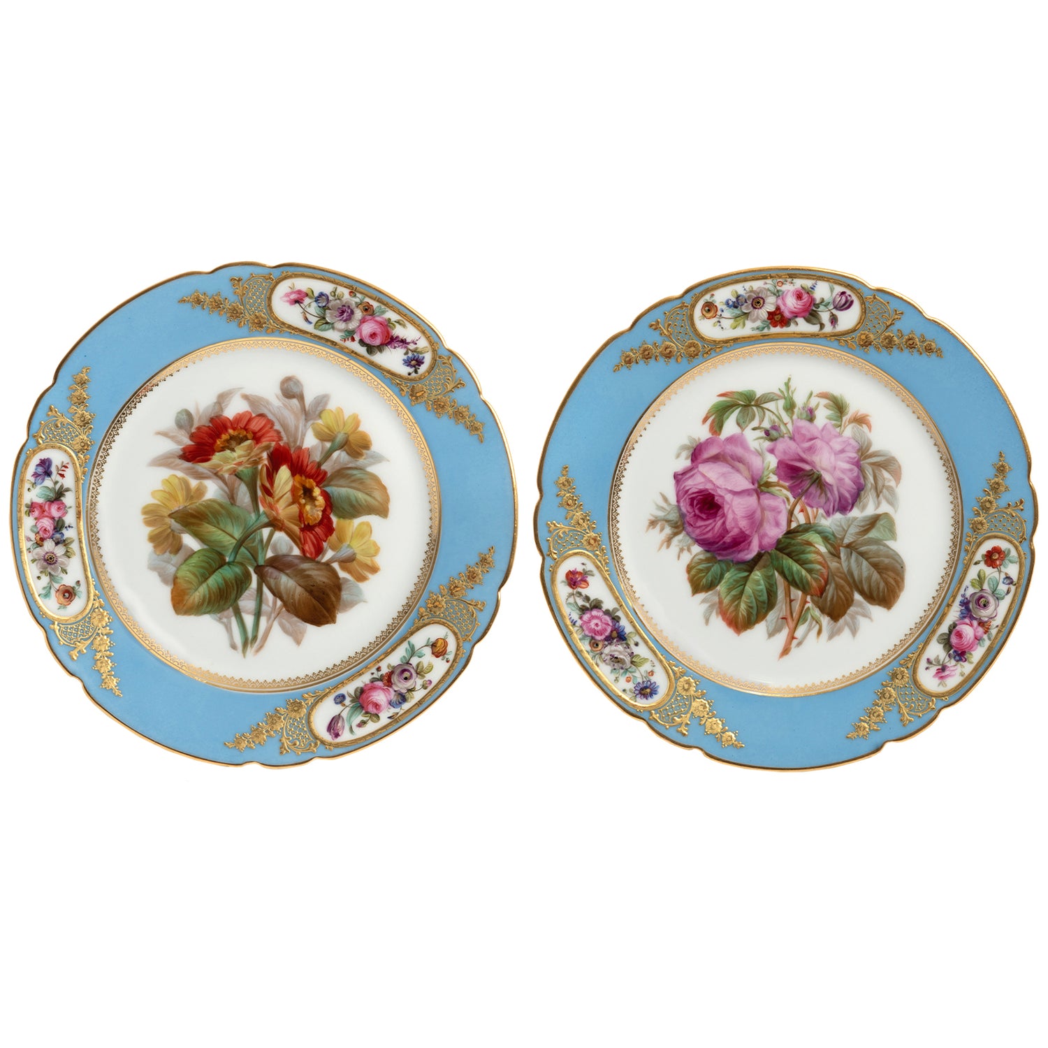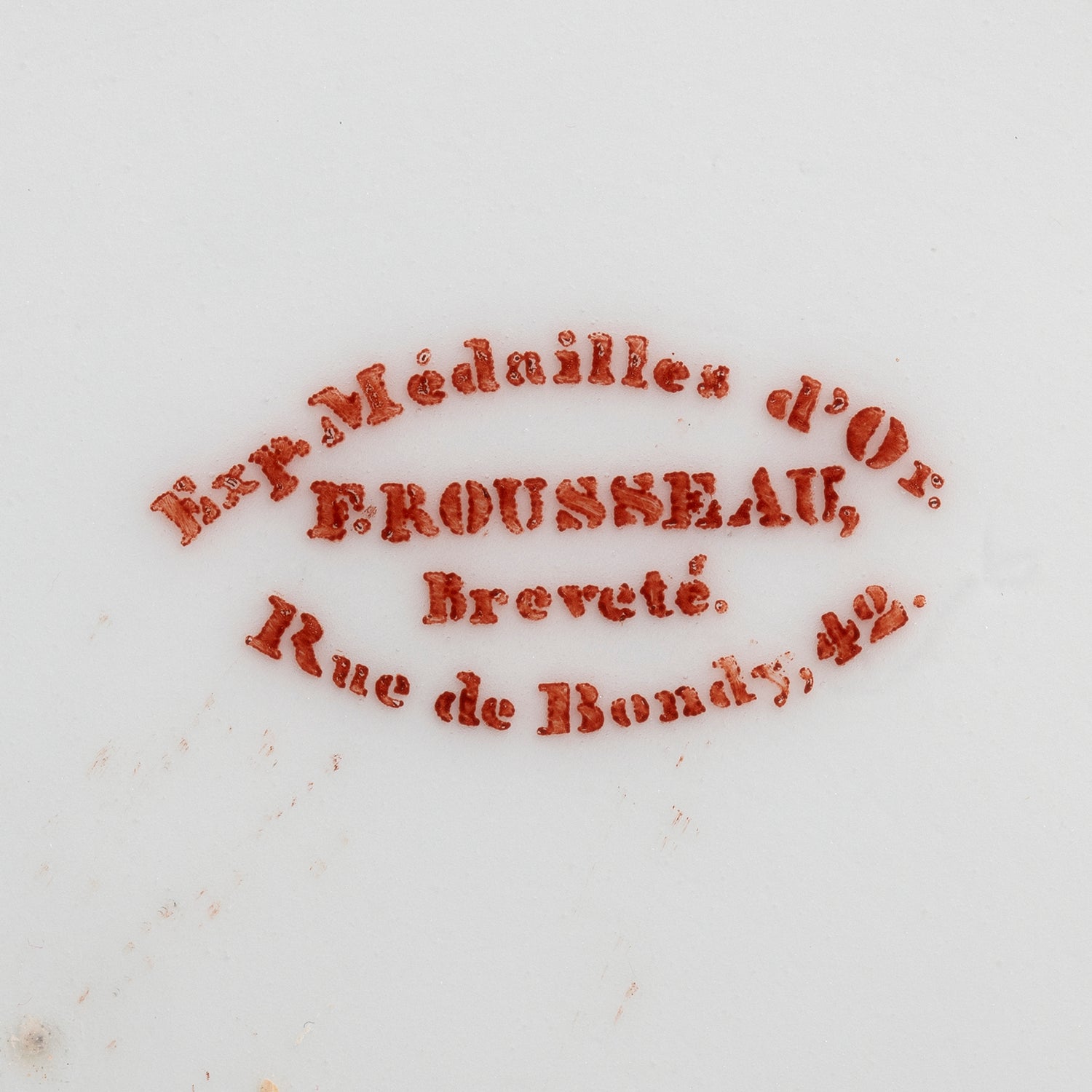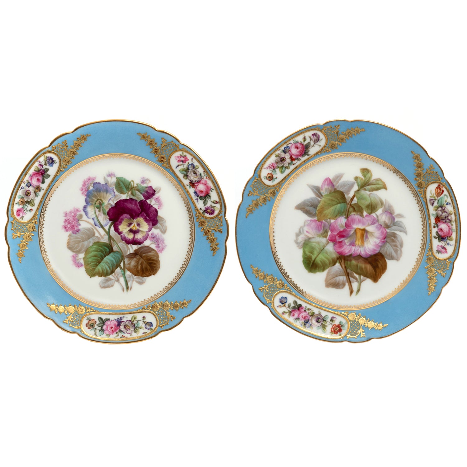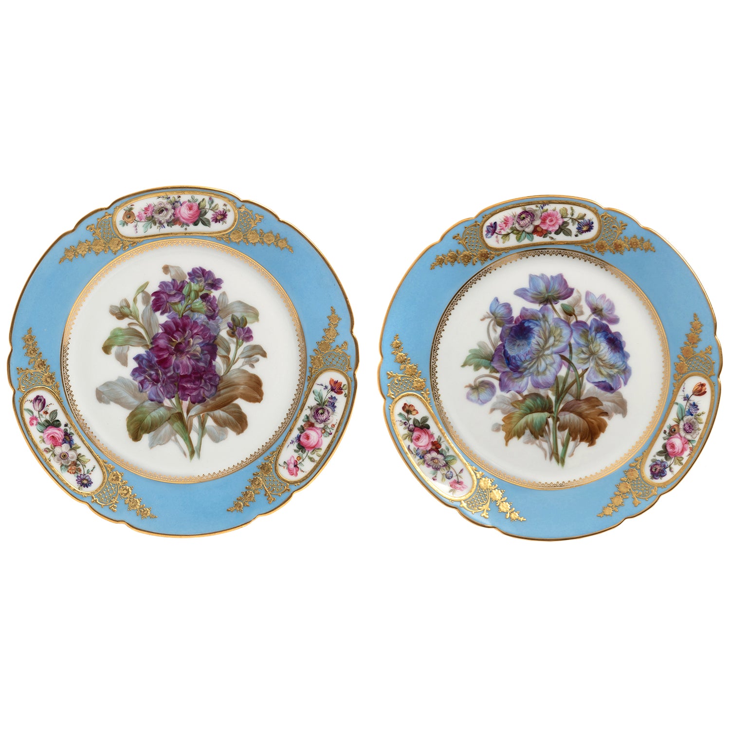 Circa 1840s, by Françiois-Eugene Rousseau, Paris, France. Hand-painted and multi-motif, this gold medal one-of-a-kind set is stunning! Old school Parisian charm at its museum quality best, this set includes thirteen plates, two tazzas, and one 3-tier dessert or petit fours stand. Excellent condition.