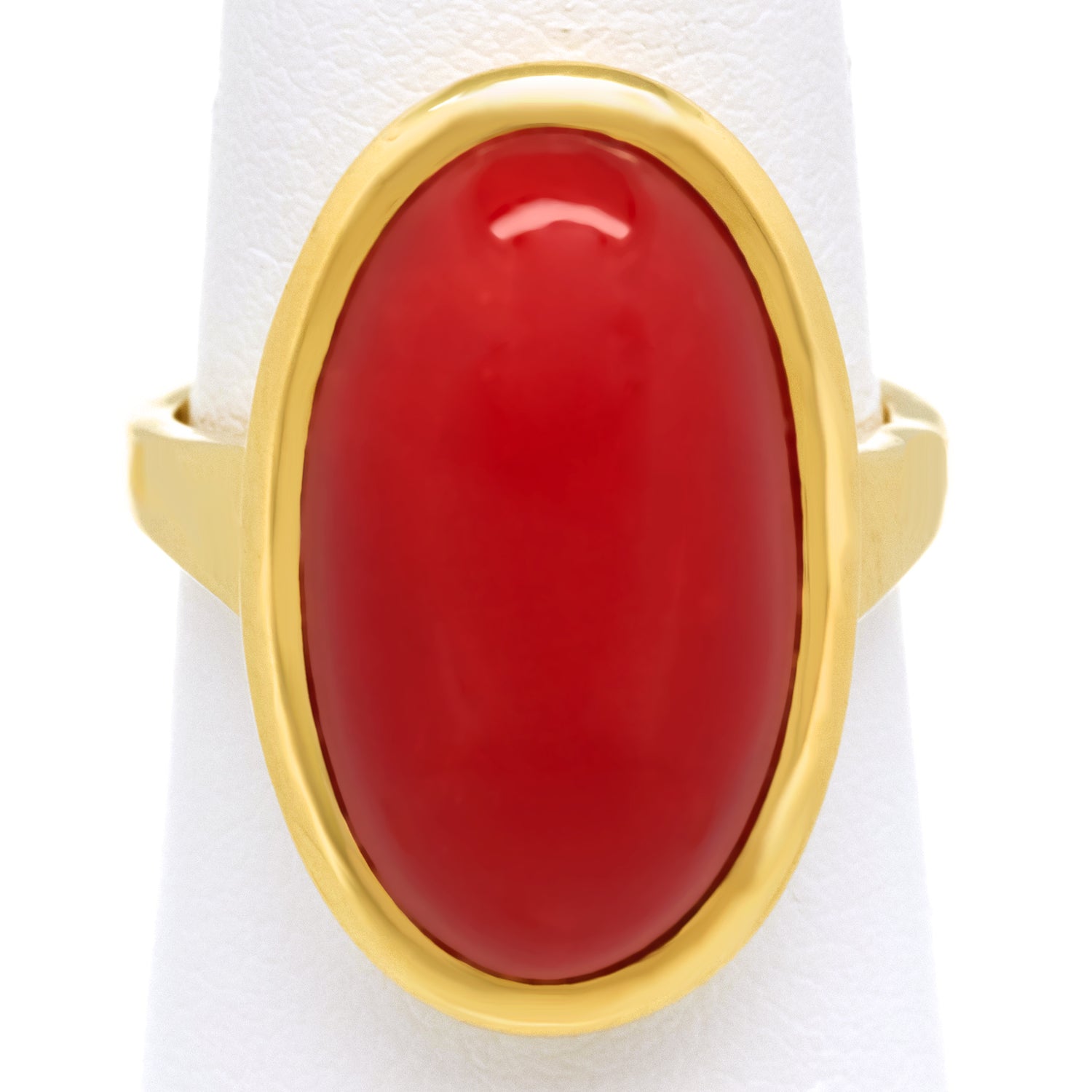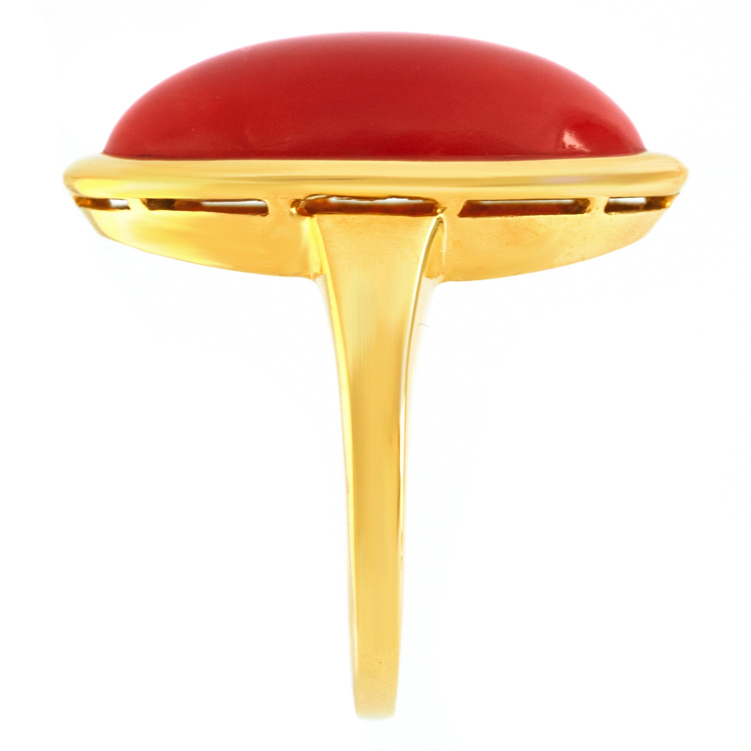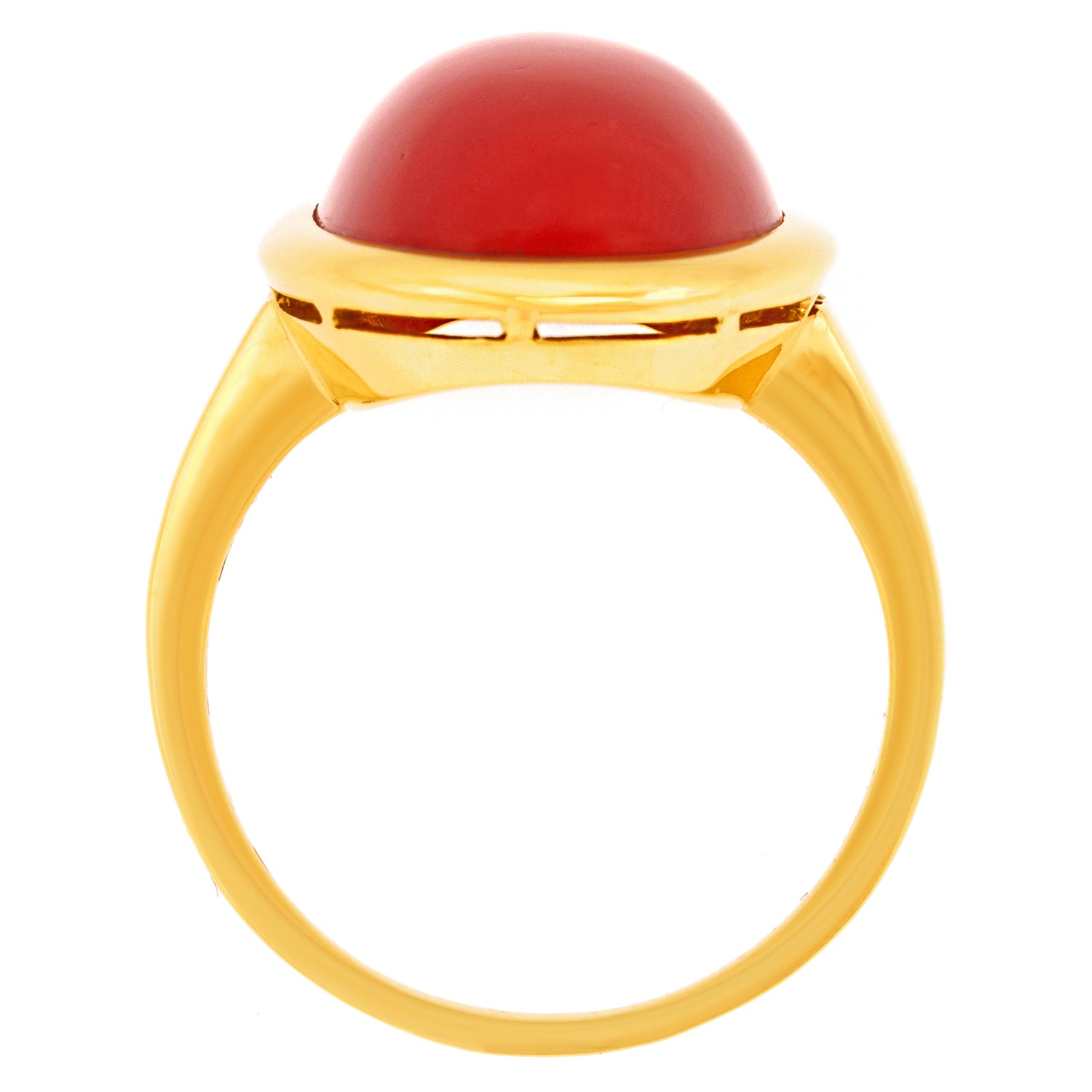 Circa 1960s, 18k, Swiss. Its all about the deeply hued fine quality coral cabochon, this sleek modernist ring is perfect for any moment of fashion. Finely made, it is in excellent condition.