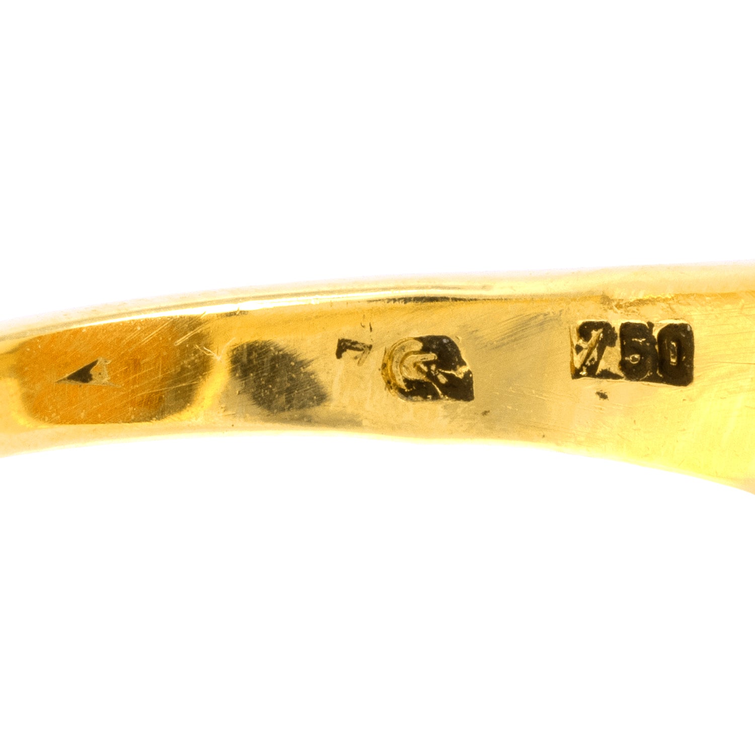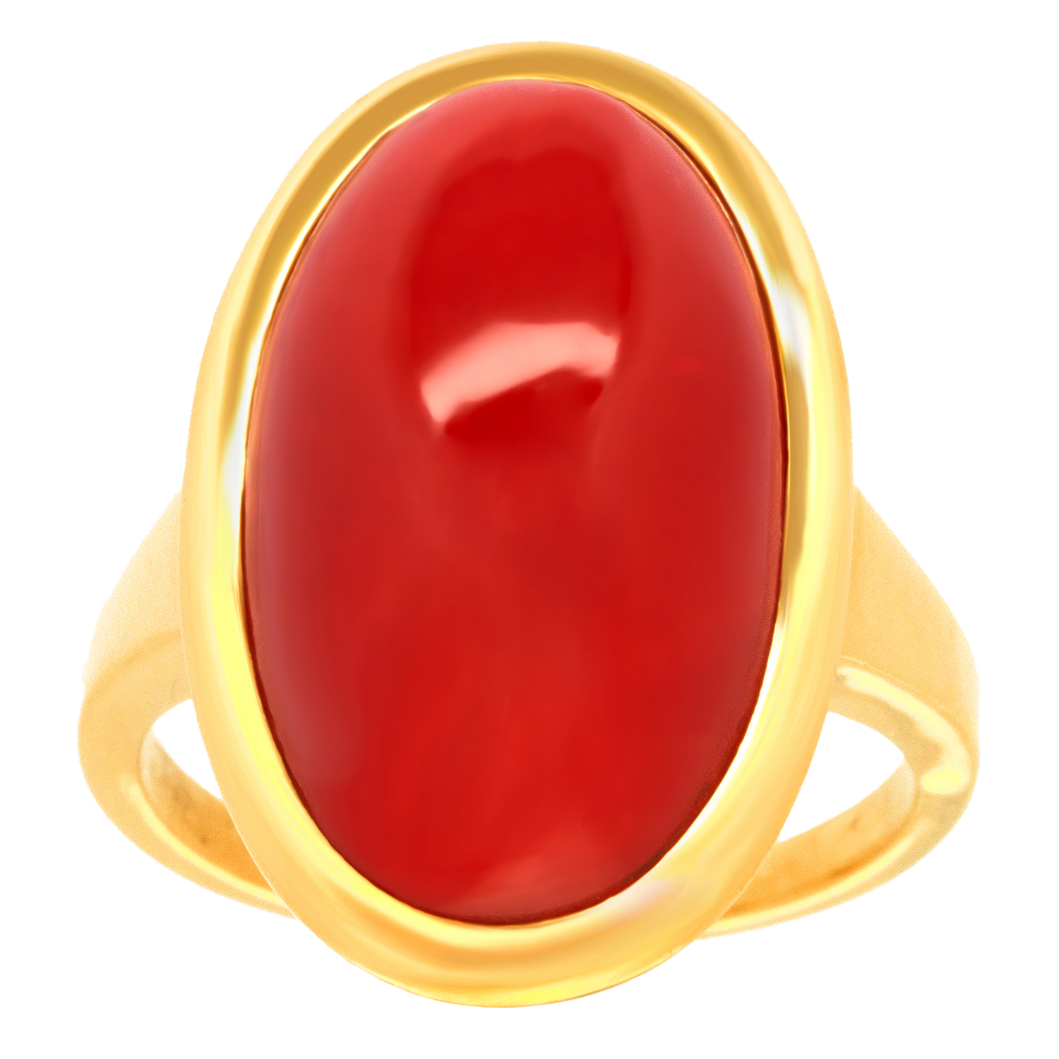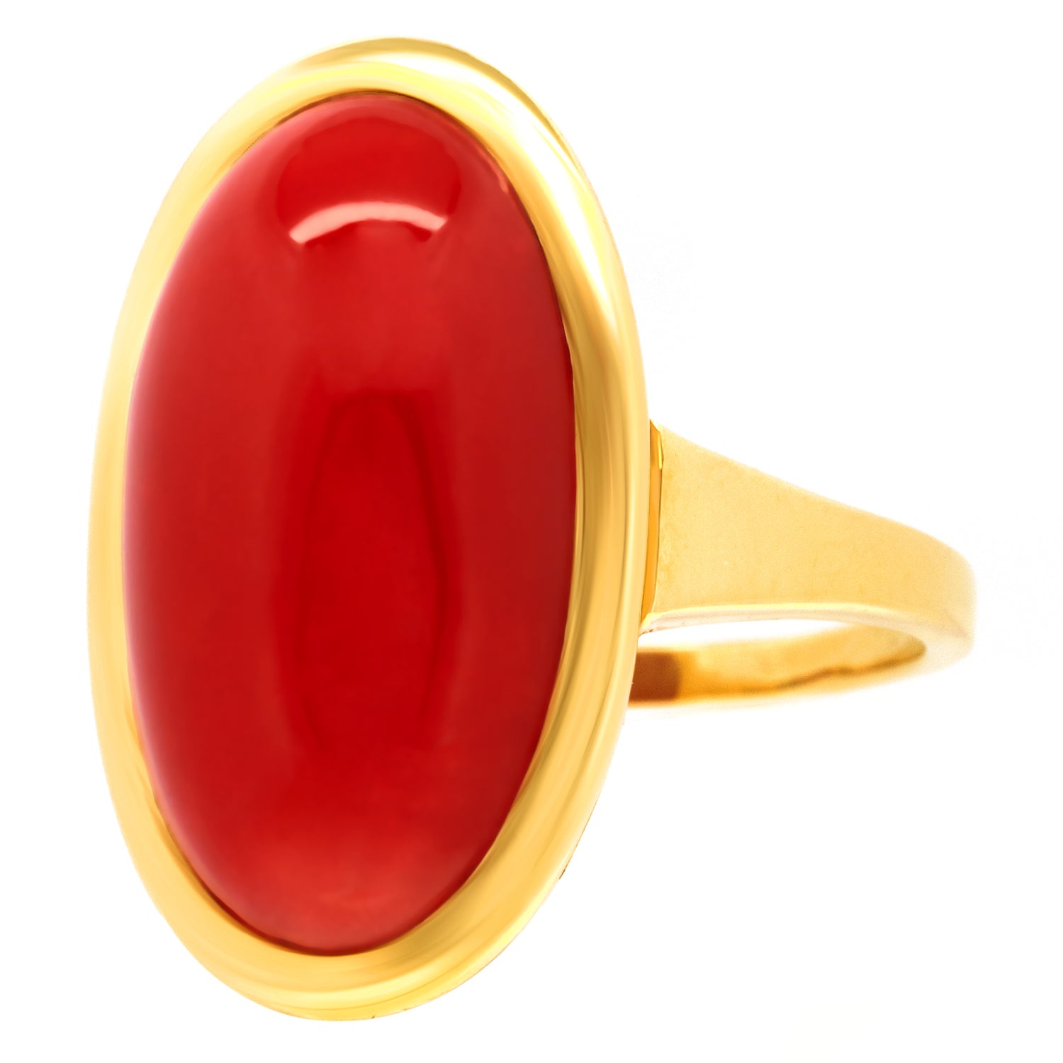 Circa 1960s, 18k, Swiss. Its all about the deeply hued fine quality coral cabochon, this sleek modernist ring is perfect for any moment of fashion. Finely made, it is in excellent condition.