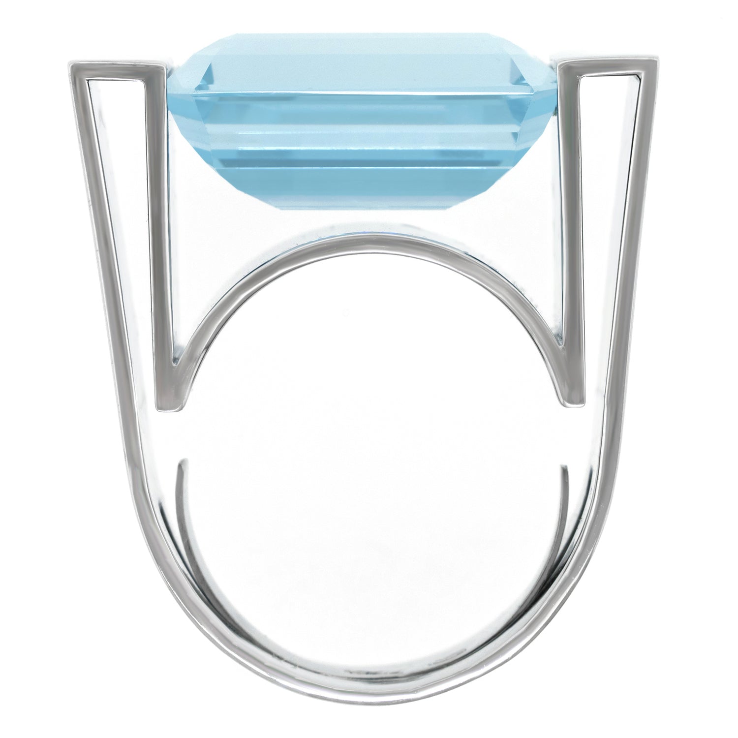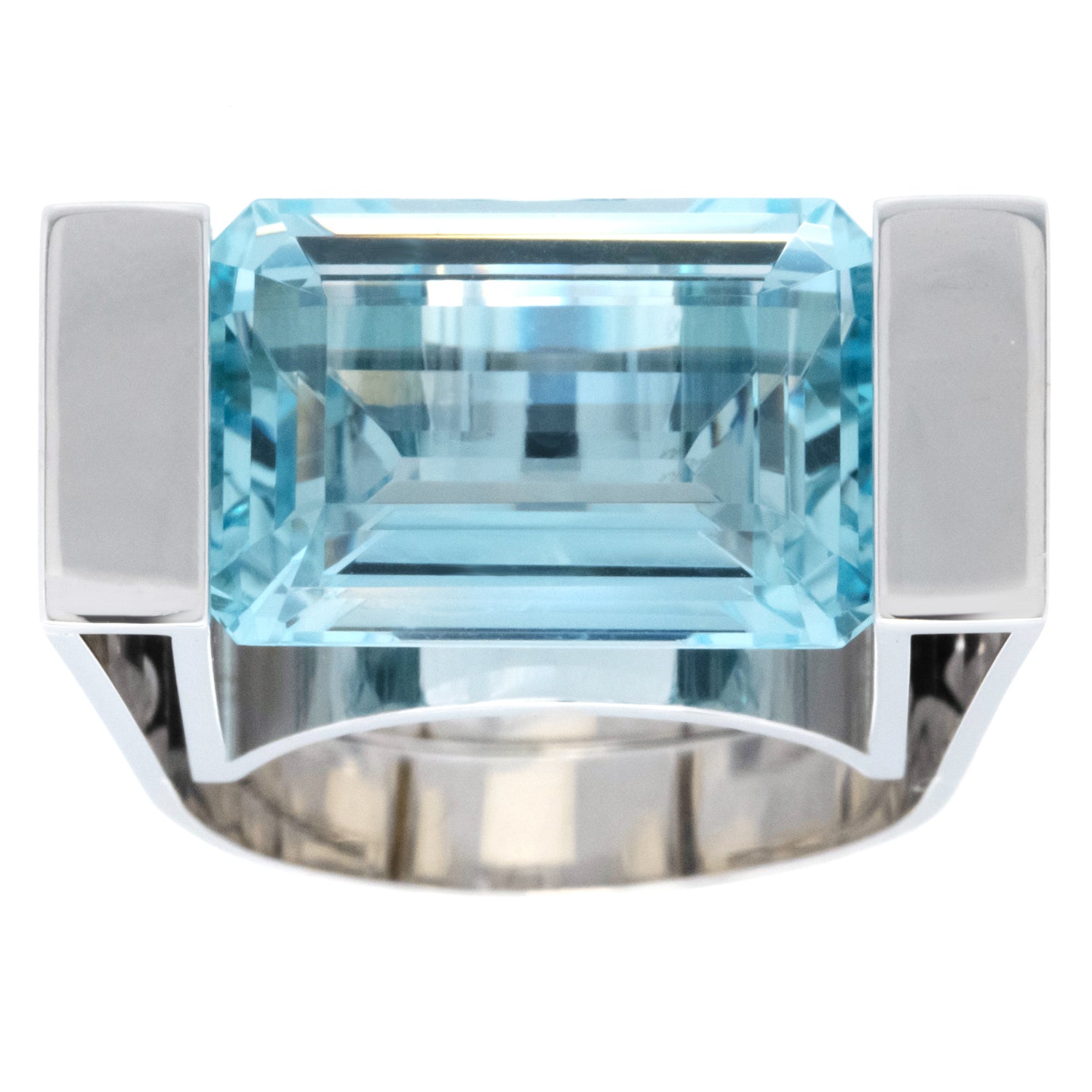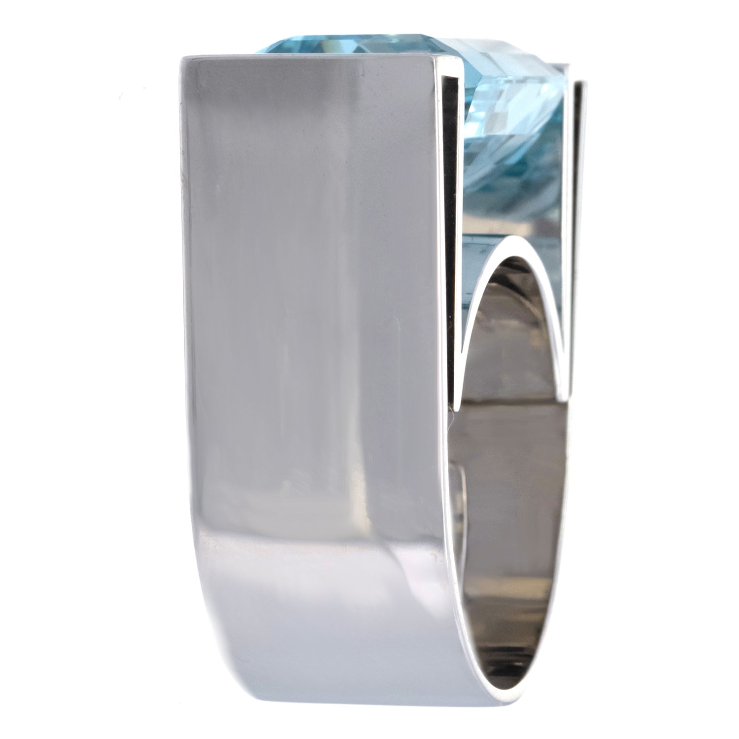 Circa 1960s, 18k, by Gunter Wyss, Switzerland. This one-of-a-kind ring by the revolutionary goldsmith Günter Wyss is a visual and technical marvel. Set with an intense blue aquamarine (12.0 carat), it is made from one continuous piece of 18k white gold. His designs and techniques were groundbreaking, but alas, his body of work is limited as he passed away at 37. Highly sought after by museums and collectors alike, this piece is in excellent condition.