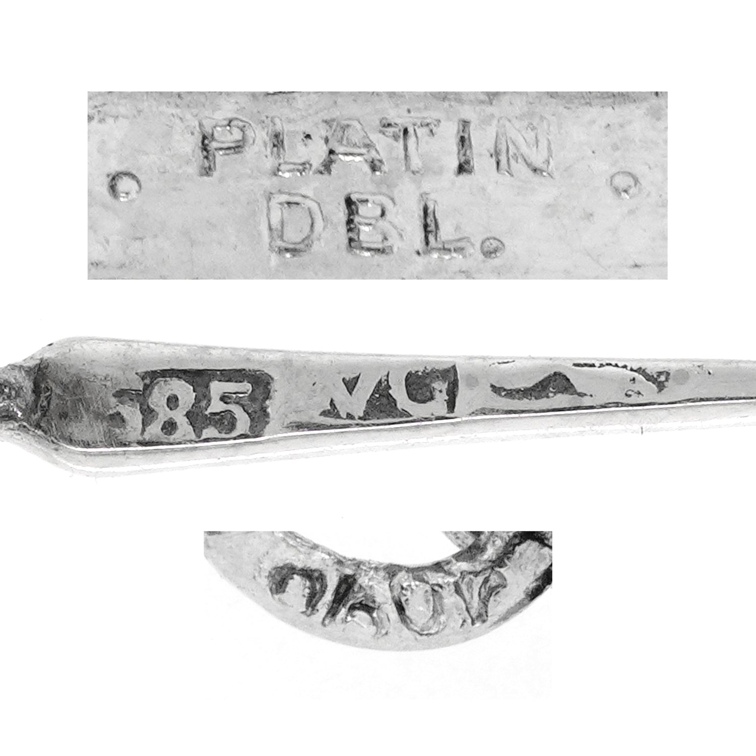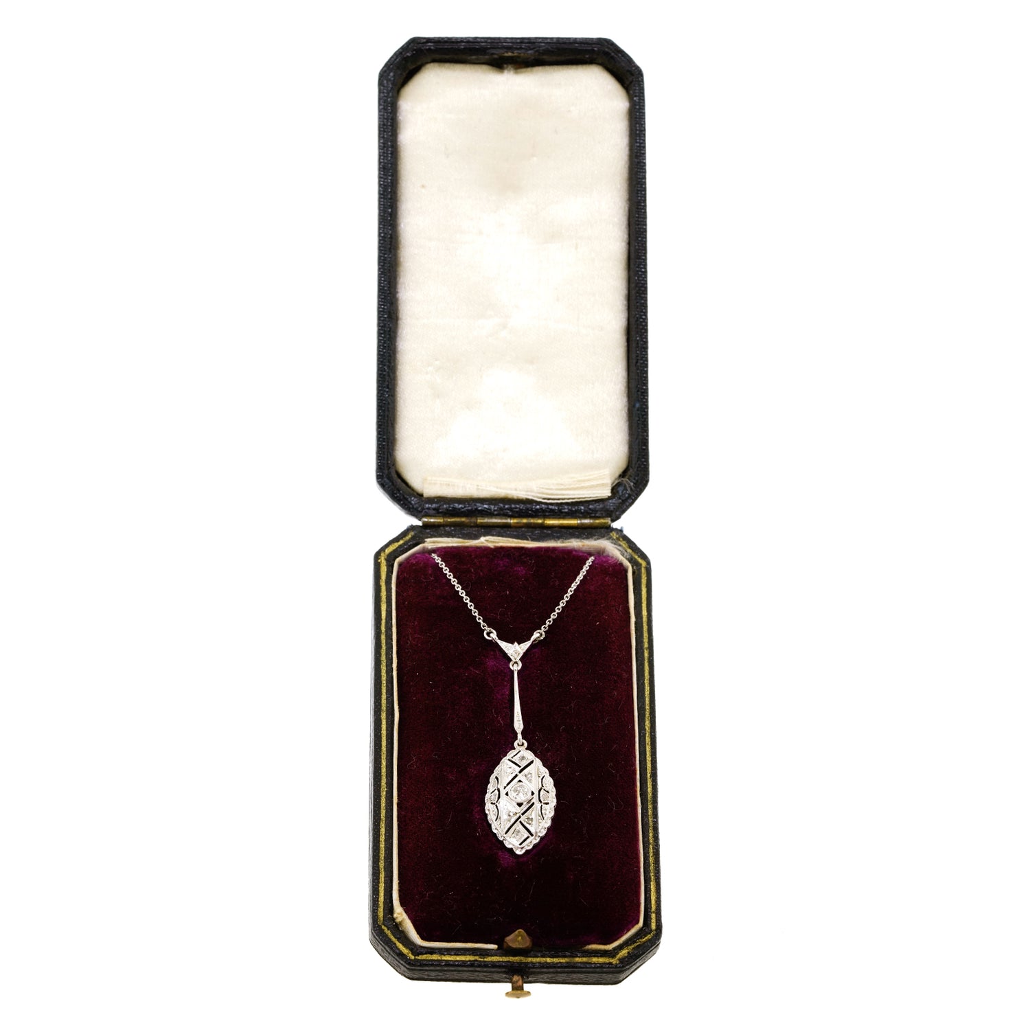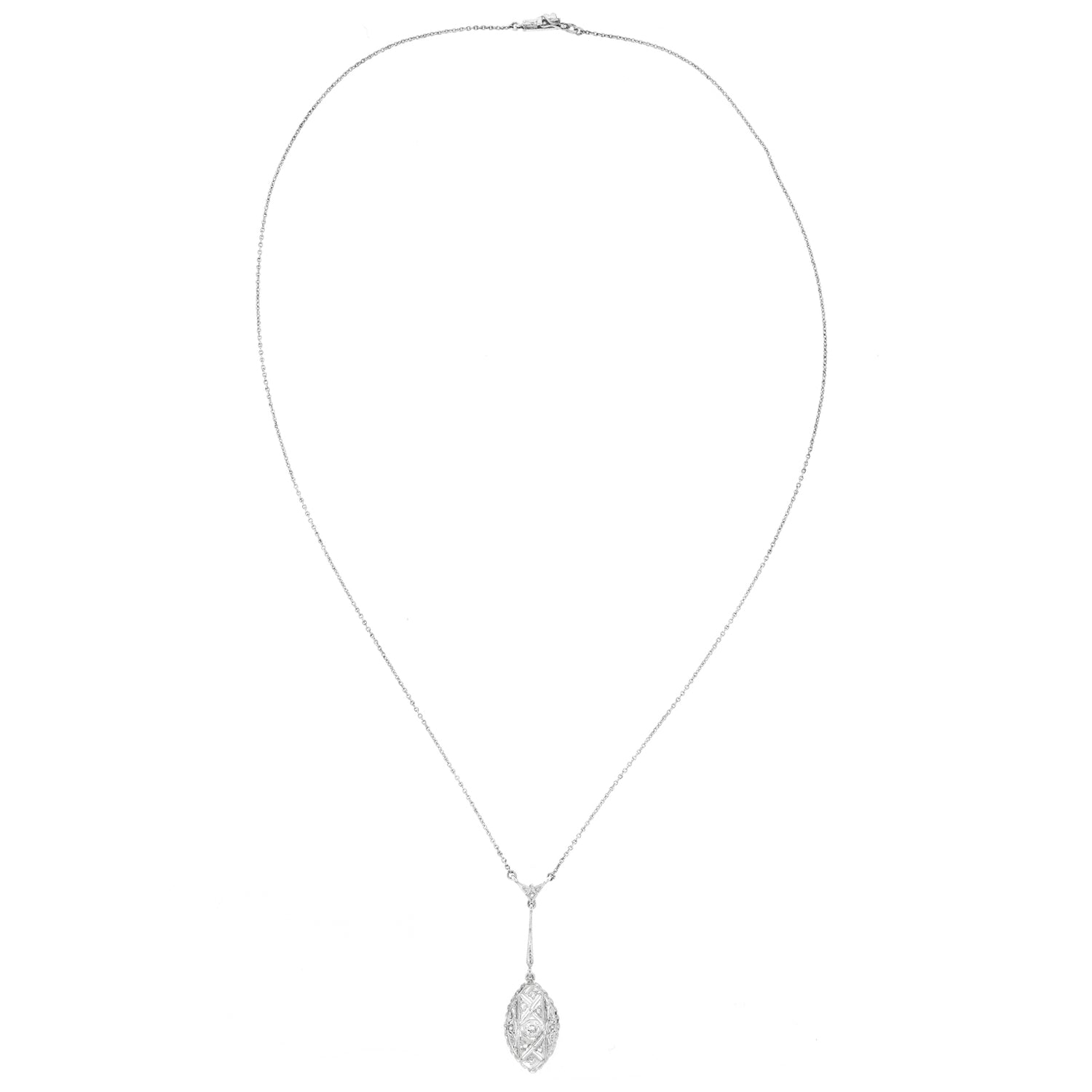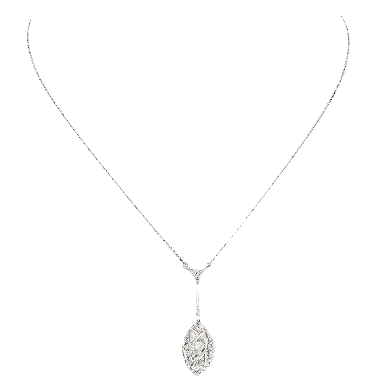 Circa 1910-20s, 14k/platinum, Vienna, Austria. Beautifully mixing the Edwardian period’s romantic designs with geometric motifs that foreshadow Art Deco, this diamond pendant is a stylish example of early 1900s jewelry. Sleekly elegant and very versatile, it is perfect for everyday or dressed up. Superbly crafted in platinum and 14k gold, this gorgeous Austrian necklace is in excellent condition.
