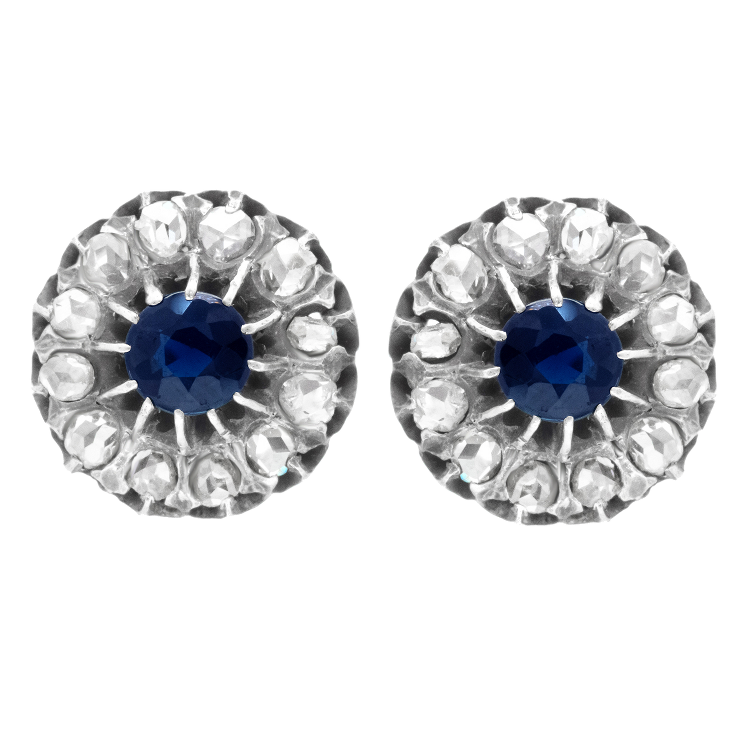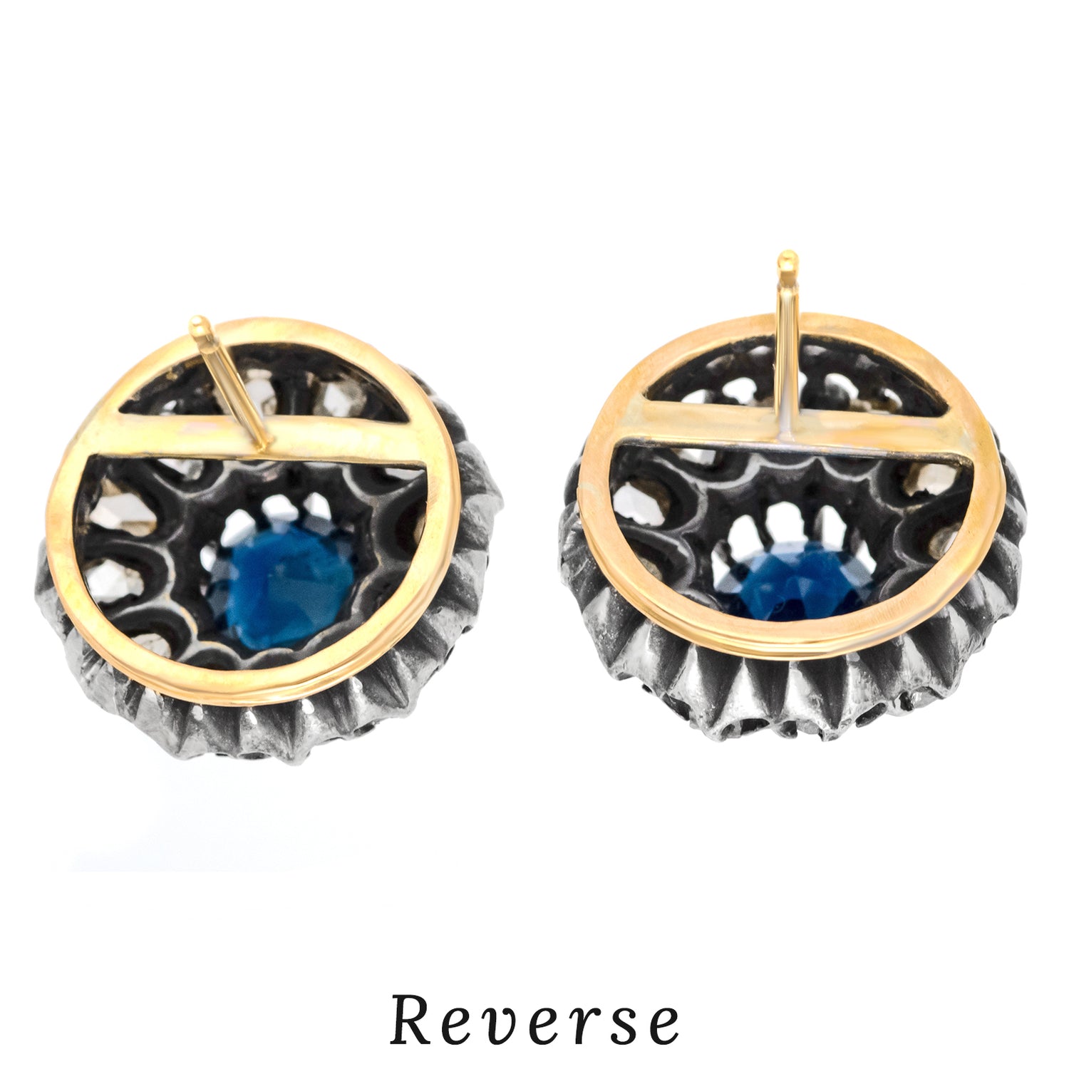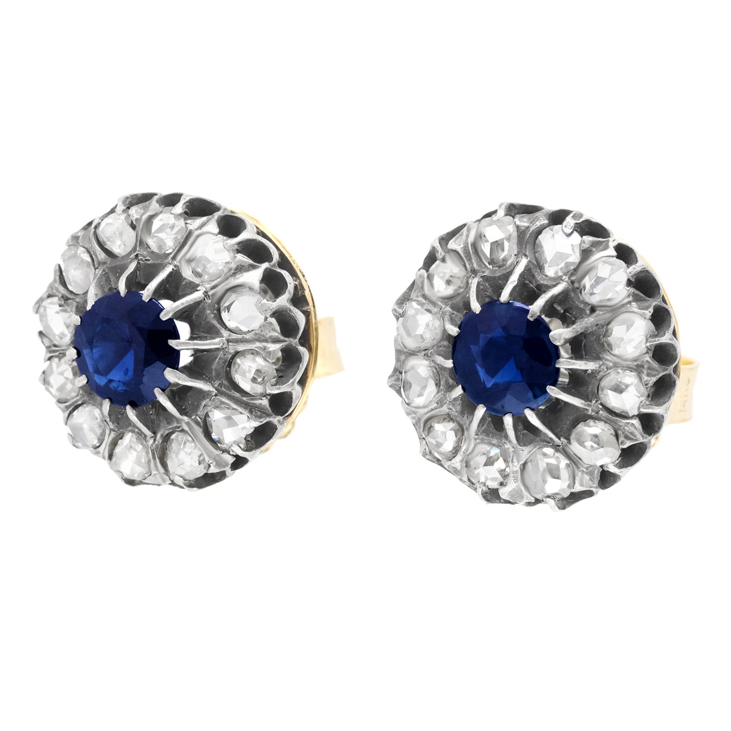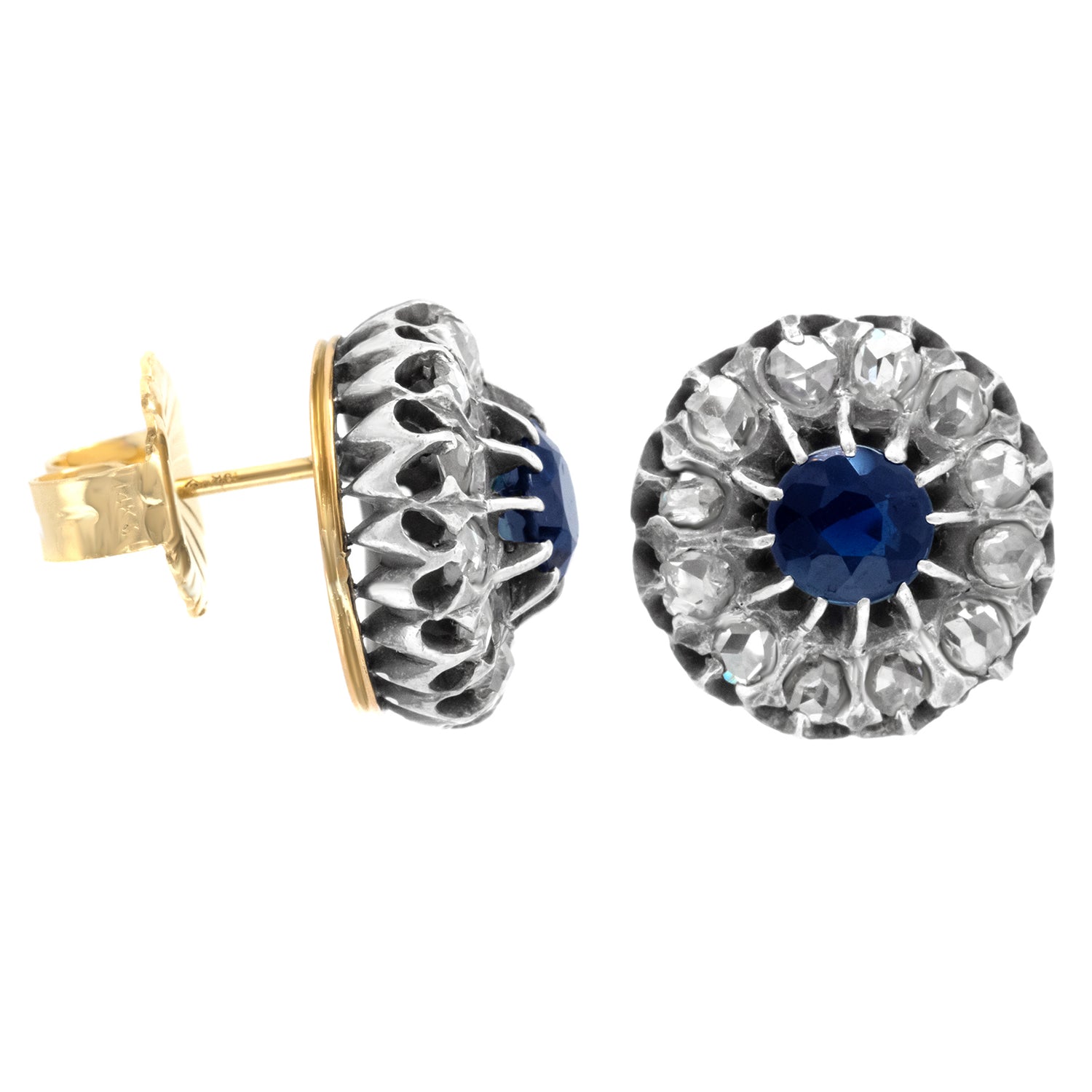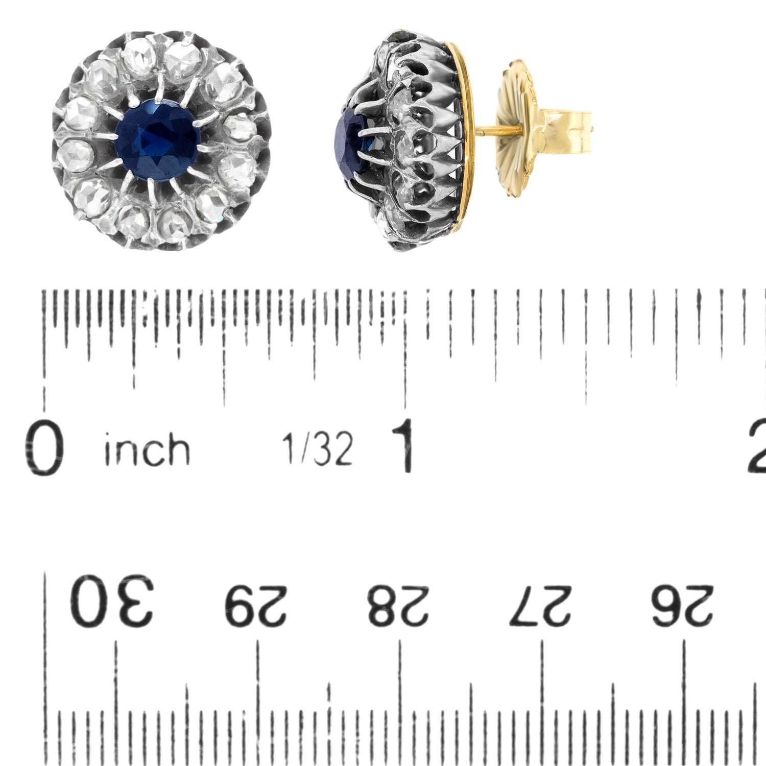Circa 1880s, Silver over gold (14k). These Victorian diamond and sapphire stud earrings are set with 1.50 carats of intense royal blue sapphire and .75 carats of rosecut diamonds. The look is “just enough opulence”, easily going from the casual to cocktails. Excellent condition