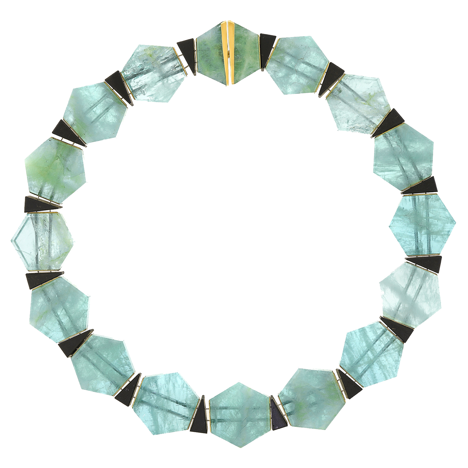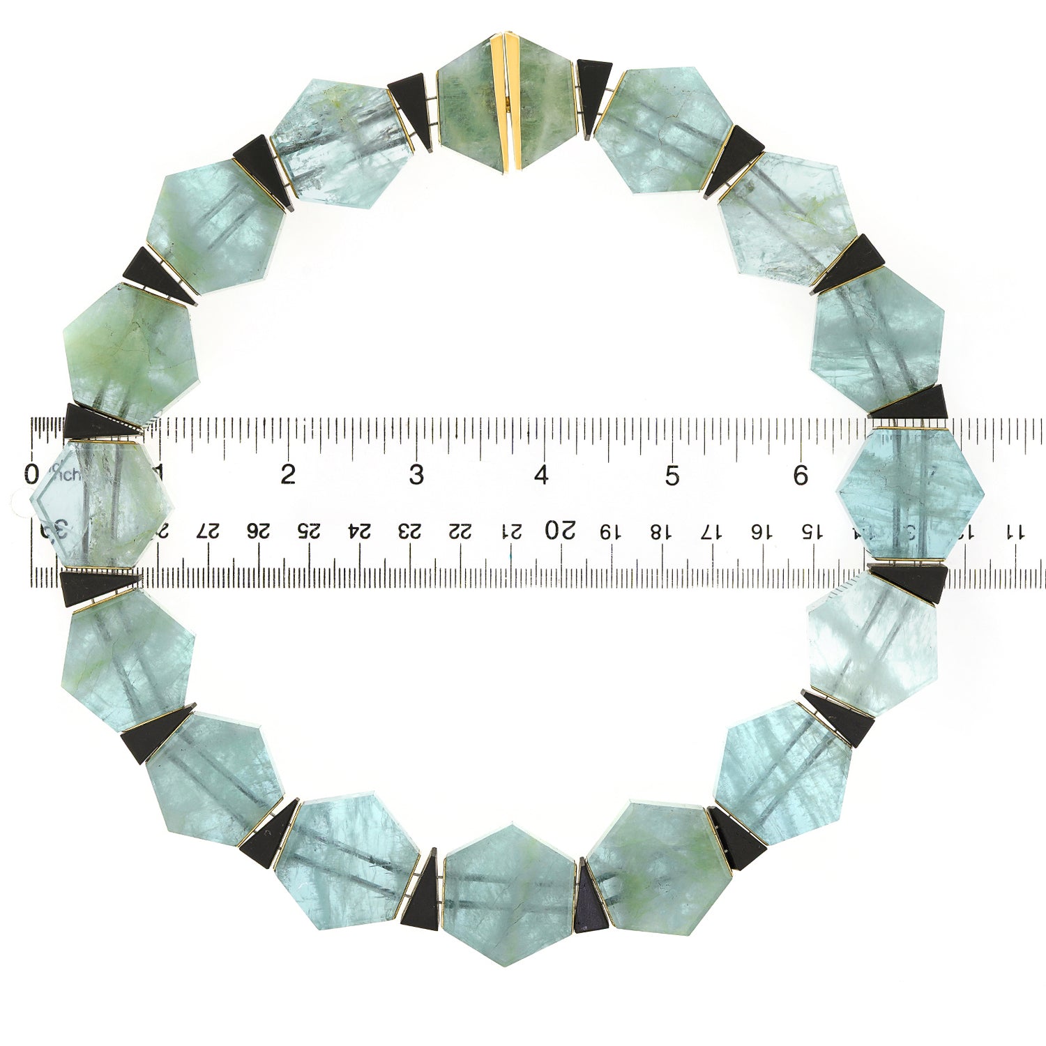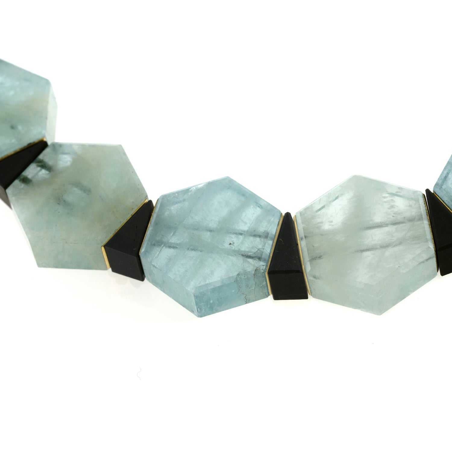 Circa 1970s, 18k, Swiss. This striking Art Deco Revival necklace is fearless fashion! Featuring 965 carats of aquamarine interspersed with onyx and eighteen-karat yellow gold elements, this is seventies jewelry at its colorful dynamic best. I see notes of Rene Lalique, underscored by the bold geometry of Deco design. Excellent condition.