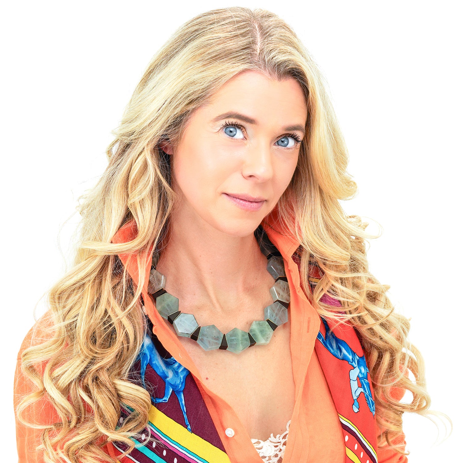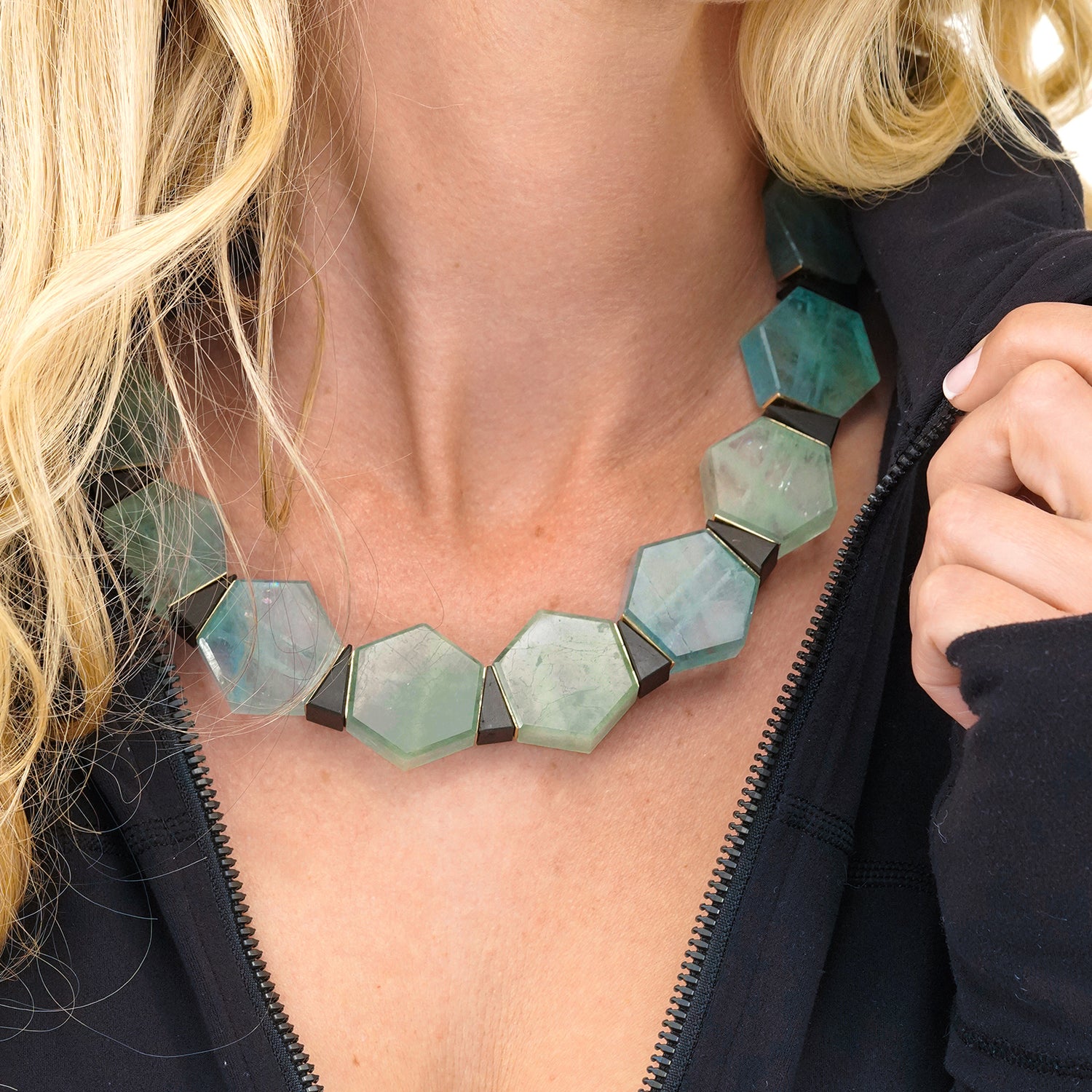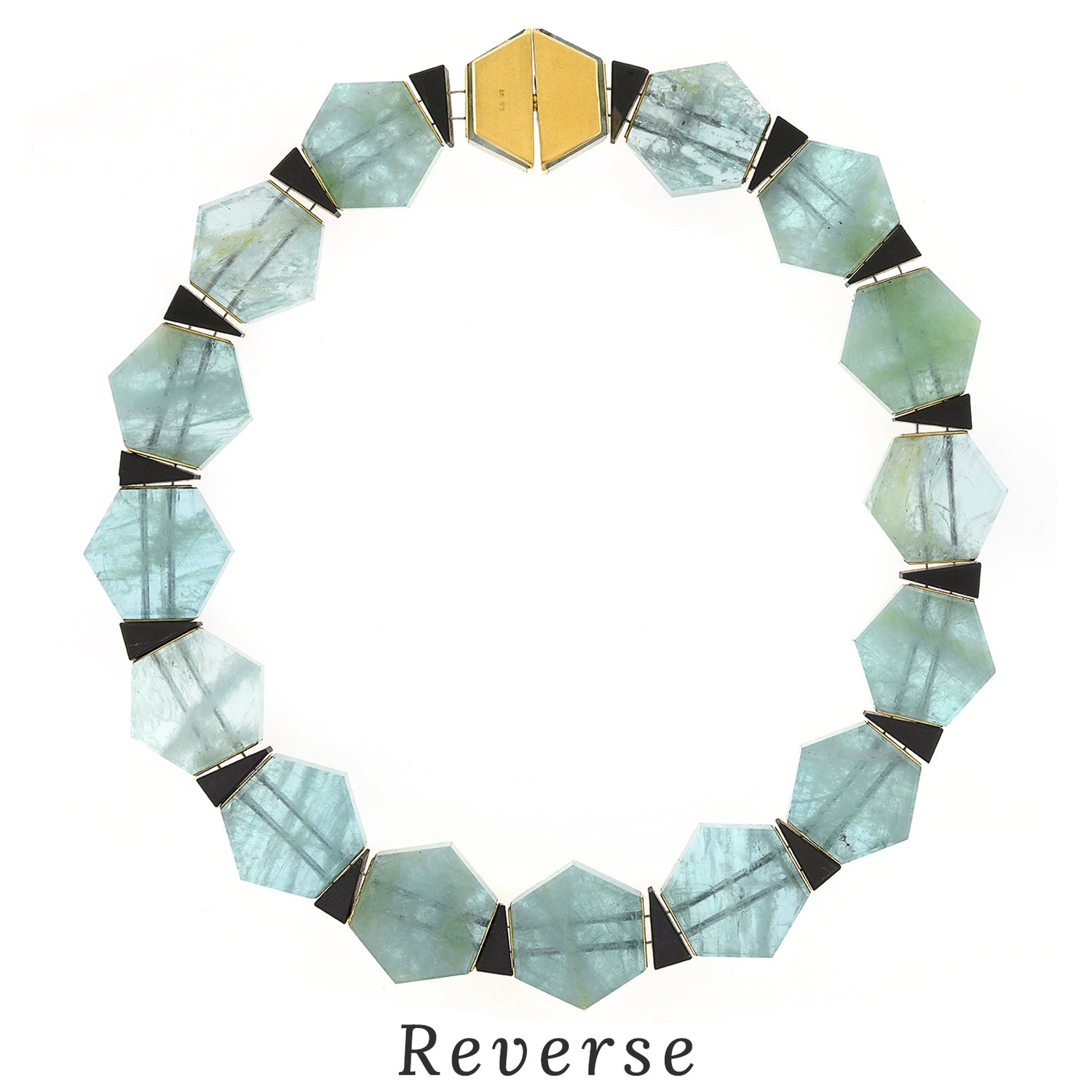 Circa 1970s, 18k, Swiss. This striking Art Deco Revival necklace is fearless fashion! Featuring 965 carats of aquamarine interspersed with onyx and eighteen-karat yellow gold elements, this is seventies jewelry at its colorful dynamic best. I see notes of Rene Lalique, underscored by the bold geometry of Deco design. Excellent condition.