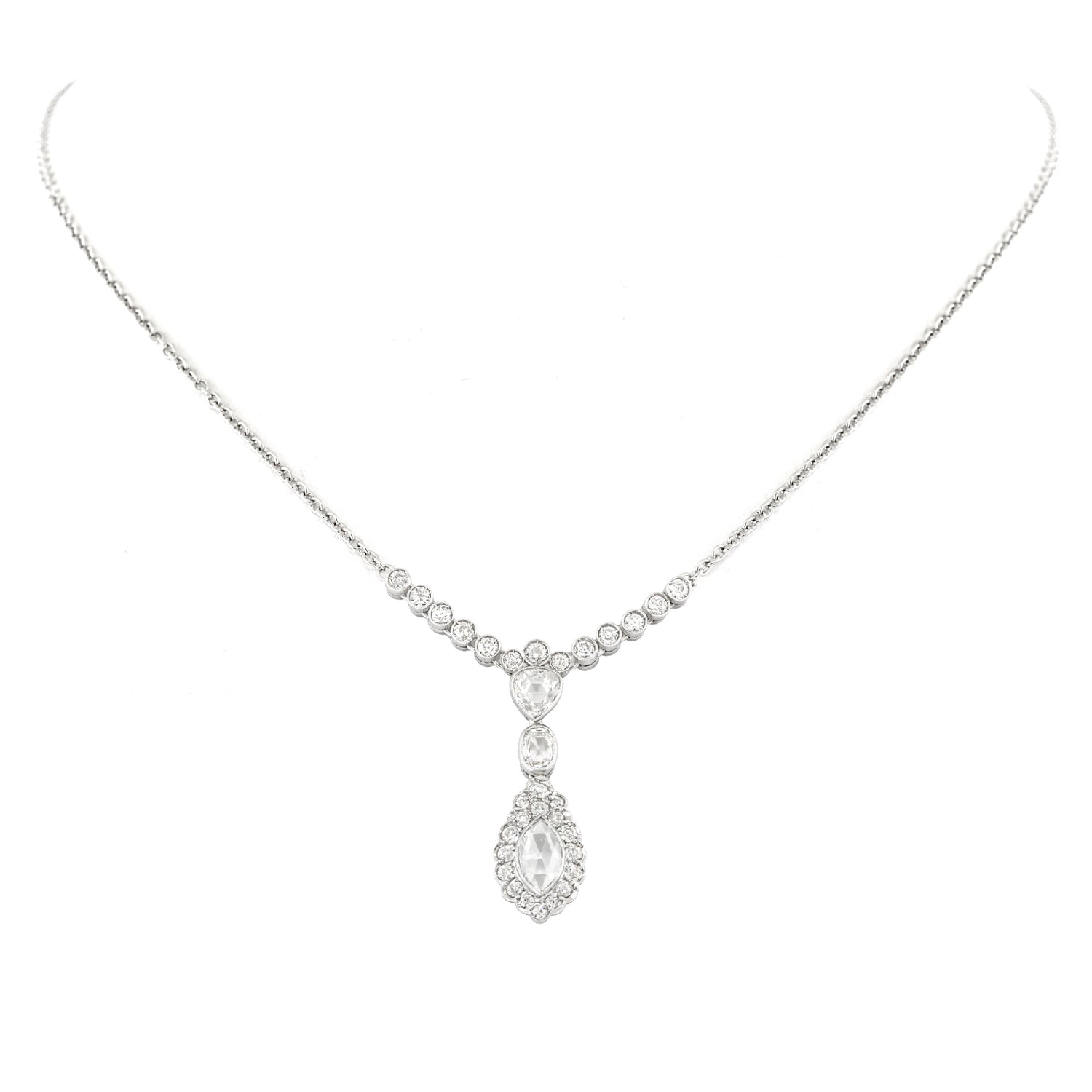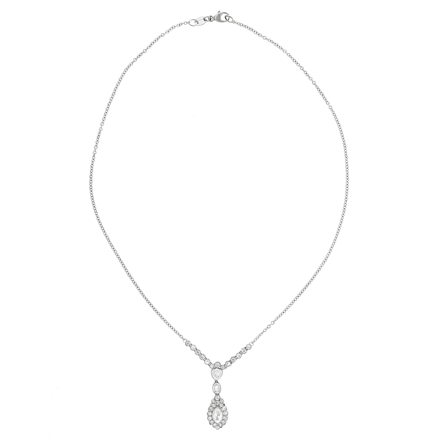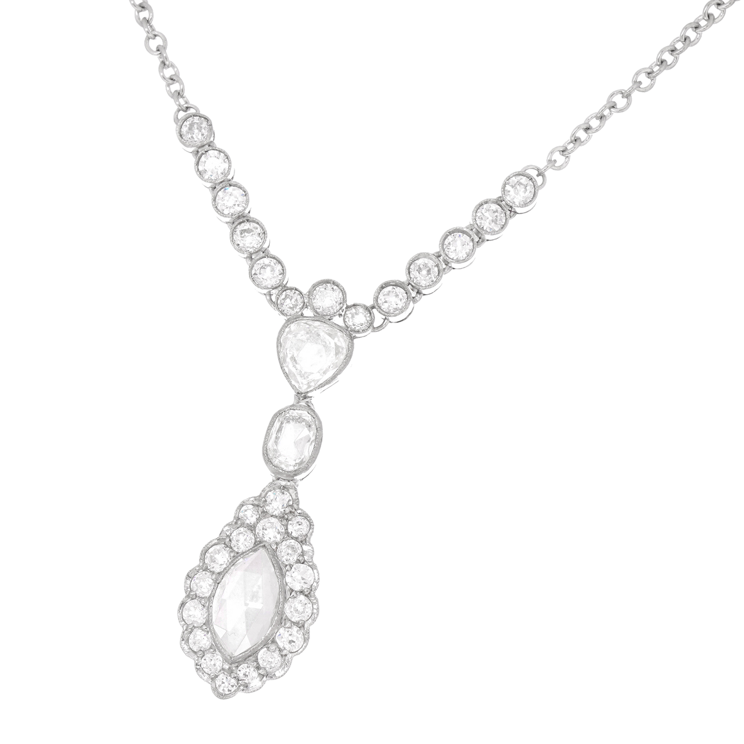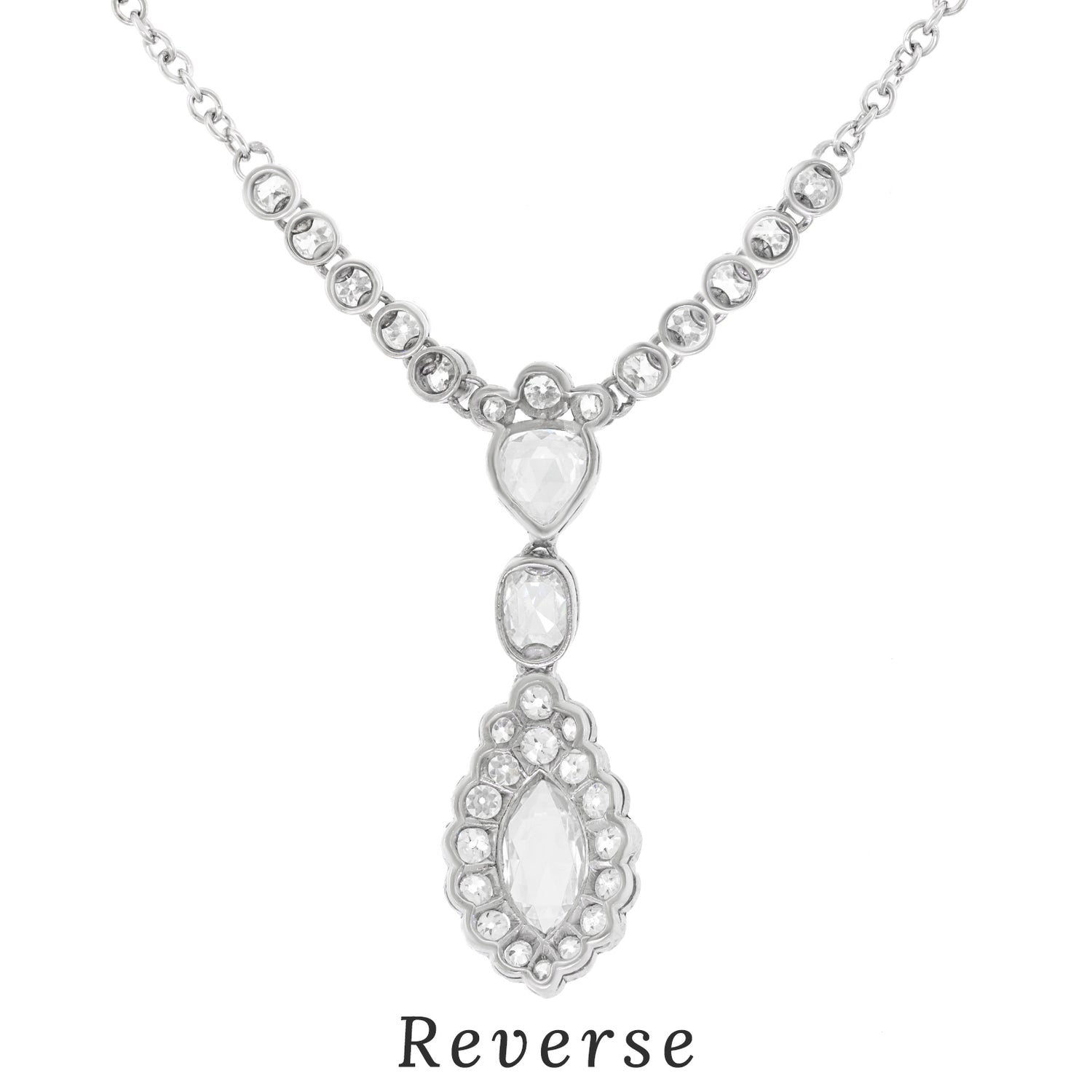 Circa 1980s, Platinum. Beautifully mixing the Edwardian period’s romantic designs with the geometric motifs that foreshadow Art Deco, this 1980’s diamond necklace is a stylish example of vintage-inspired jewelry. Sleekly elegant and very versatile, it is perfect for every day dress up. Superbly crafted in platinum, this gorgeous necklace is in excellent condition.