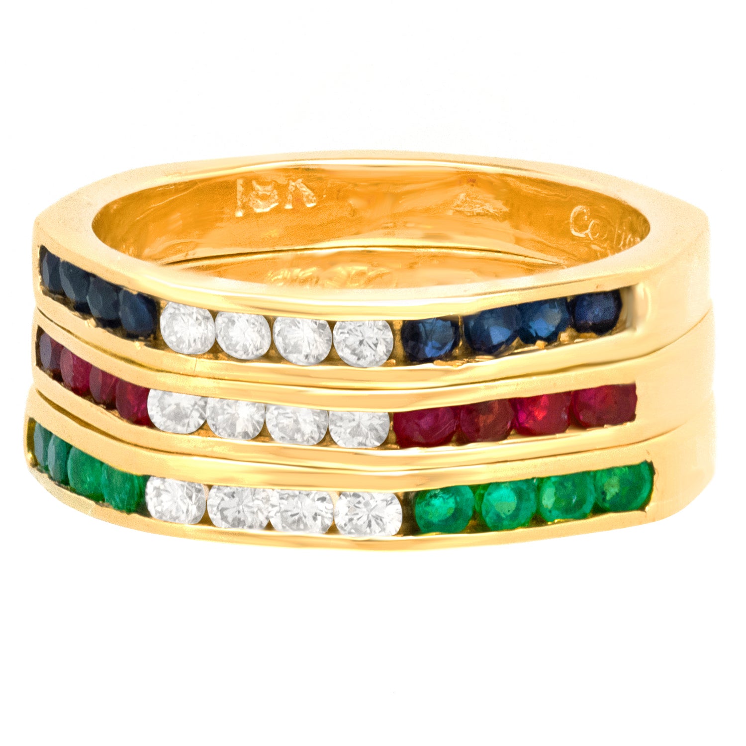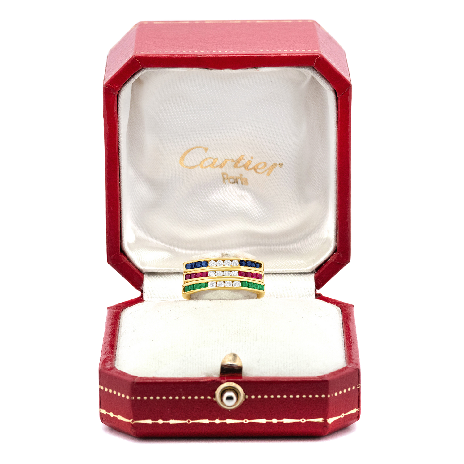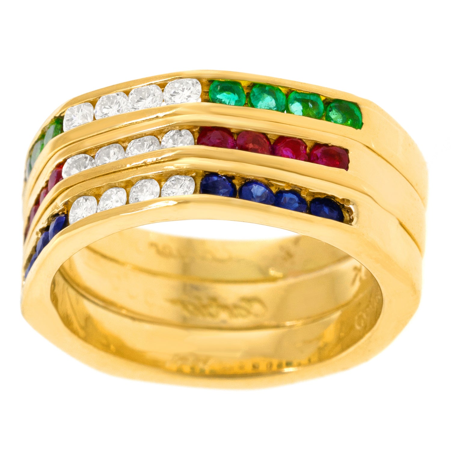 Circa 1970s, 18k, by Cartier. This chic Cartier ring is perfect for elegant daily wear. Originally three separate Cartier rings, they have been masterfully joined to make one ring, (they could easily be separated into three rings again). Featuring ruby, sapphire, and emerald with diamonds, together they create a timeless visual. As we would expect from the esteemed house of Cartier, the stones are beautifully hued, lively, and well-matched. Excellent condition.
