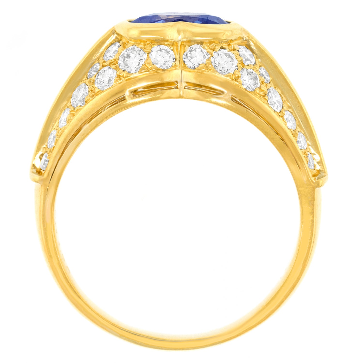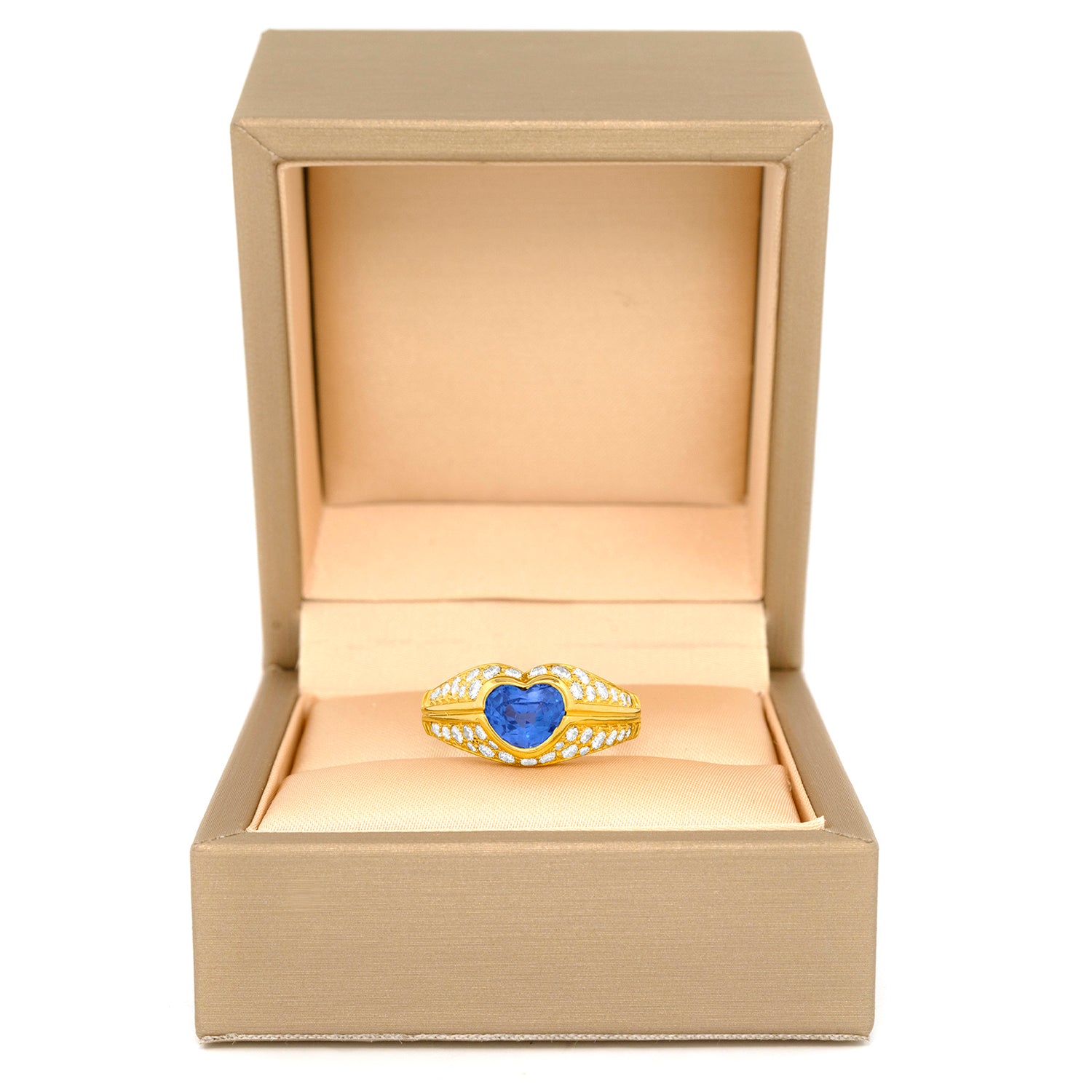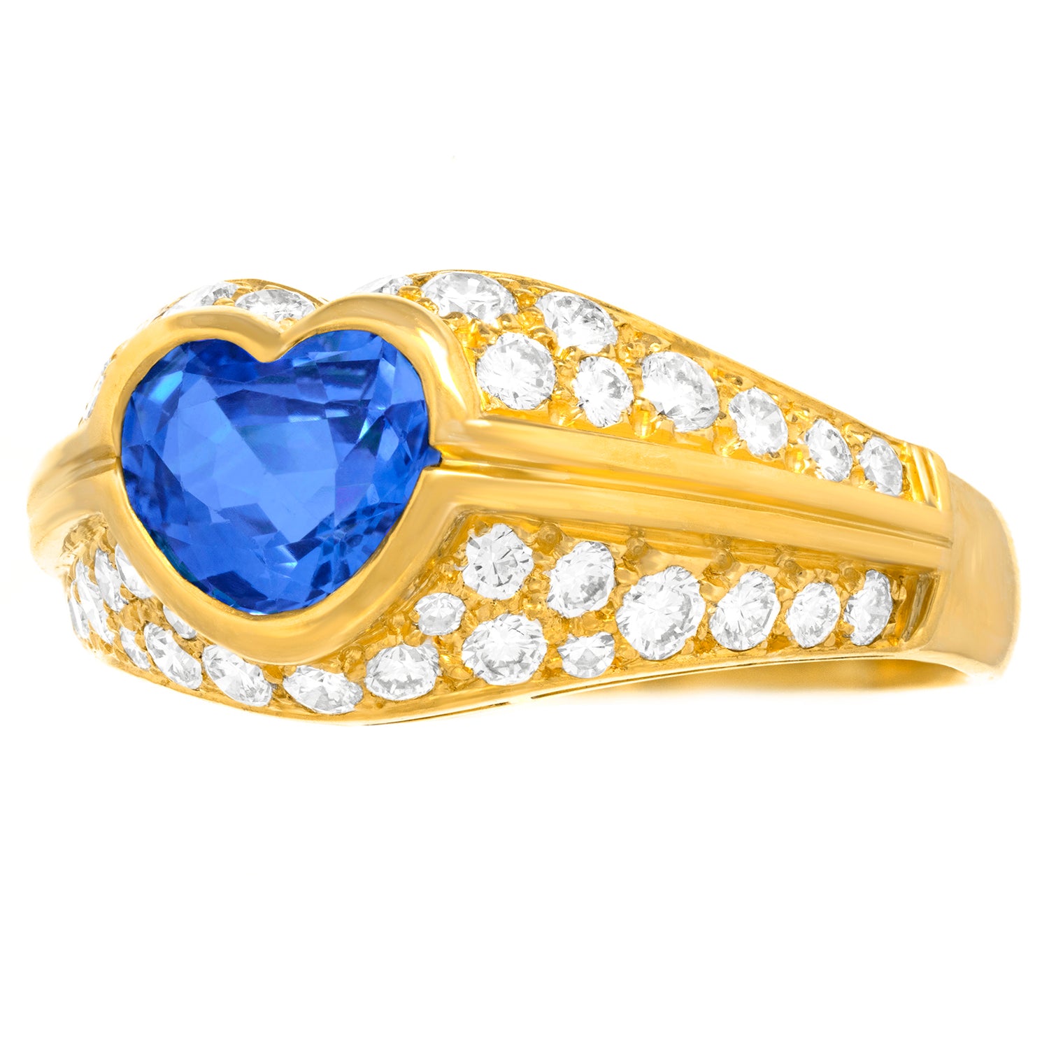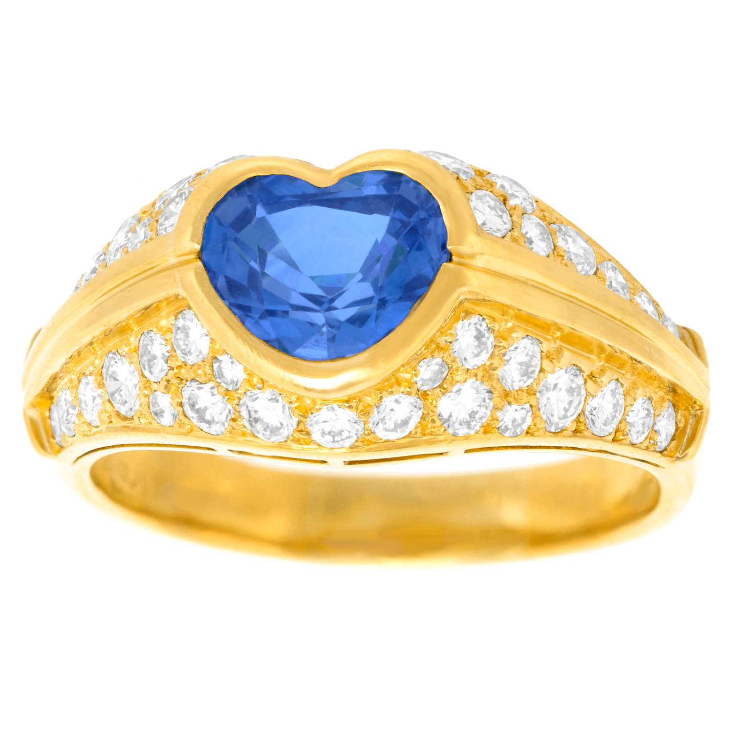 Circa 1970s, 18k, by Bvlgari, Italy. This fabulous seventies ring features a 1.40-carat heart-shaped sapphire and 1.0 carat of brilliant white diamonds (G color, VS clarity). Beautifully designed and masterfully fabricated, the look is iconic Bvlgari at its walk-the-walk best. Excellent condition.