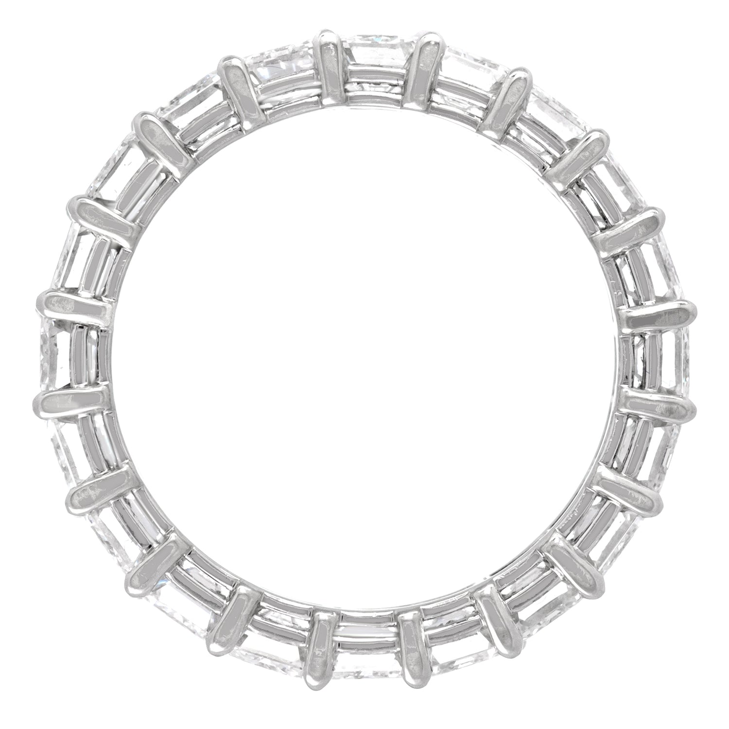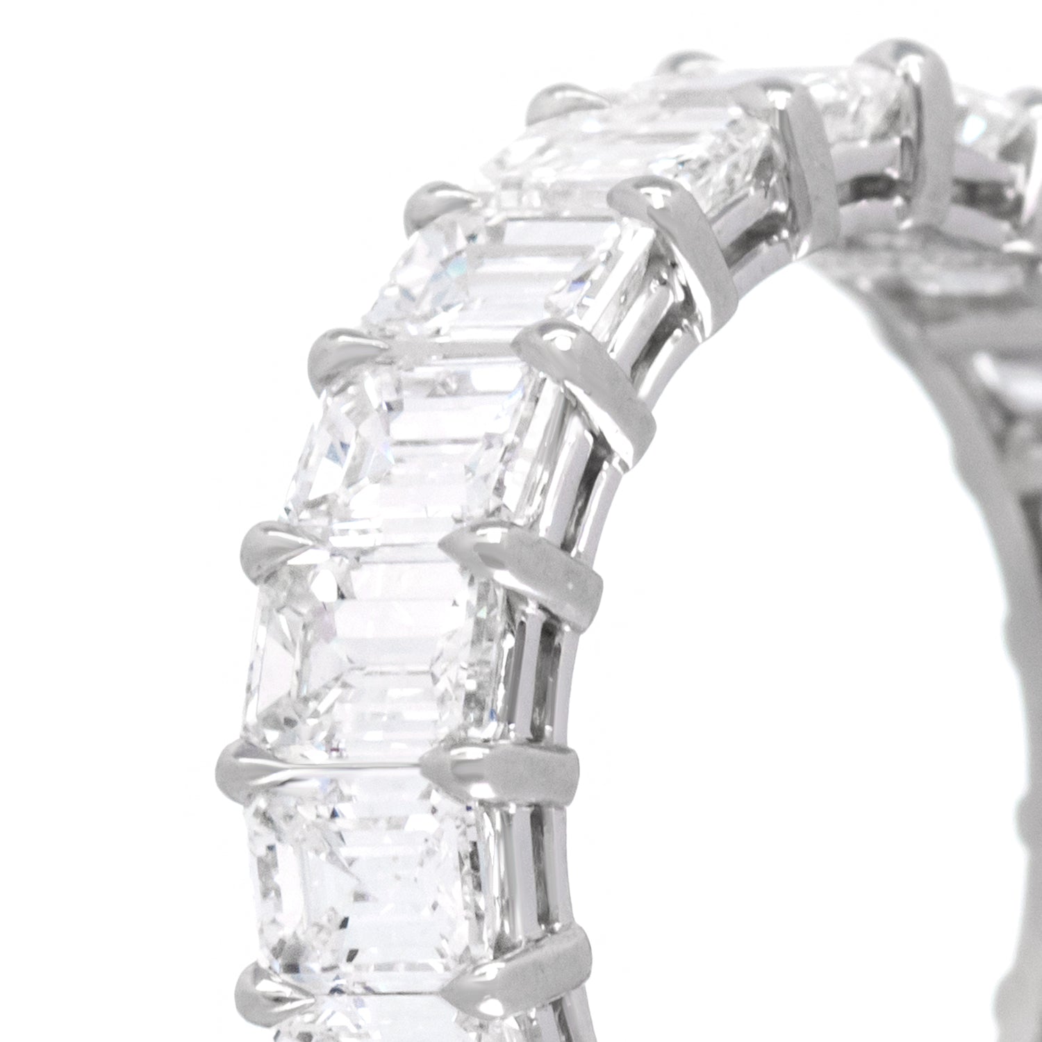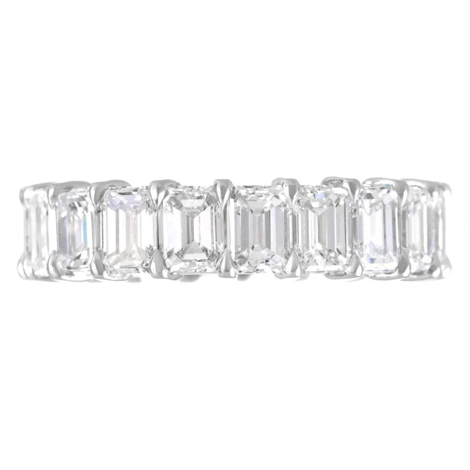 Circa 1990s, Platinum, American. This exquisite diamond eternity band features 5.22 carats of brilliant white diamonds (emerald-cut, F color, VS clarity). Lovely worn alone or picture-perfect paired with an engagement ring, this dazzling band is impeccably made and in excellent condition.